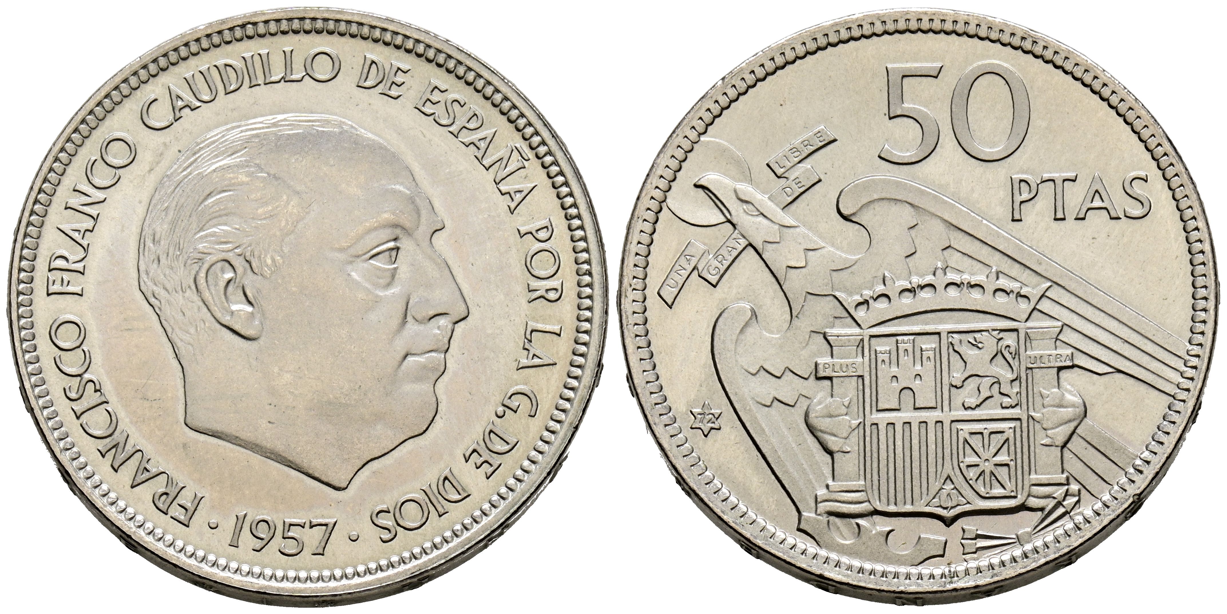 ESTADO ESPAÑOL (1936-1975). 50 Pesetas. (Ni. 12,42g/30mm). 1957 *72. Madrid. (Cal-2019- 141). SC-. Suavemente frotada.