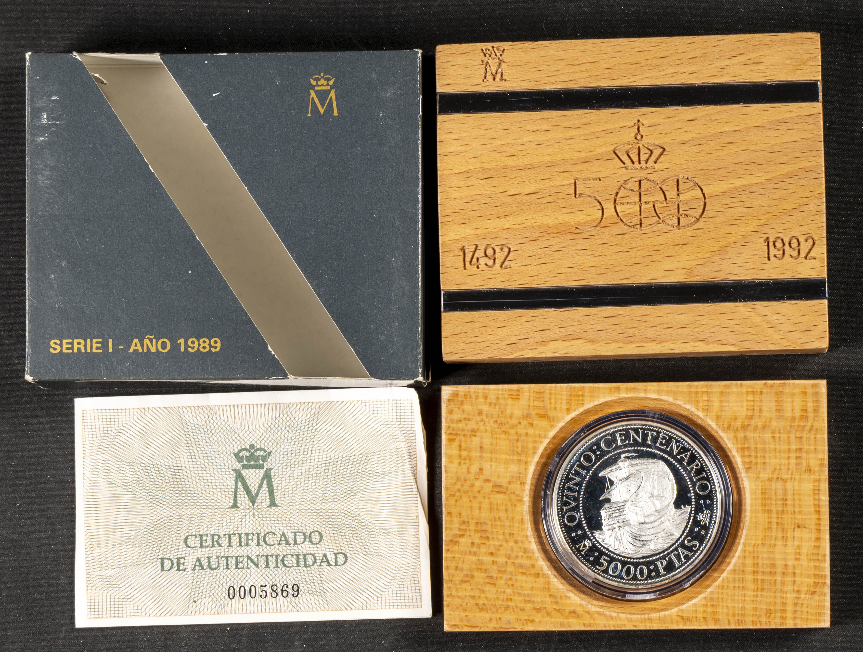 JUAN CARLOS I (1975-2014). 5000 Pesetas. (Ar. 54,00g/40mm). Serie Quinto Centenario. Serie I. 1989. FNMT. PROOF. Presentada en estuche oficial y con certificado de autenticidad.