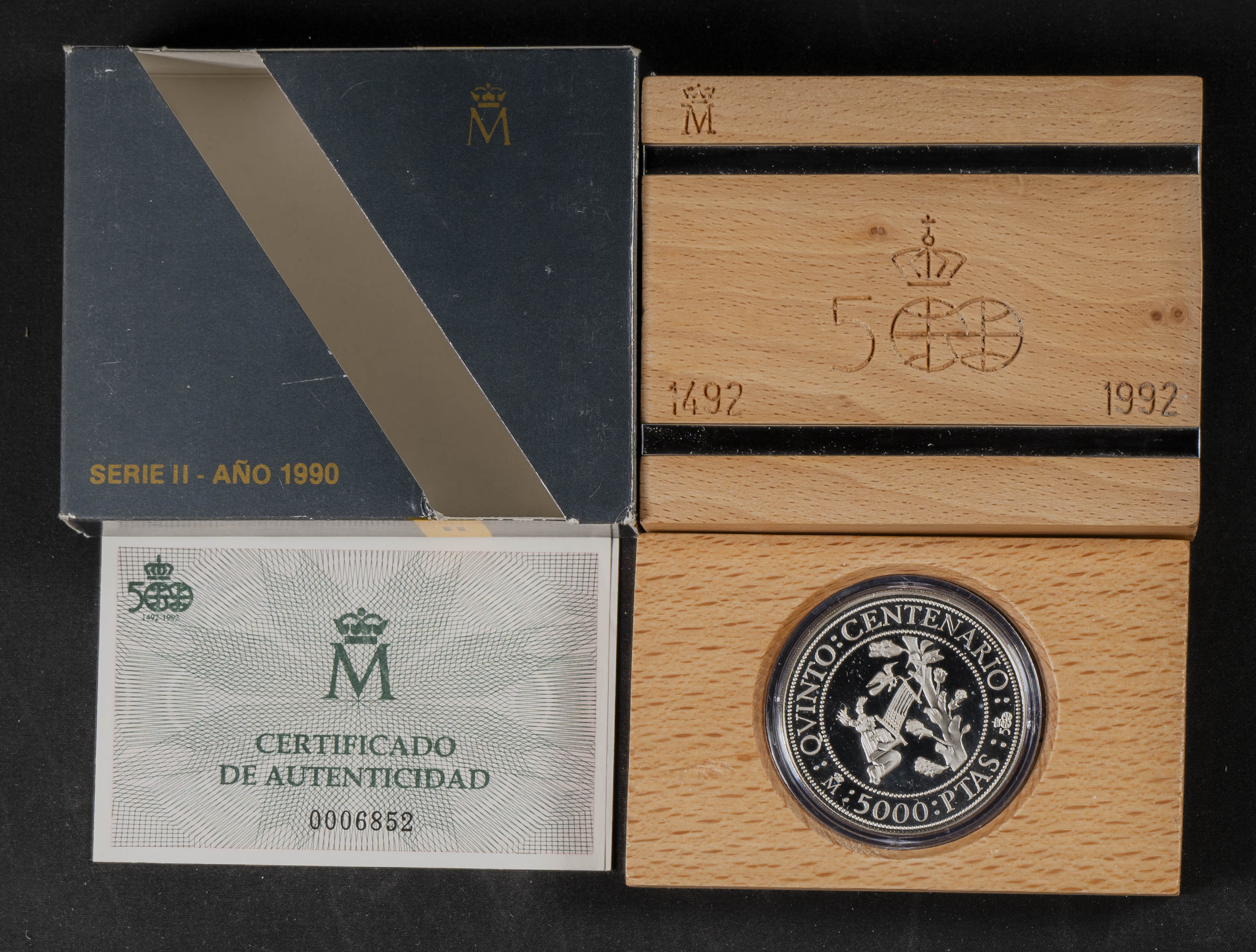 JUAN CARLOS I (1975-2014). 5000 Pesetas. (Ar. 54,00g/40mm). Serie Quinto Centenario. Serie II. 1990. FNMT. PROOF. Presentada en estuche oficial y con certificado de autenticidad.