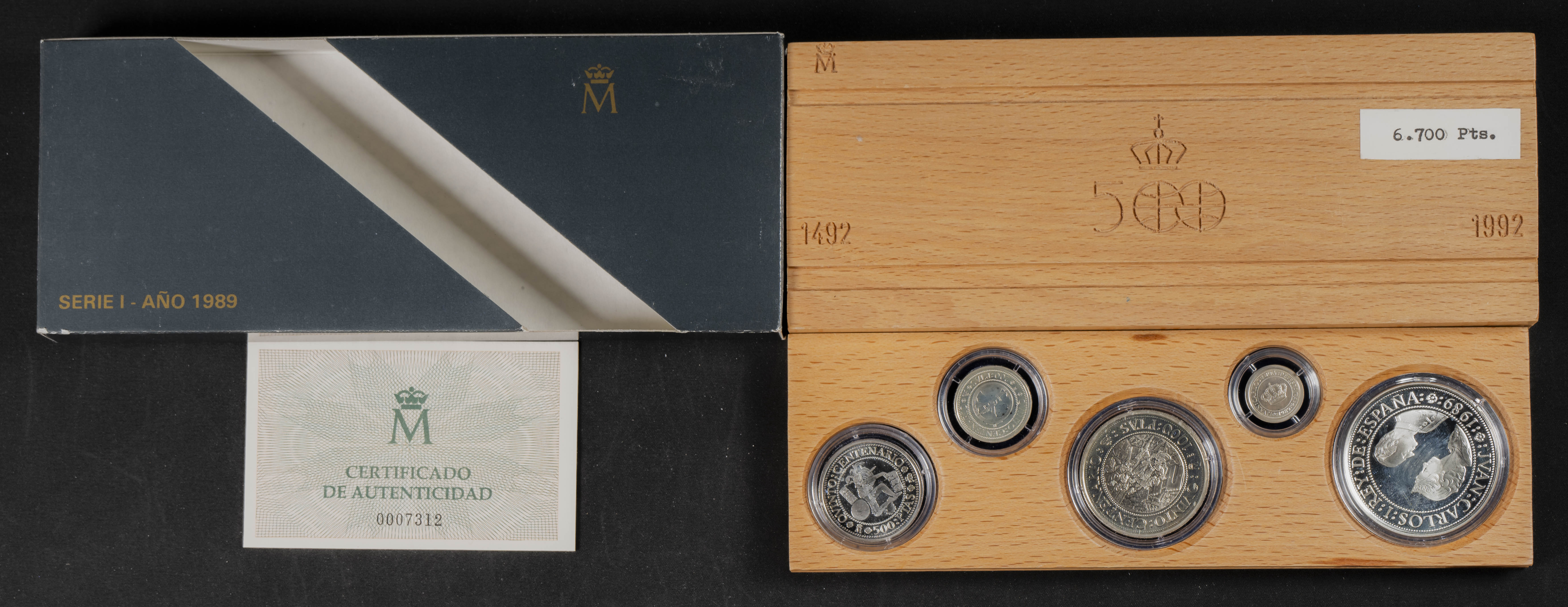 JUAN CARLOS I (1975-2014). Estuche completo compuesto por 5 monedas en plata de valores comprendidos entre 100 y 2000 Pesetas. Quinto Centenario. 1989. Serie I. FNMT. FDC Brillo. Incluye estuche original y certificado de autenticidad.
