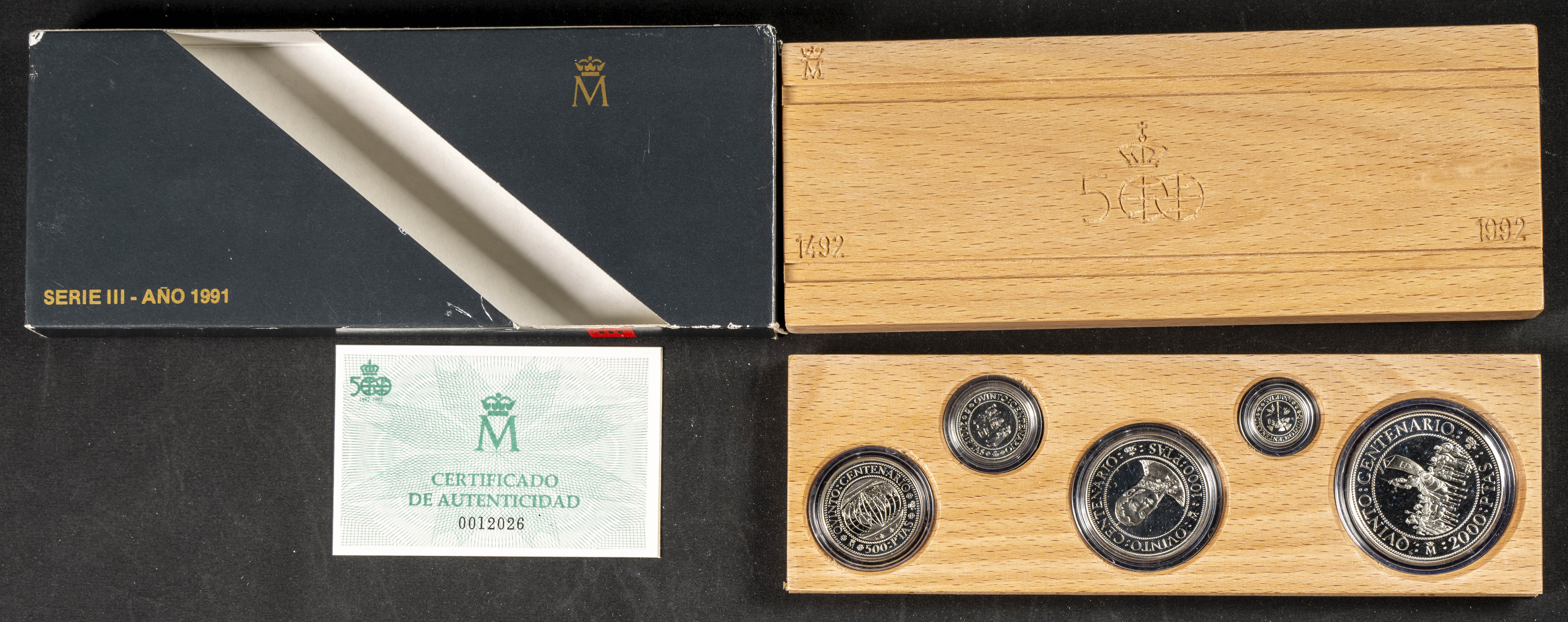 JUAN CARLOS I (1975-2014). Estuche completo compuesto por 5 monedas en plata de valores comprendidos entre 100 y 2000 Pesetas. Quinto Centenario. 1991. Serie III. FNMT. FDC Brillo. Incluye estuche original y certificado de autenticidad.