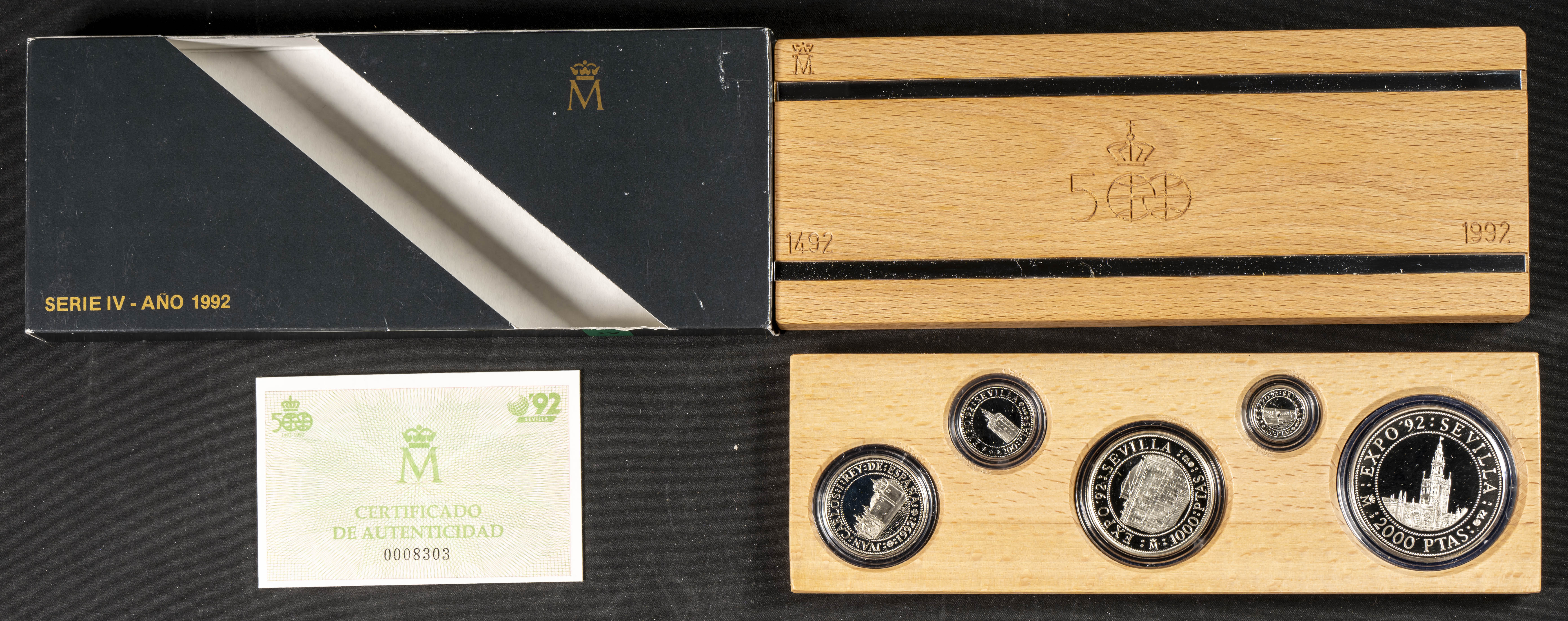 JUAN CARLOS I (1975-2014). Estuche completo compuesto por 5 monedas en plata de valores comprendidos entre 100 y 2000 Pesetas. Quinto Centenario. 1992. Serie IV. FNMT. FDC Mate. Incluye estuche original y certificado de autenticidad.