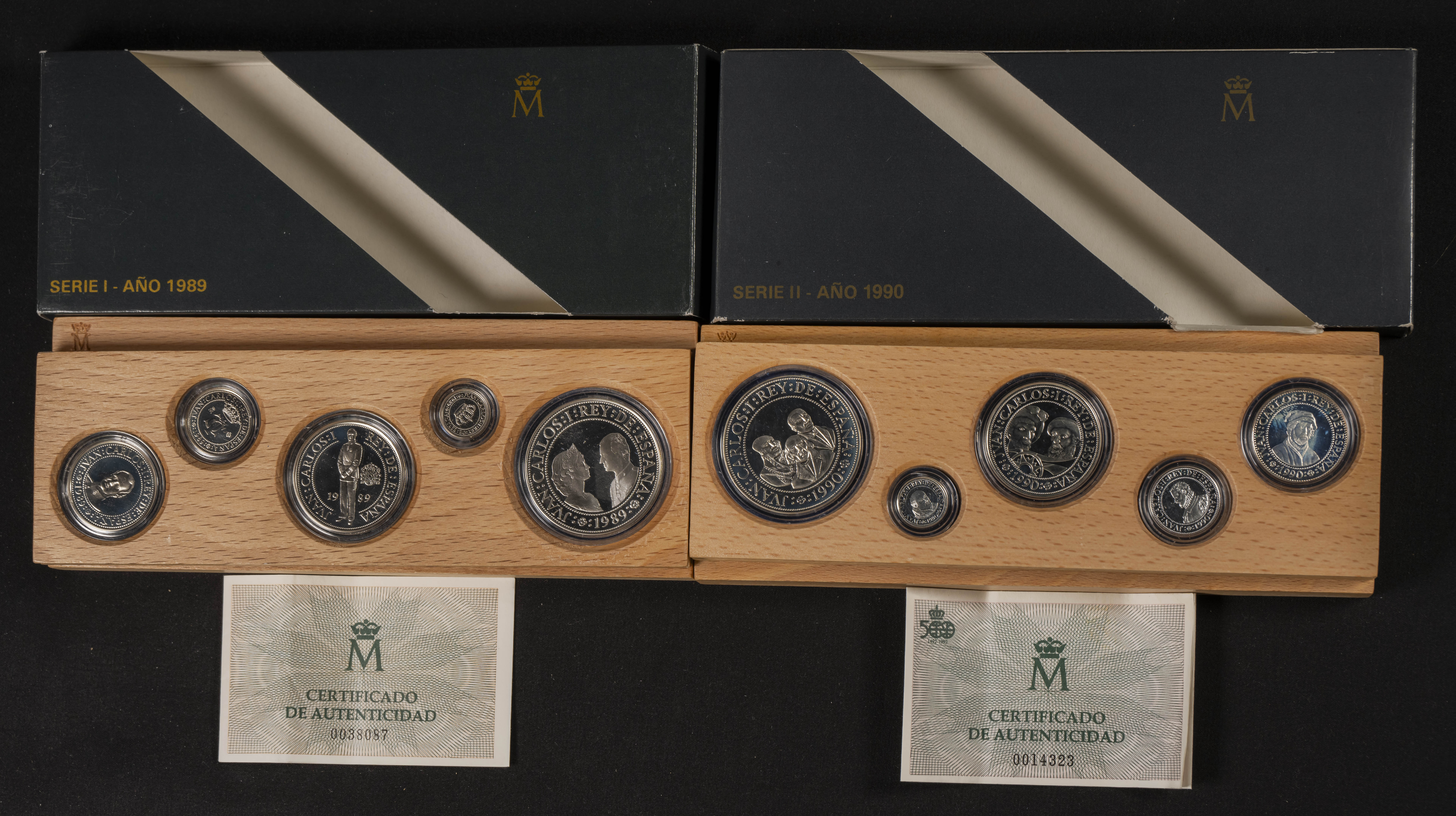 JUAN CARLOS I (1975-2014). Pareja de estuches completo compuesto, cada uno, por 5 monedas en plata de valores comprendidos entre 100 y 2000 Pesetas. Quinto Centenario. 1989 y 1990. Serie I y II. FNMT. FDC brillo. Incluye estuches originales y certificados de autenticidad.