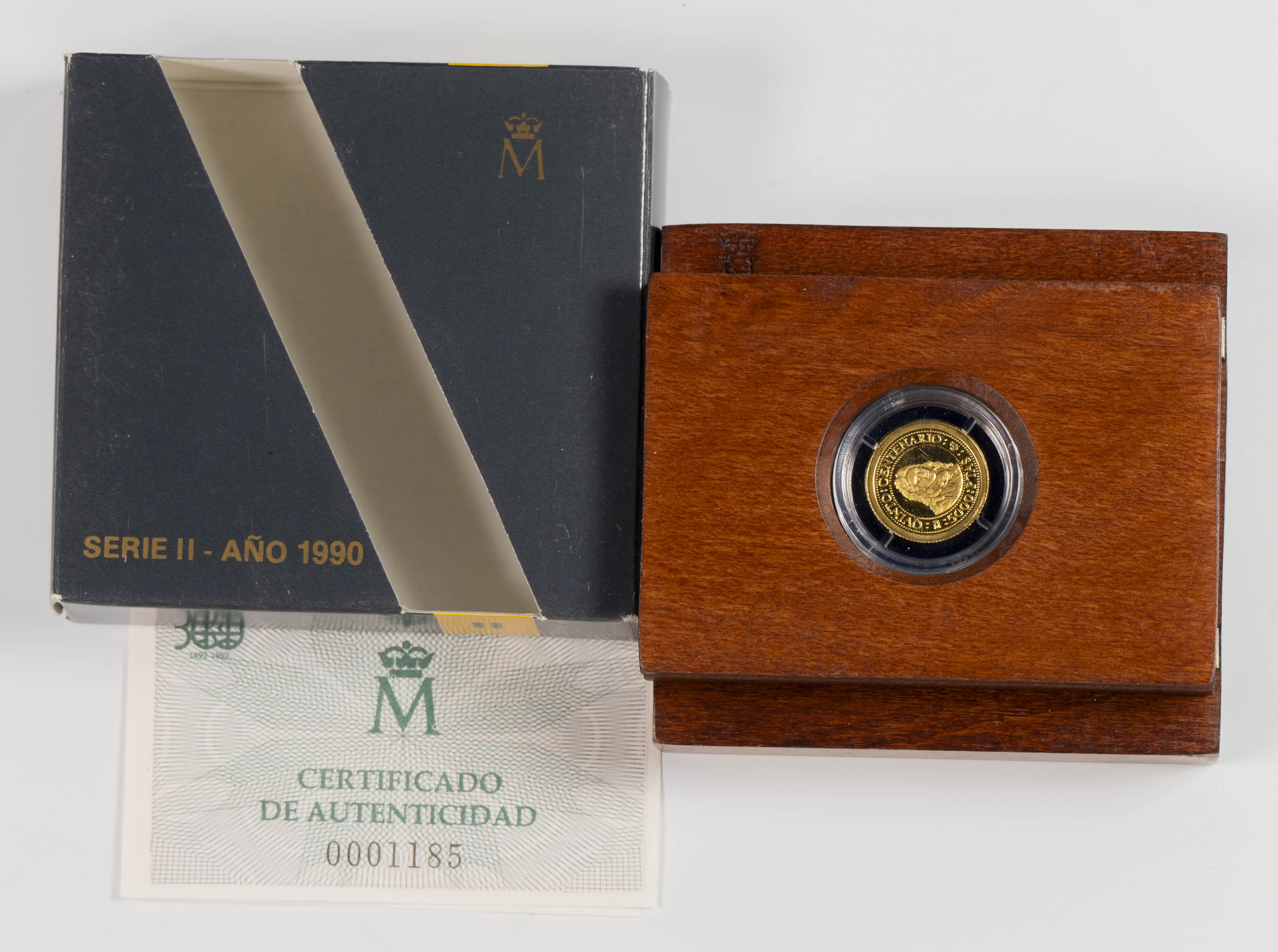 JUAN CARLOS I (1975-2014). 5.000 Pesetas. (Au. 1,68g/15mm). Quinto Centenario. Serie II. 1990. FNMT. PROOF. Presentada en estuche oficial y con certificado de autenticidad.
