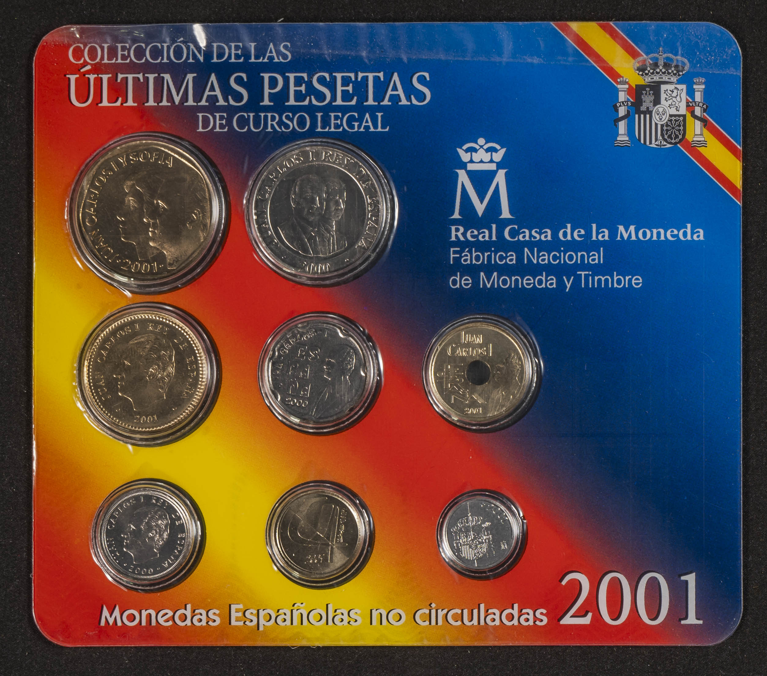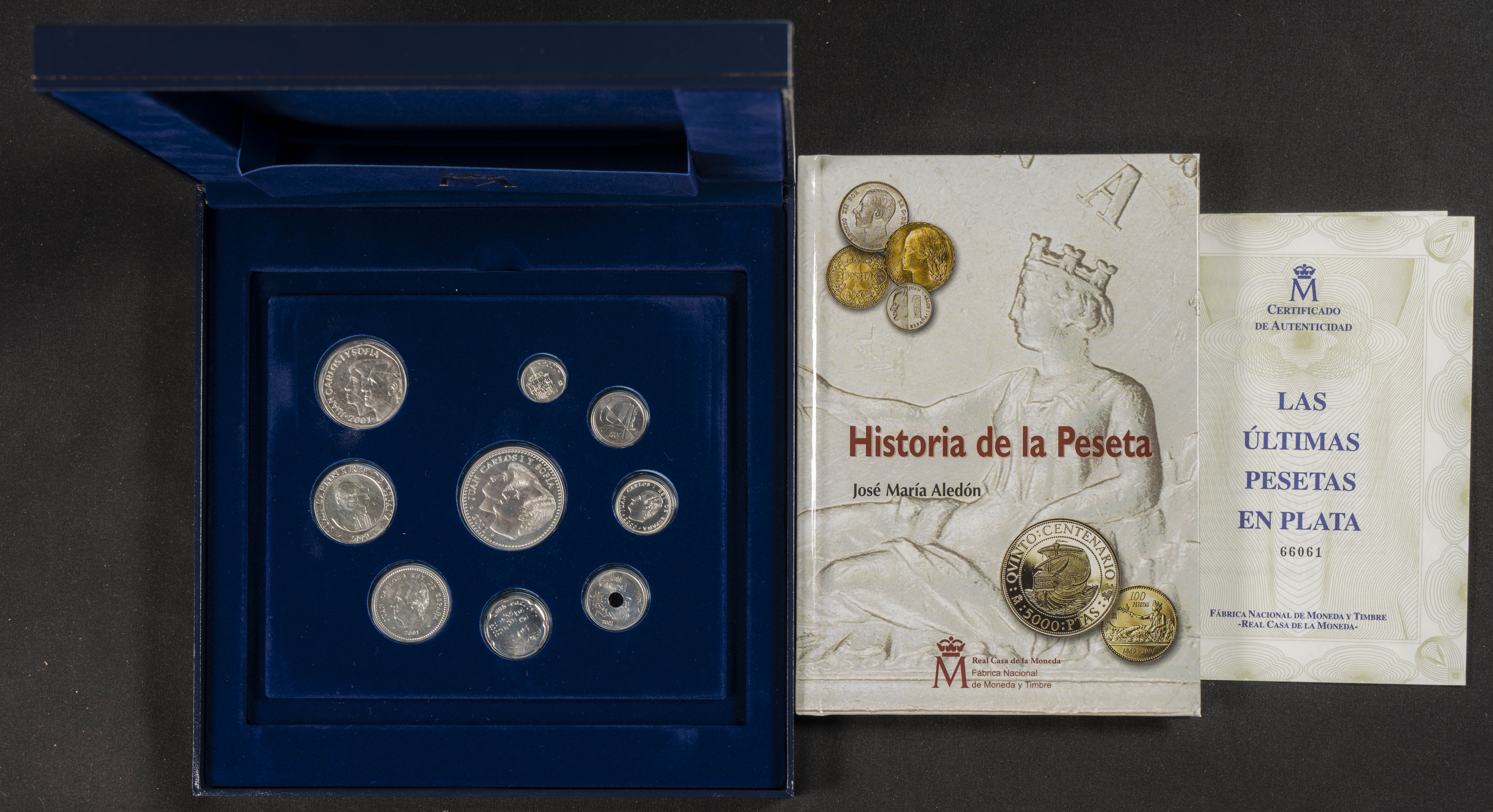 JUAN CARLOS I (1975-2014). Serie completa conmemorativa de Las Últimas Pesetas en Plata. Valores comprendidos entre 1 y 2000 Pesetas. 2000-2001. FNMT. PROOF. Presentadas en estuche oficial, incluyendo certificado y libro de Jose María Aledón: Historia de la Peseta".