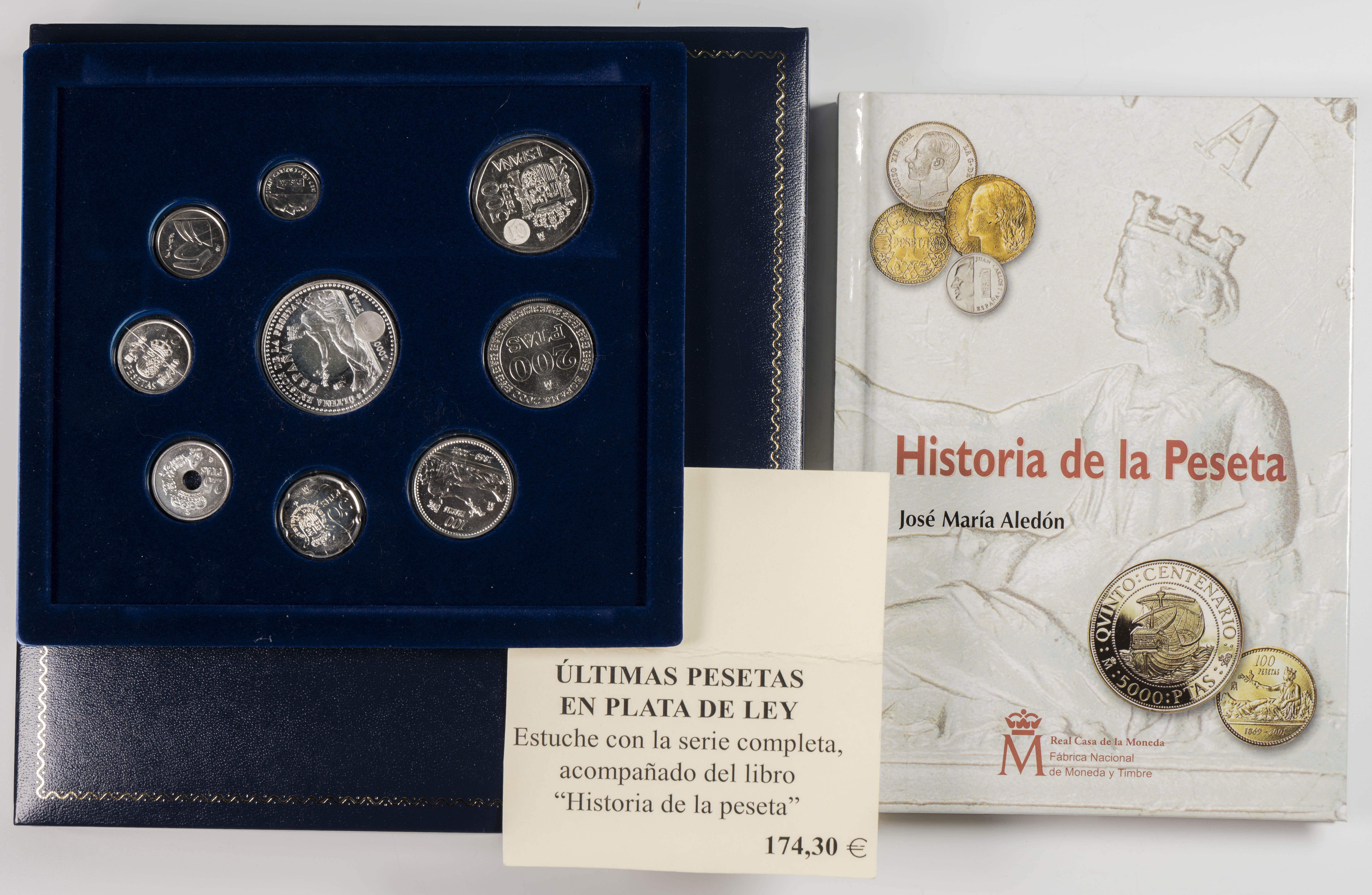 JUAN CARLOS I (1975-2014). Serie completa conmemorativa de Las Últimas Pesetas en Plata. Valores comprendidos entre 1 y 2000 Pesetas. 2000-2001. FNMT. PROOF. Presentadas en estuche oficial, incluyendo libro de Jose María Aledón: "Historia de la Peseta".