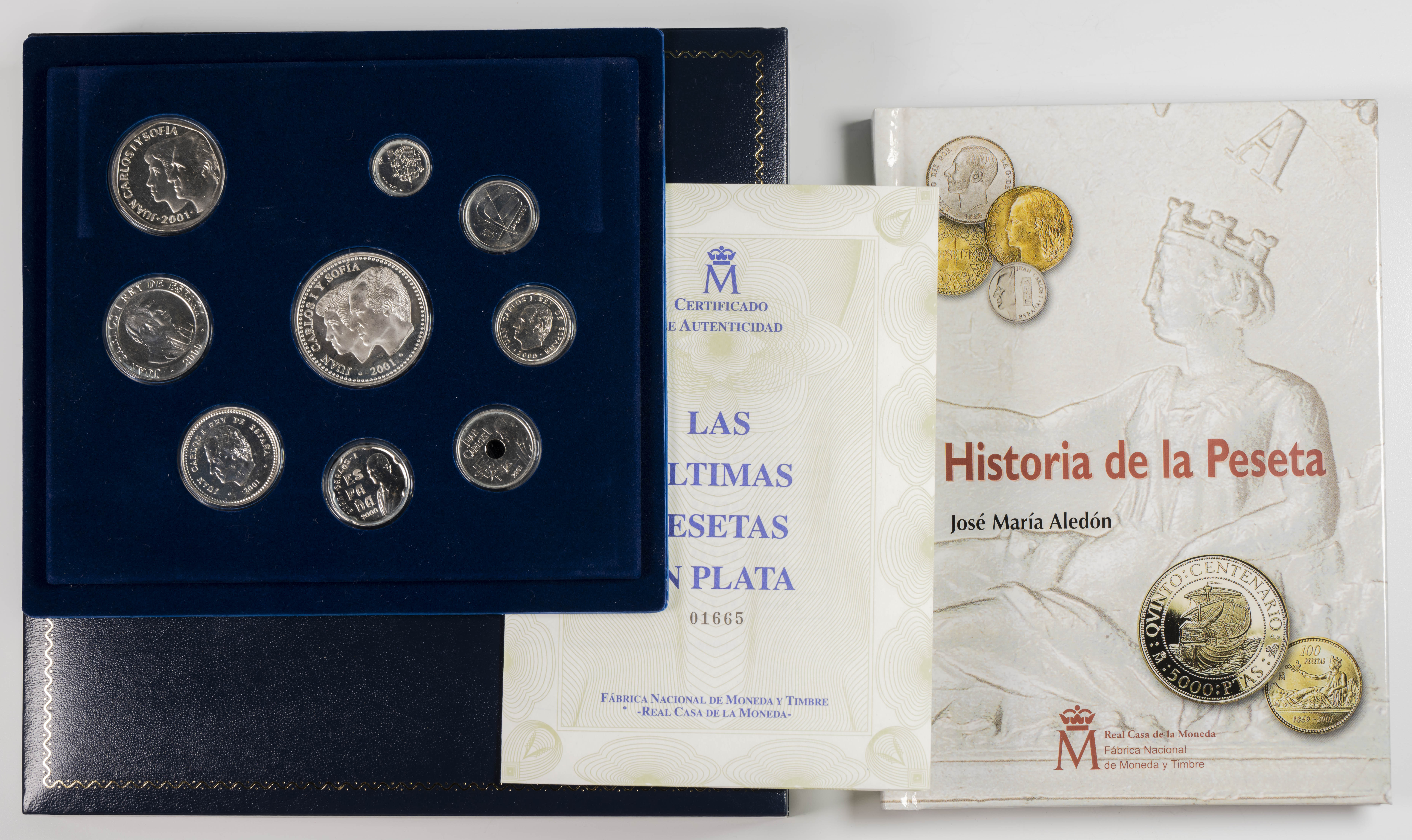 JUAN CARLOS I (1975-2014). Serie completa conmemorativa de Las Últimas Pesetas en Plata. Valores comprendidos entre 1 y 2000 Pesetas. 2000-2001. FNMT. PROOF. Presentadas en estuche oficial, incluyendo certificado y libro de Jose María Aledón: Historia de la Peseta."