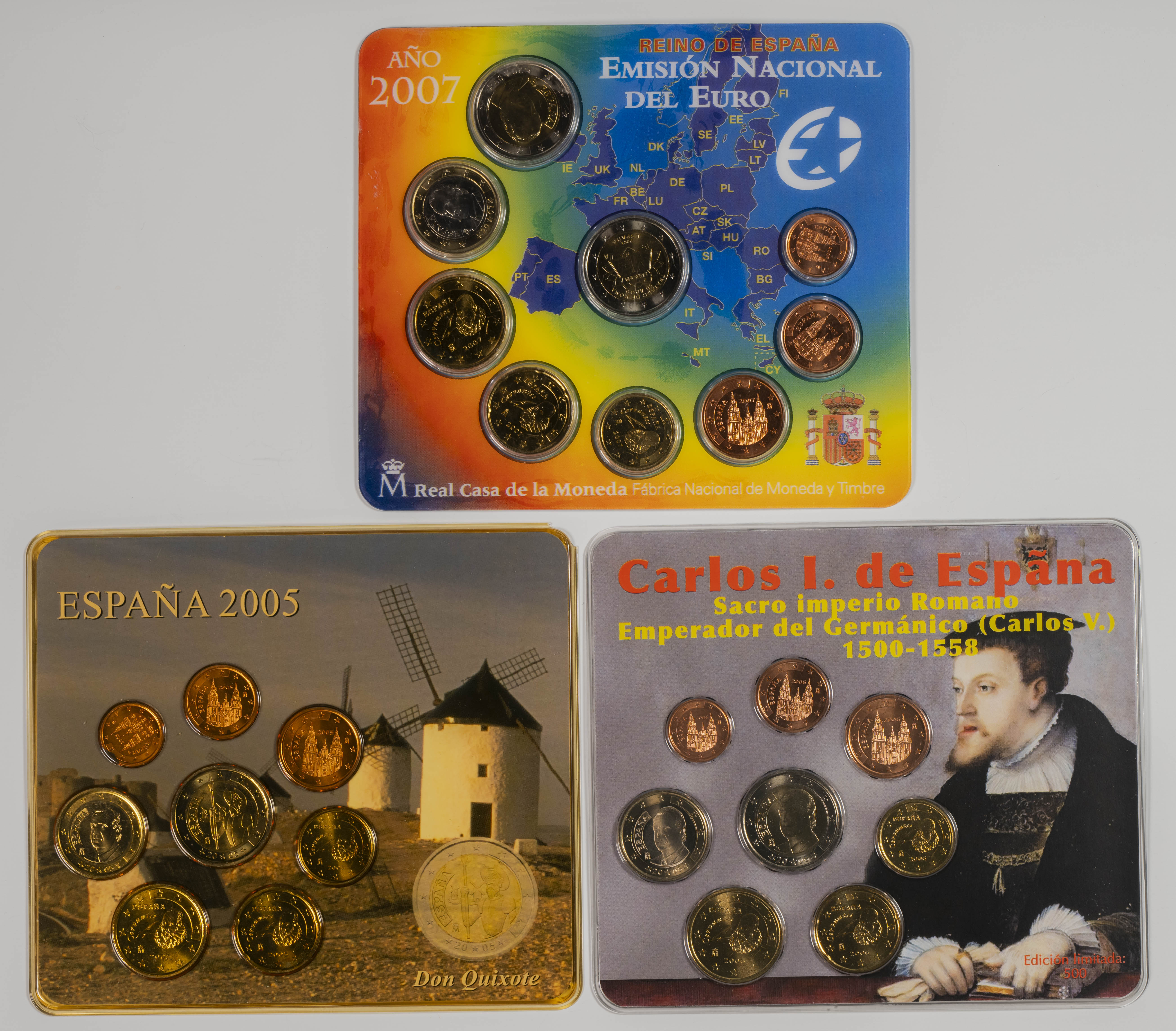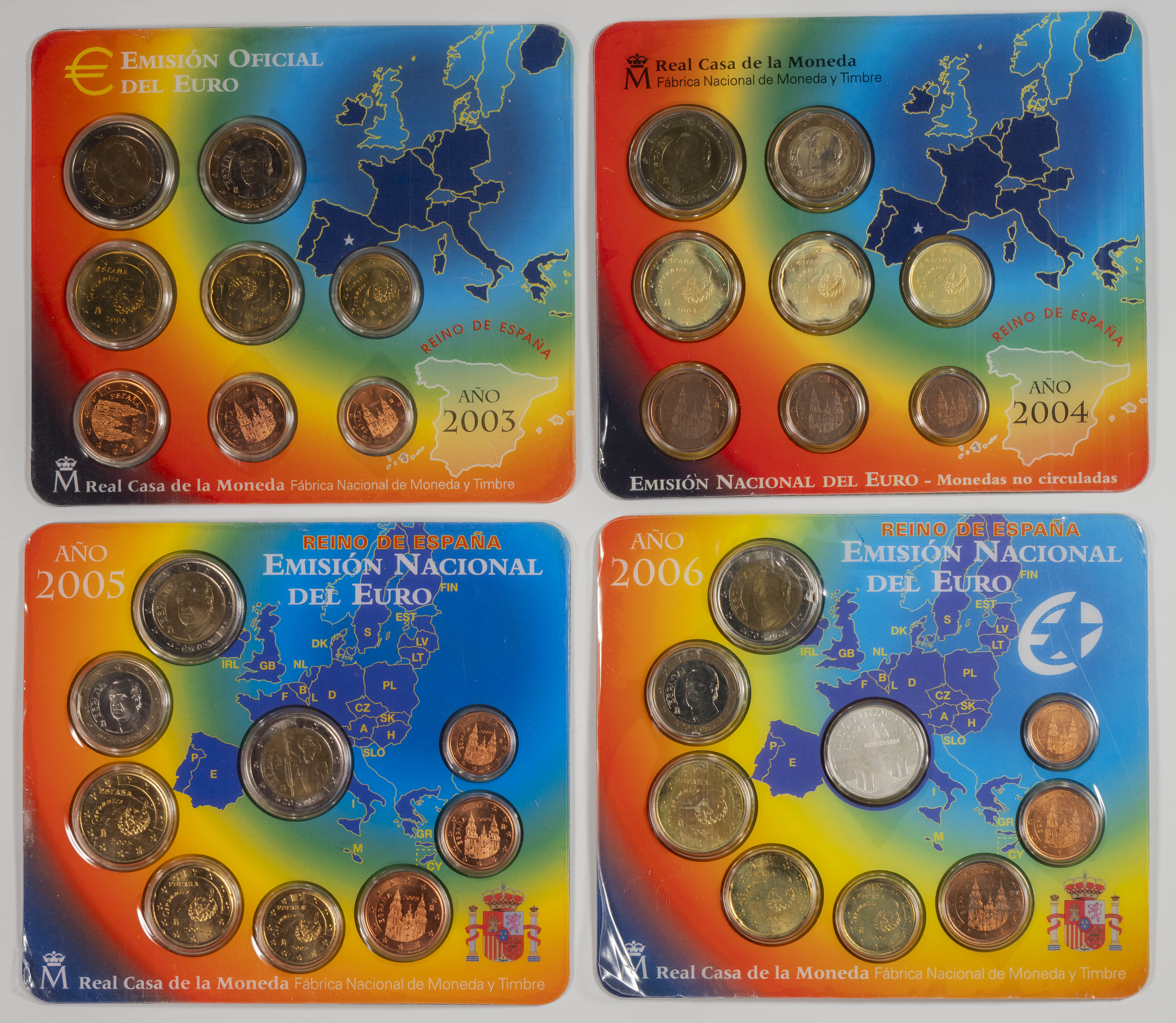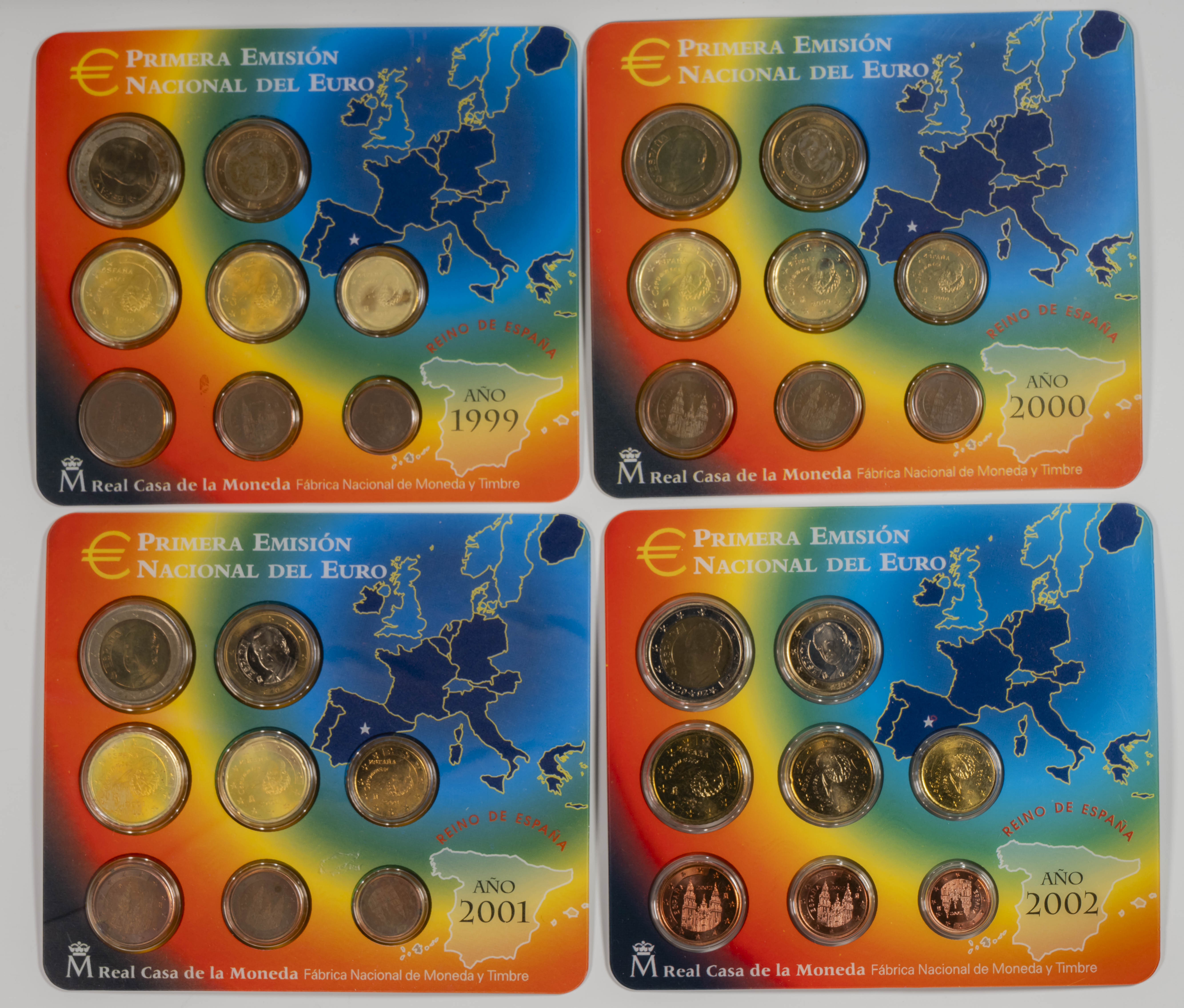 JUAN CARLOS I (1975-2014). Conjunto de 11 blíster completos con fechas correlativas y comprendidas entre 1999 y 2007. Incluye dos ediciones limitadas de 500 ejemplares correspondientes a 2005 (Don Quijote) y 2006 (Carlos V) además del especial de 2006 que incluye medalla de plata. SC.
