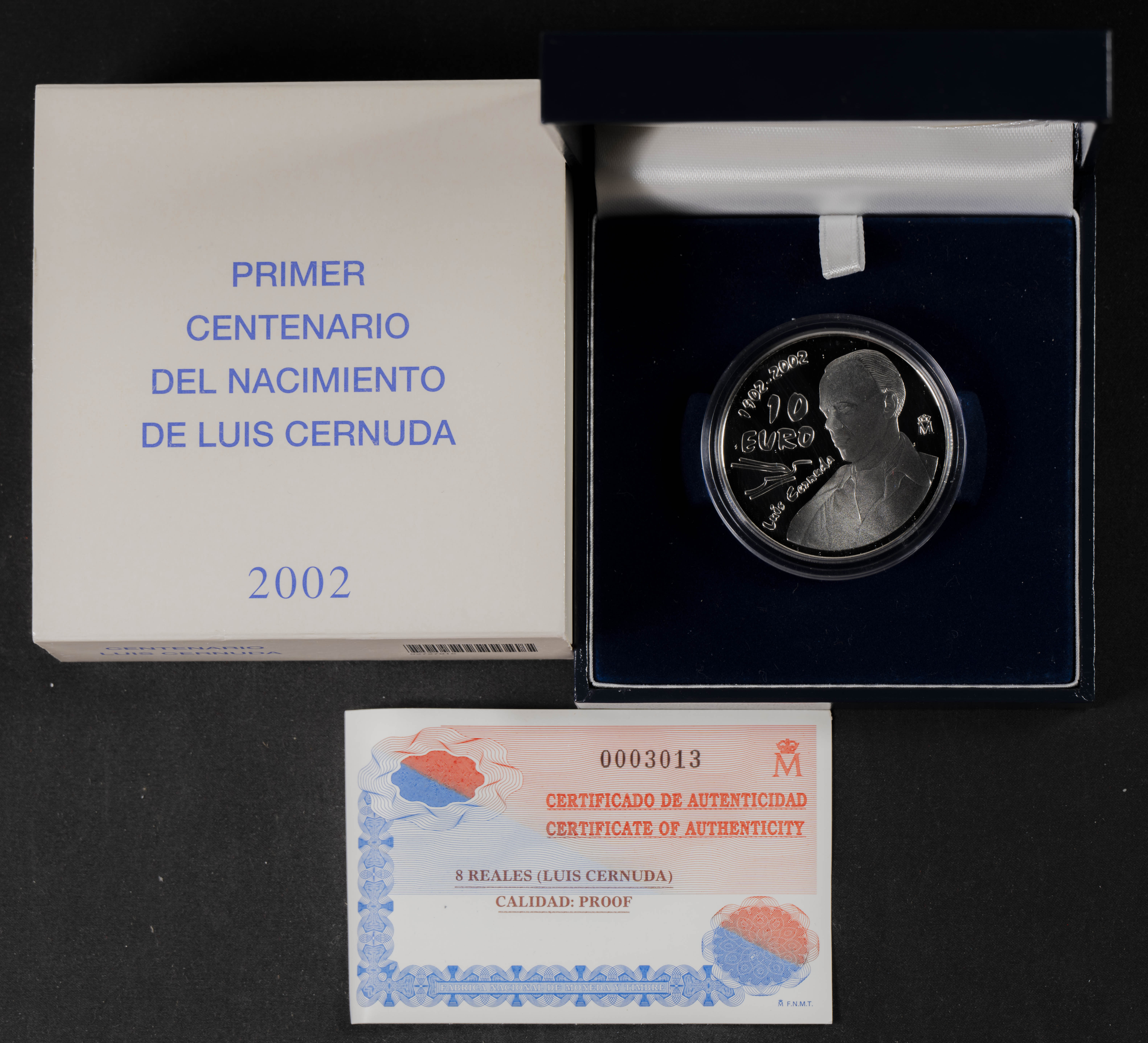 JUAN CARLOS I (1975-2014). 10 Euros. (Ar. 27,00g/40mm). Primer Centenario del Nacimiento de Luis Cernuda. 2002. FNMT. PROOF. Incluye estuche original y certificado de autenticidad. Tirada de 25.000 unidades.