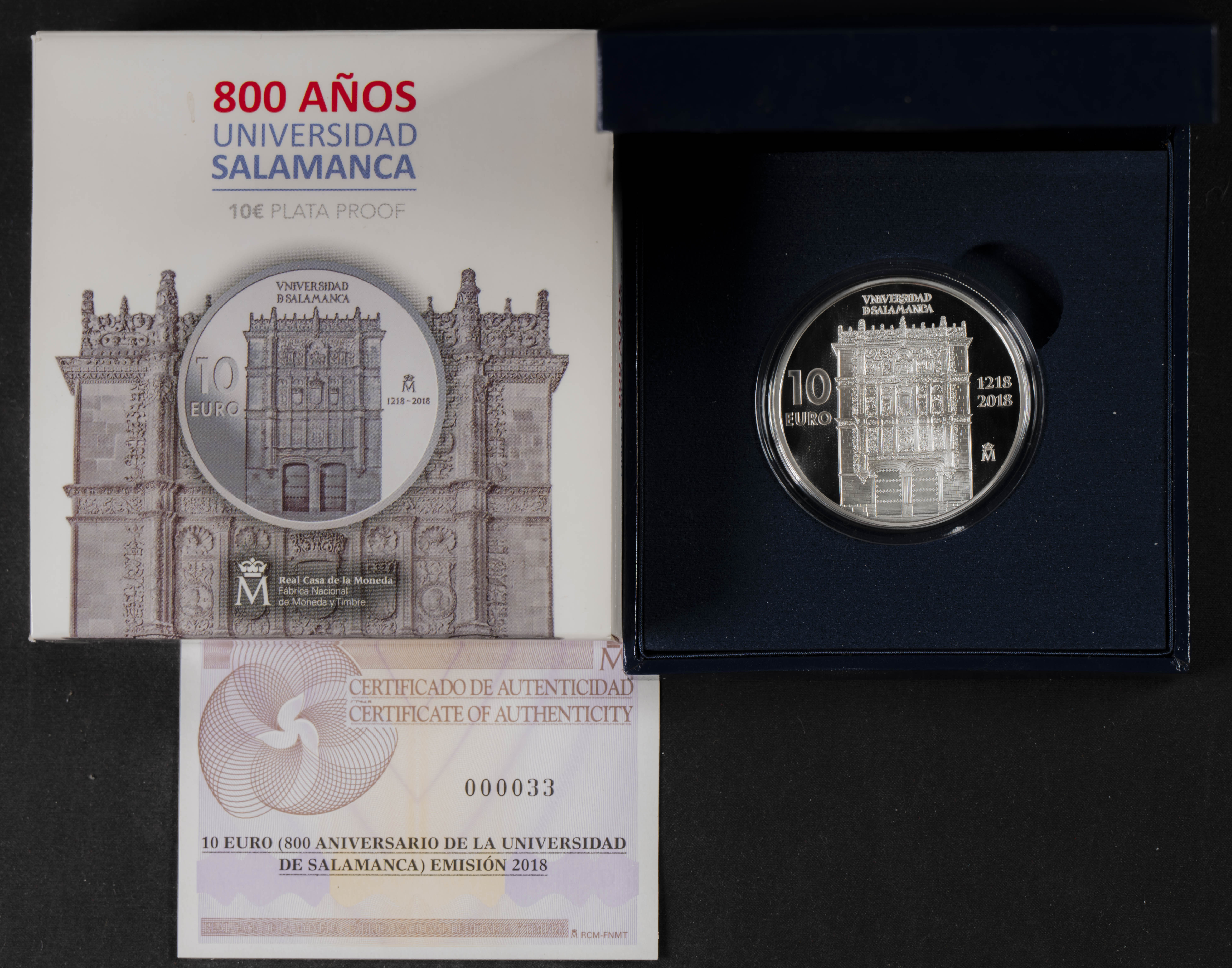 FELIPE VI (2014-?). 10 Euros. (Ar. 27,00g/40mm). 800 Años Universidad de Salamanca. 2018. FNMT. PROOF. Incluye estuche original y certificado de autenticidad. Tirada de 6000 unidades.