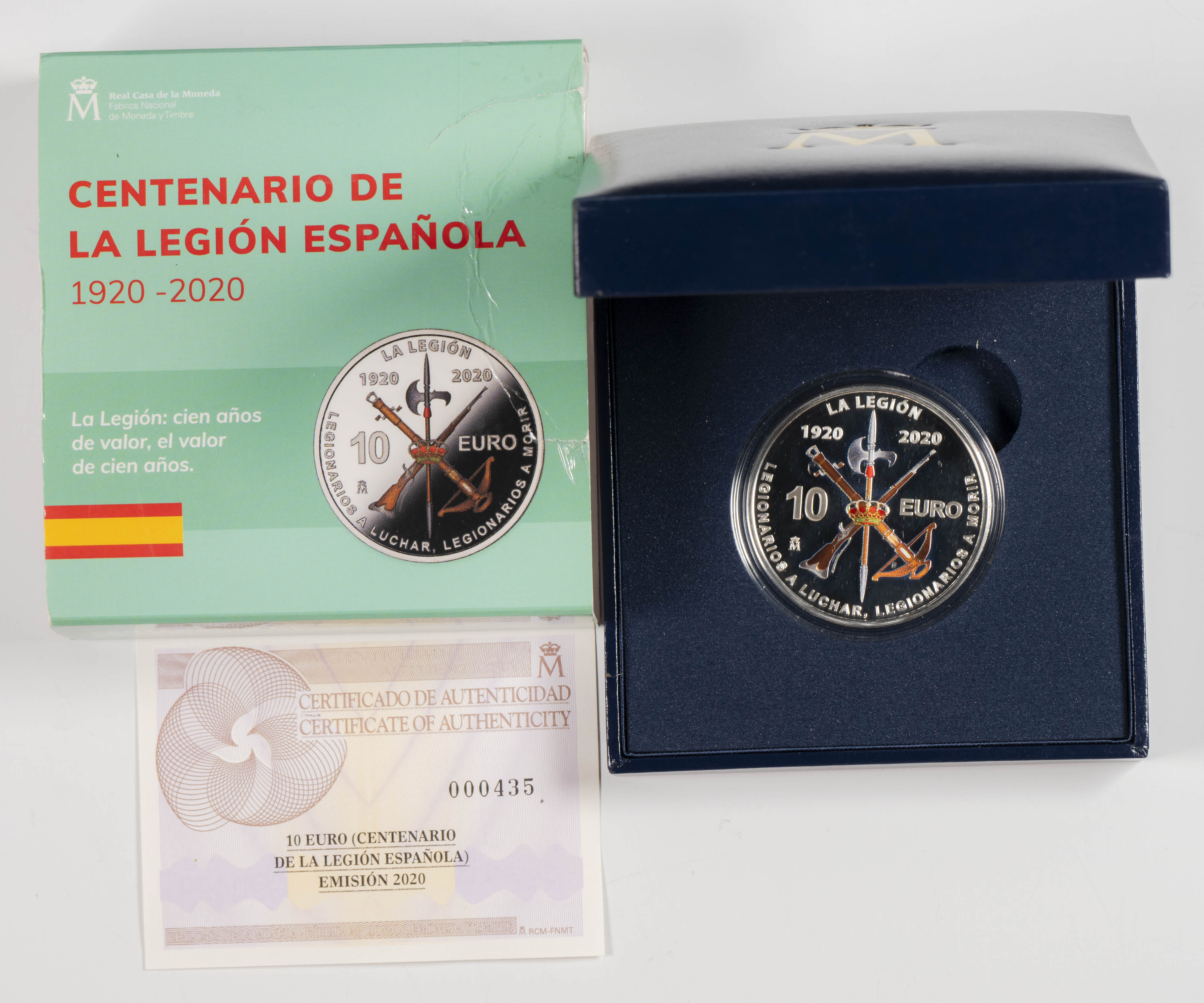 FELIPE VI (2014-?). 10 Euros. (Ar. 26,95g/40mm). Centenario de la Legión Española. 2020. FNMT. PROOF. Incluye estuche original y certificado de autenticidad. Tirada de sólo 6.000 unidades.