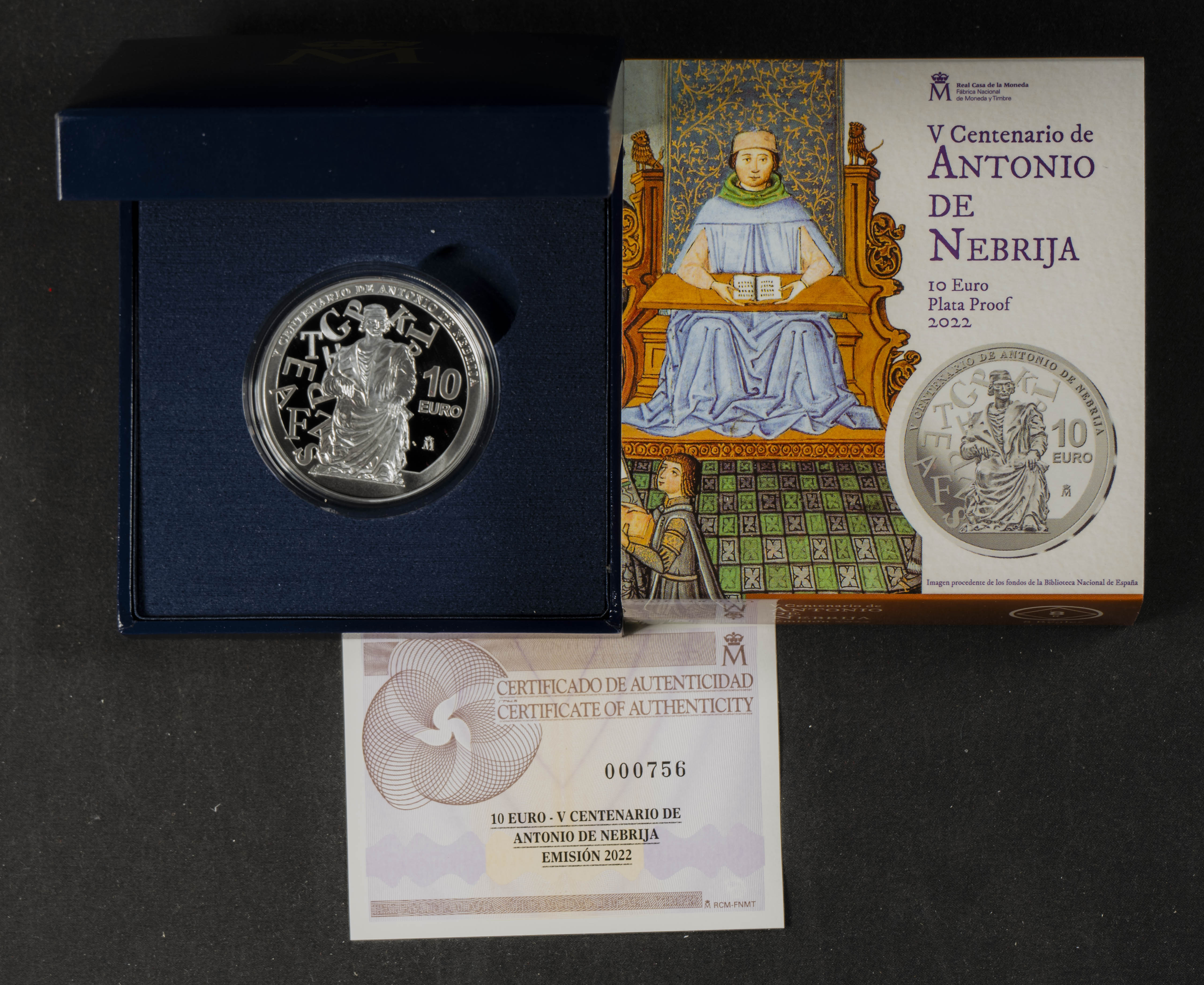 FELIPE VI (2014-?). 10 Euros. (Ar. 27,00g/40mm). V Centenario de Antonio de Nebrija. 2022. FNMT. PROOF. Incluye estuche original y certificado de autenticidad. Tirada de 7000 unidades.