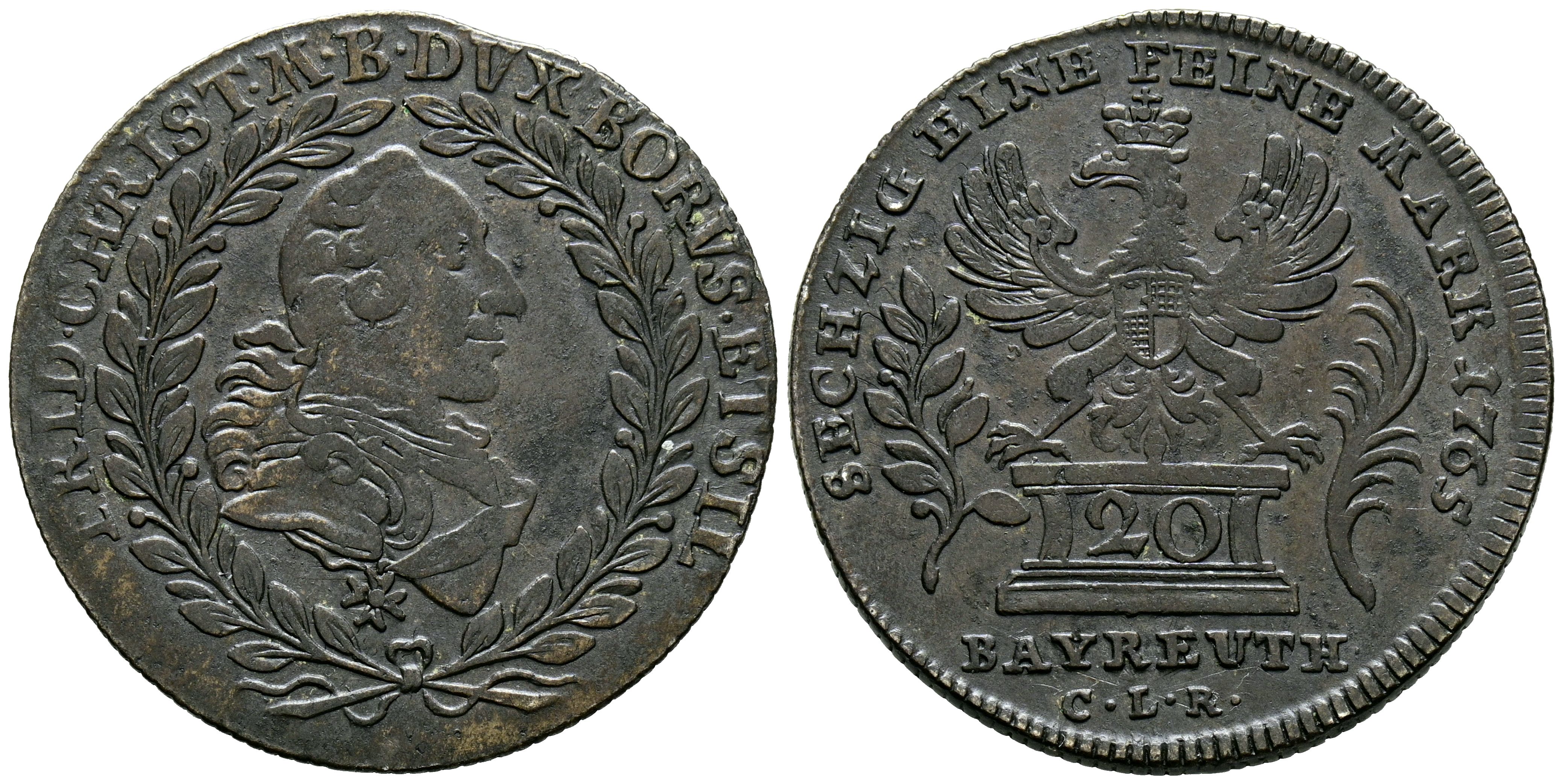ALEMANIA, Friedrich Christian. 20 Kreuzer. (Ar. 6,50g/29mm). 1765. Brandenburg-Bayreuth. (Km#236). MBC+. Pátina oscura.