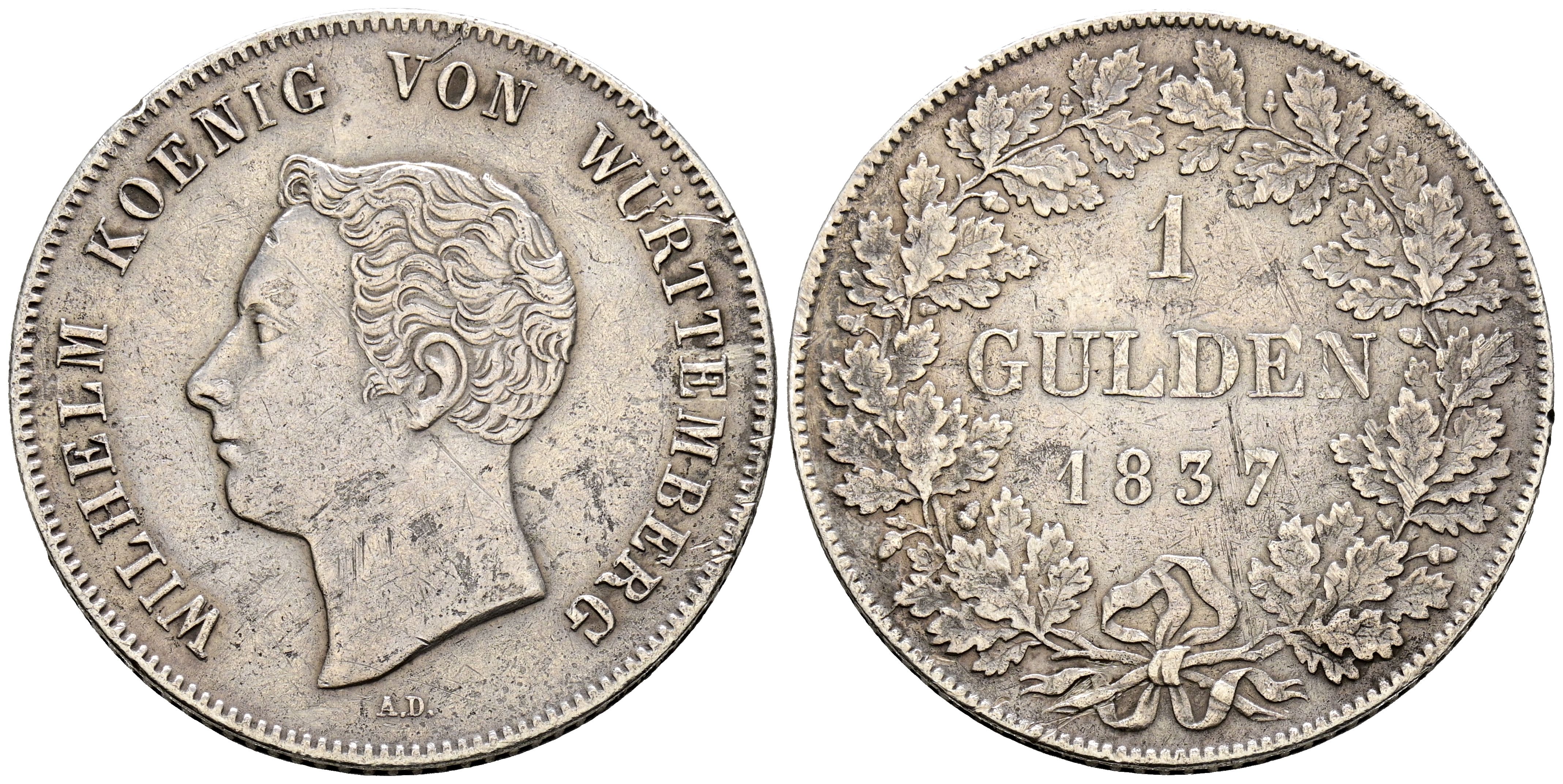 ALEMANIA. 1 Gulden (Ar. 10,52g/30mm). 1837. Wilhelm I. Reino de Wurtemberg. (Km#575). MBC.