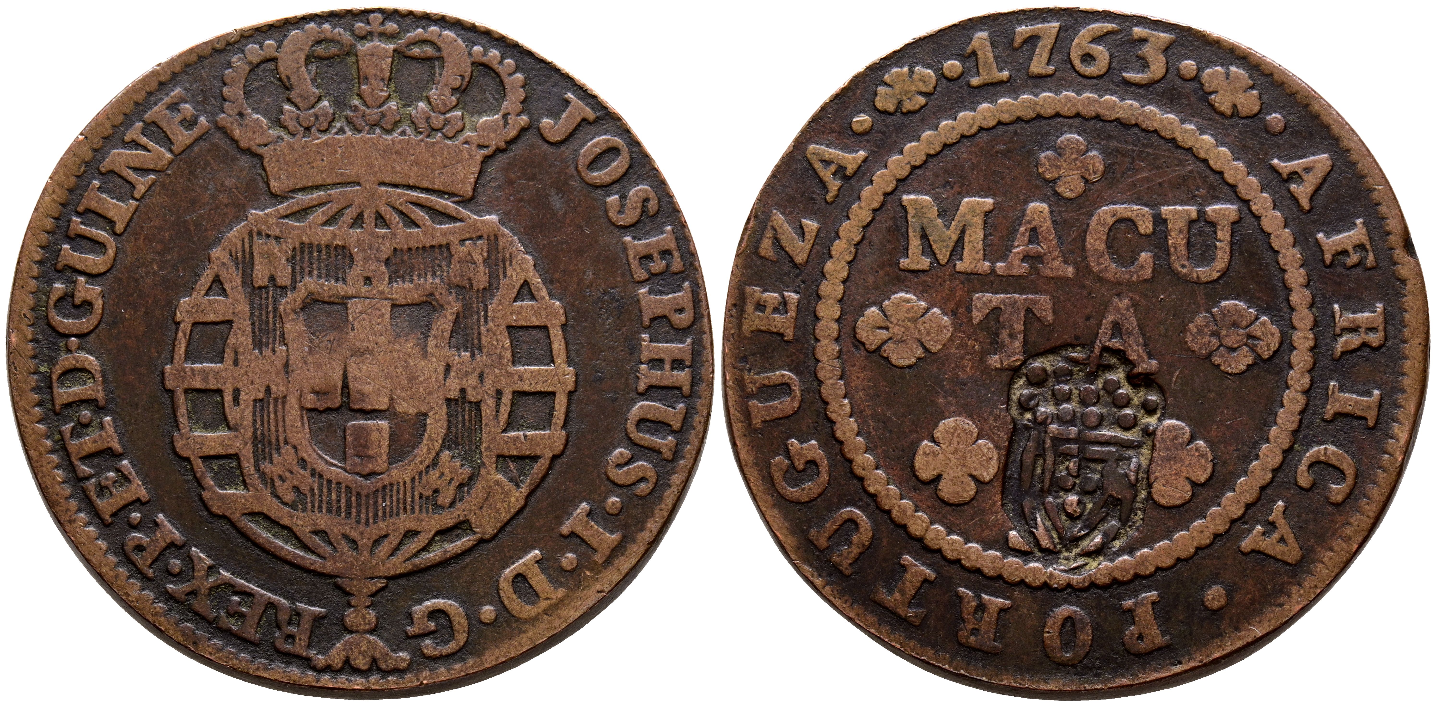 ANGOLA (Portuguesa), José I. Macuta. (Ae. 34,94g/42m). 1763. Resello bajo el reinado de María II (1834-1853). (Gomes 05.02). MBC.