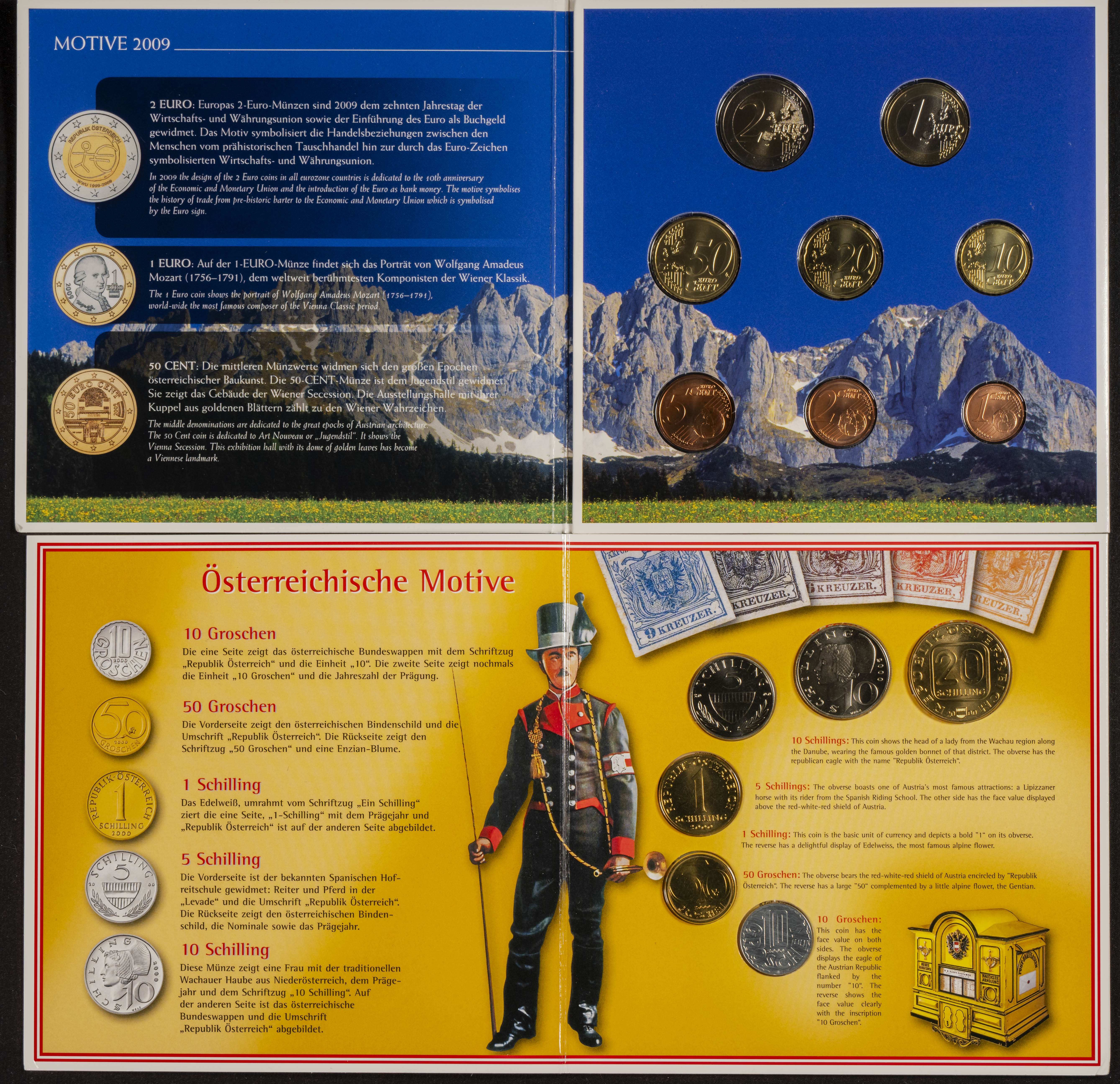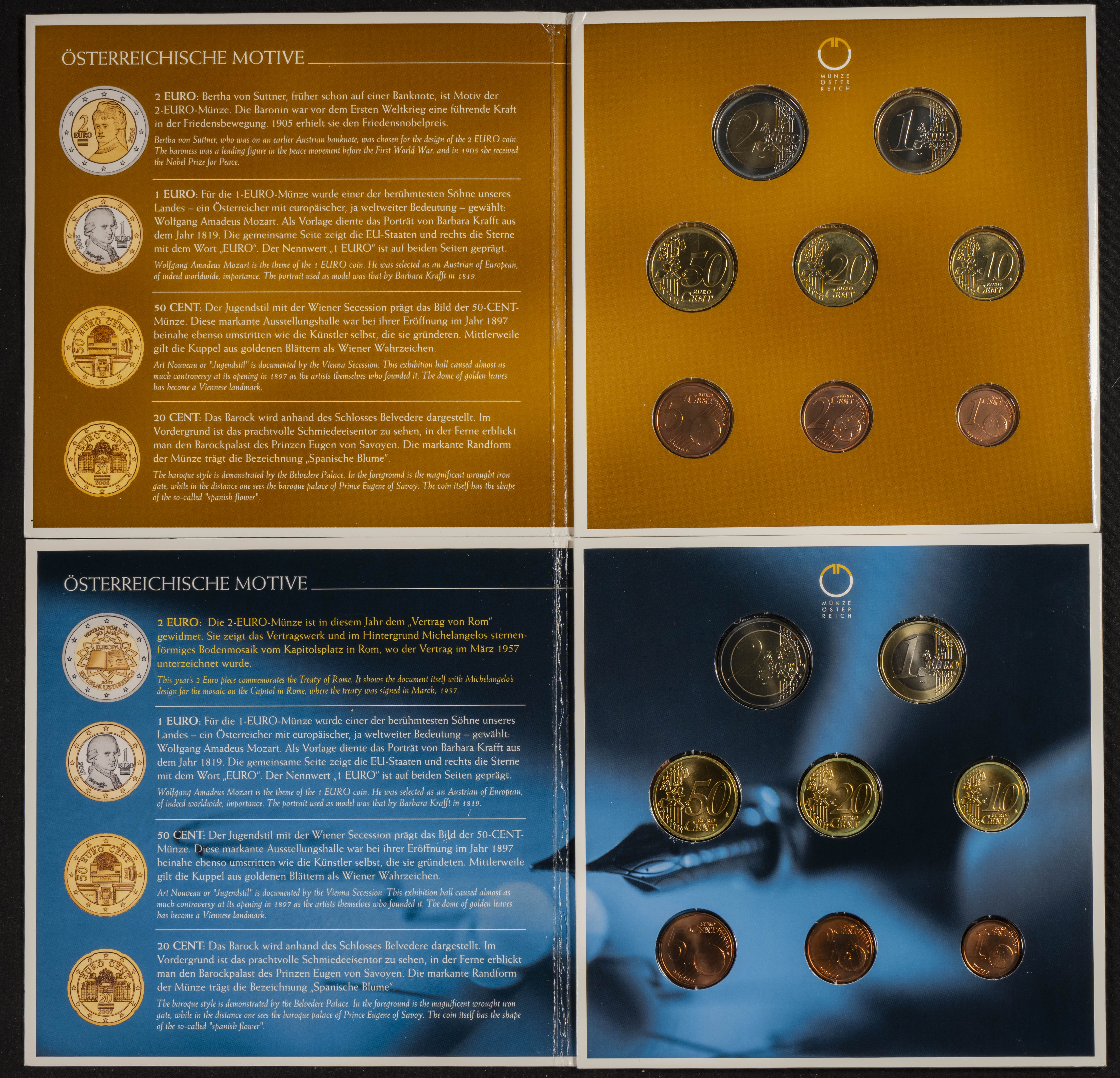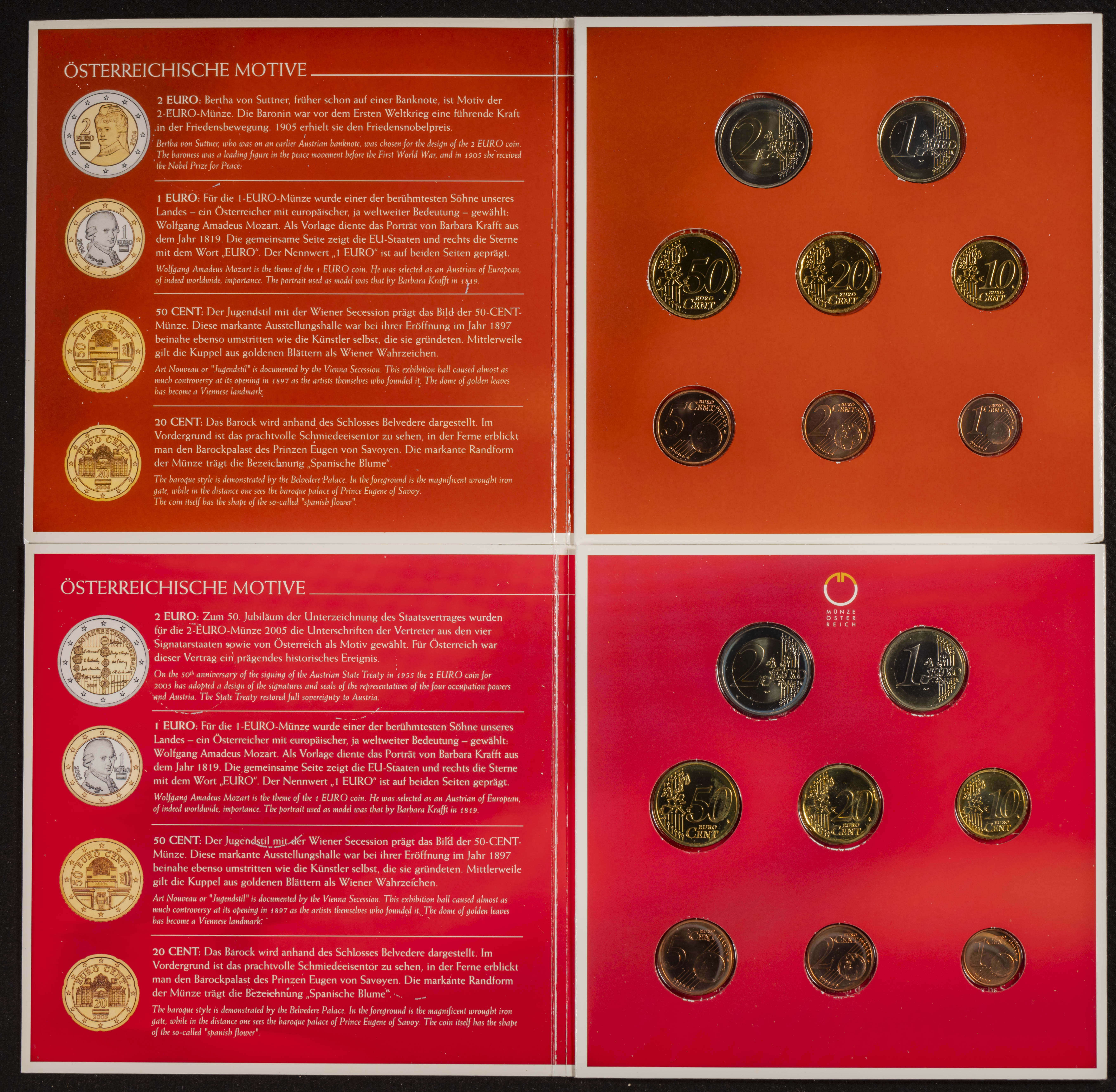 AUSTRIA. Conjunto de 12 sets completos con acuñaciones comprendidas entre el año 2000-2001 (últimas acuñaciones de Chelines) y 2009 (euros). Incluye series conmemorativas. Ningún set repetido. SC.