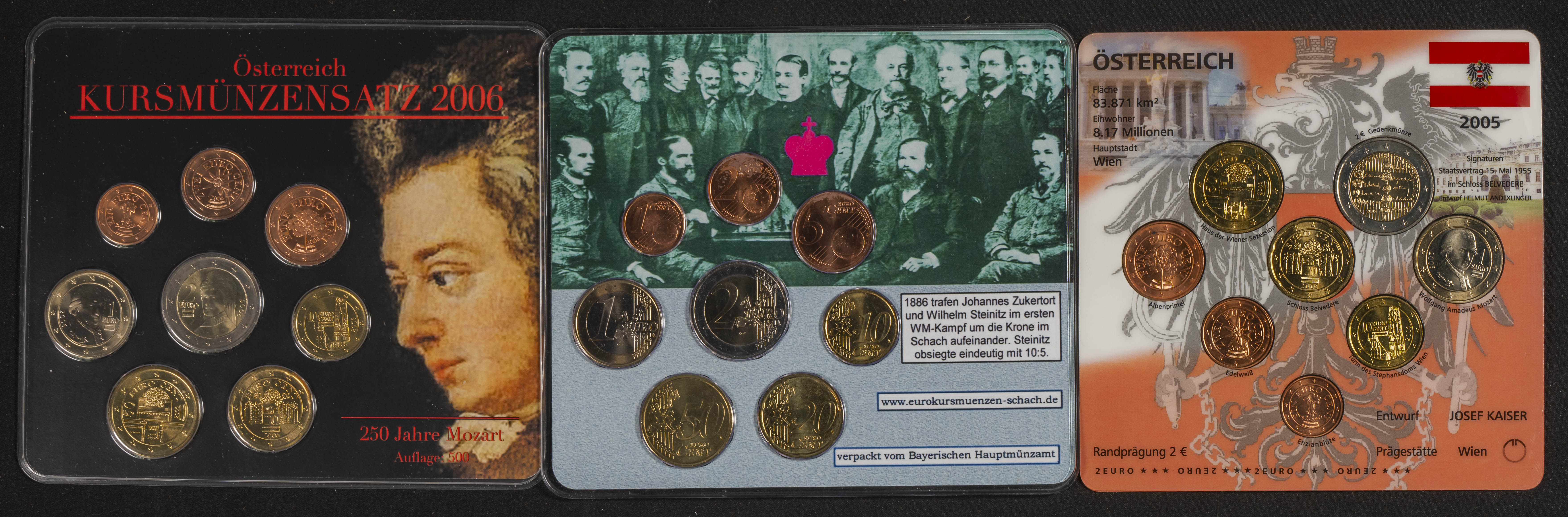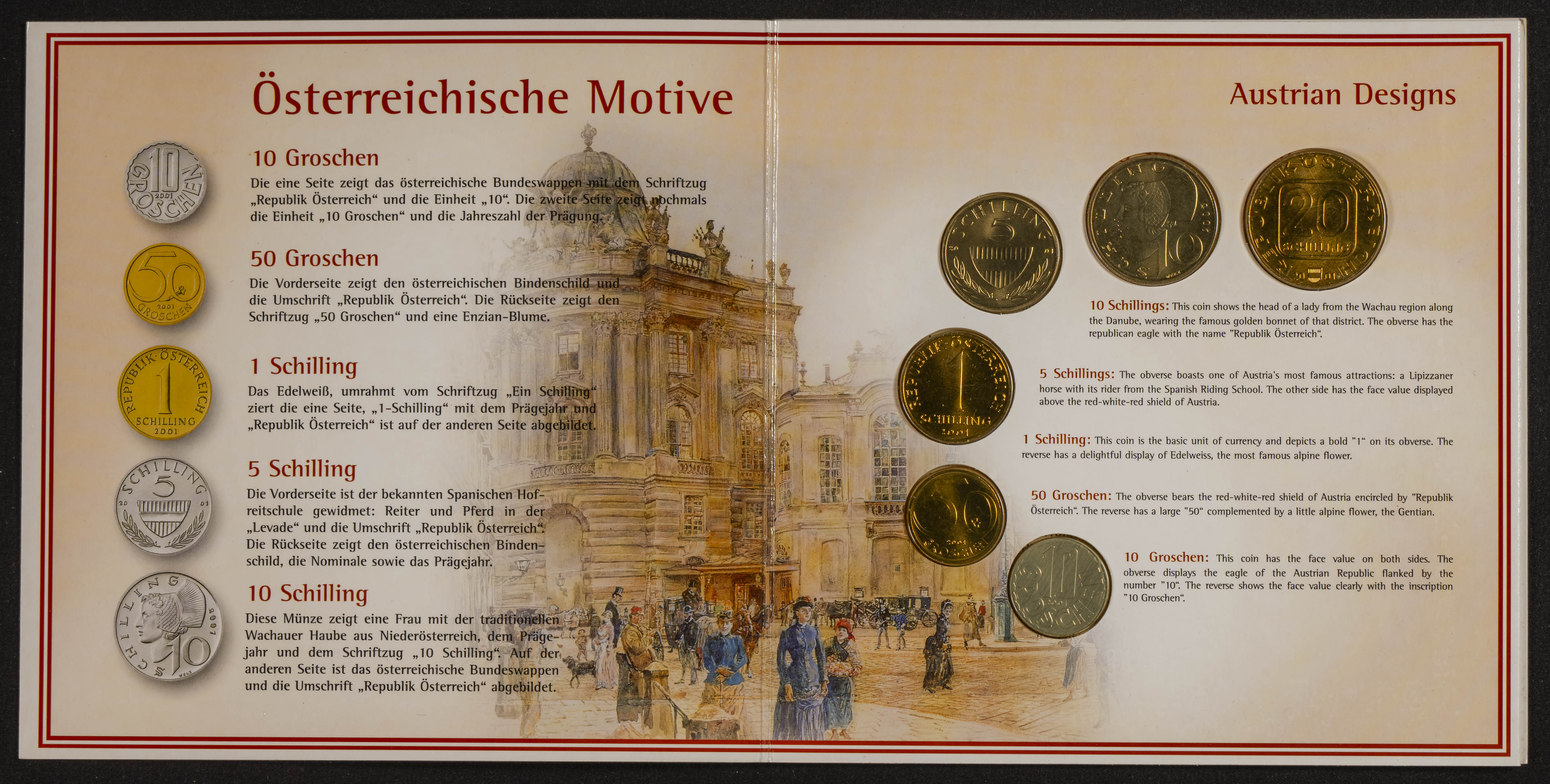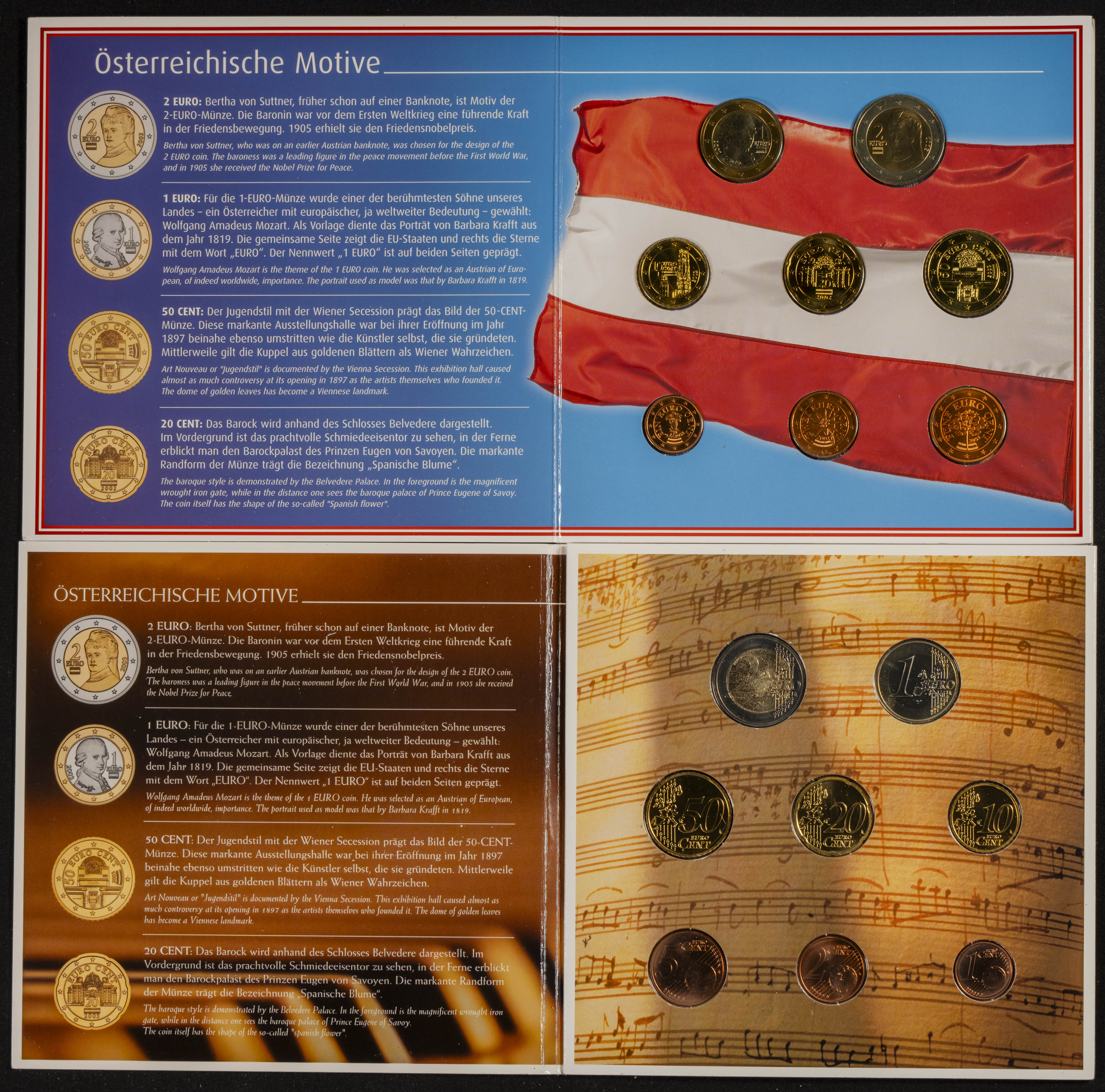 AUSTRIA. Conjunto de 12 sets completos con acuñaciones comprendidas entre el año 2000-2001 (últimas acuñaciones de Chelines) y 2009 (euros). Incluye series conmemorativas. Ningún set repetido. SC.