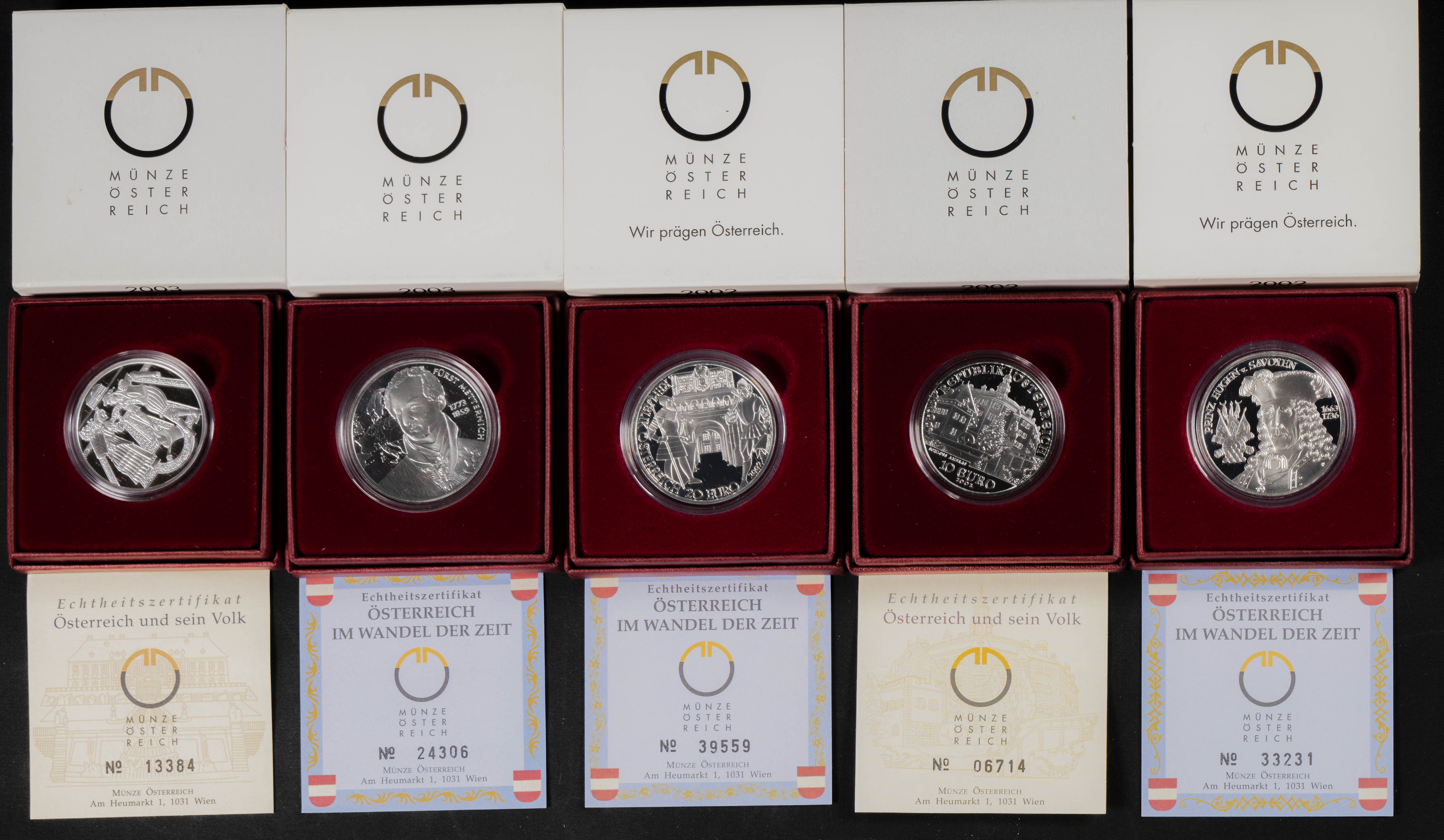 AUSTRIA. Conjunto de 5 estuches de 10 € (2) y 20 € (3) emitidos en los años 2002 y 2003. Todas diferentes. SC. Incluye todos los estuches originales y sus certificados de autenticidad.