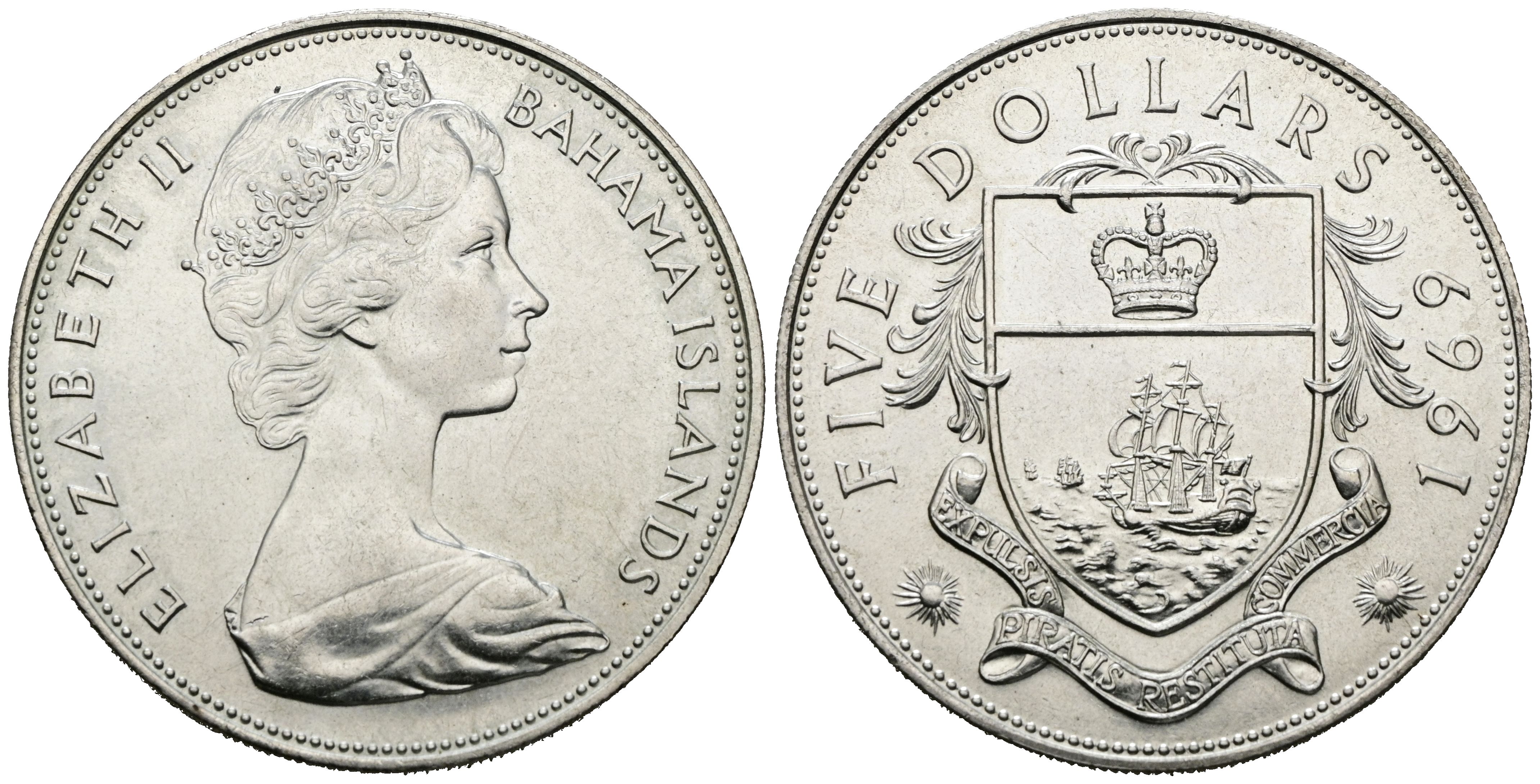 BAHAMAS. 5 Dollars. (Ar. 42,07g/45mm). 1969. (Km#10). EBC+. Tirada de 36.000 ejemplares.