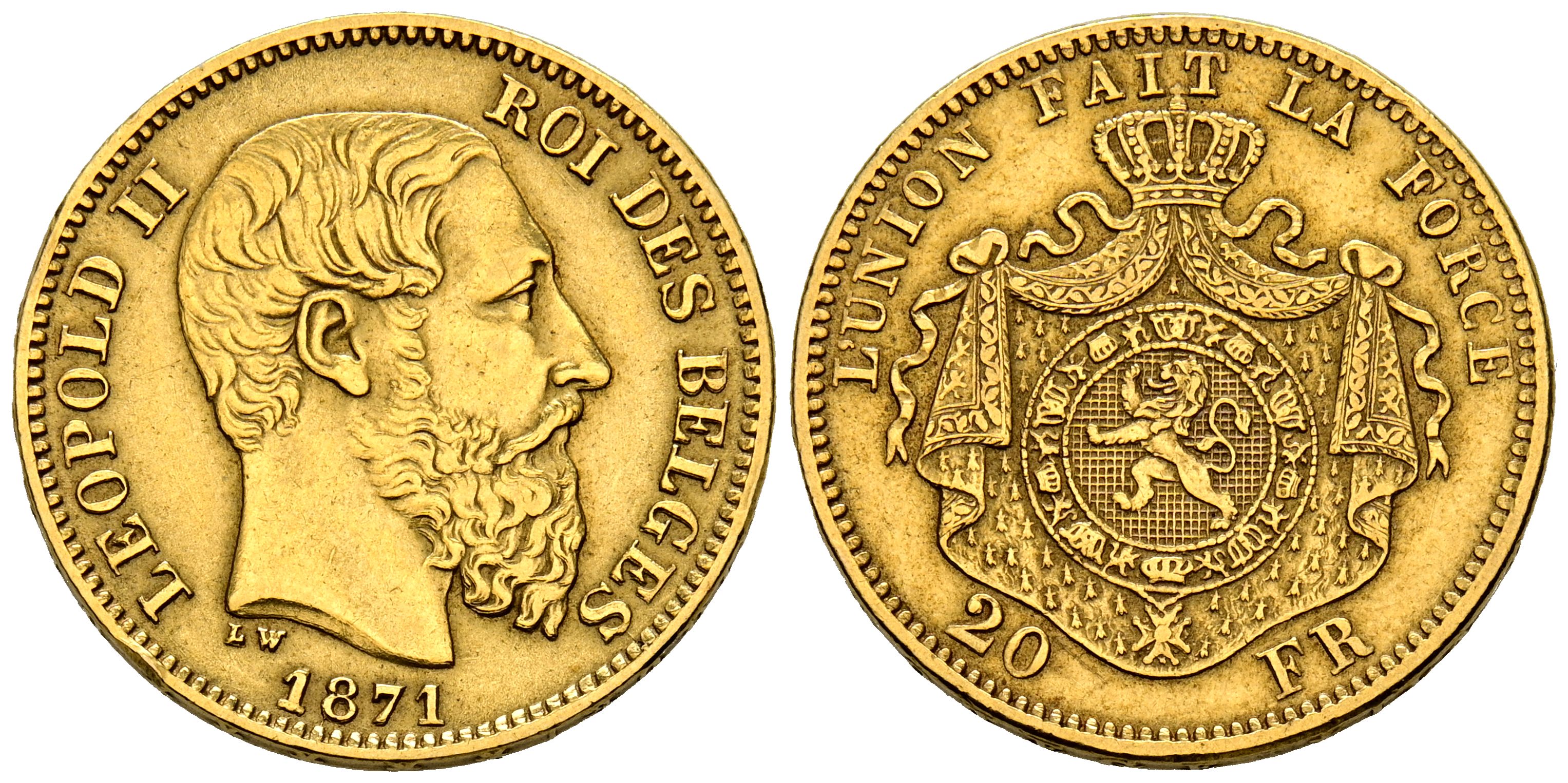 BÉLGICA, Leopoldo II (1865-1909). 20 Francos. (Au. 6,44g/21mm). 1871. Bruselas. (Km#37). MBC+.
