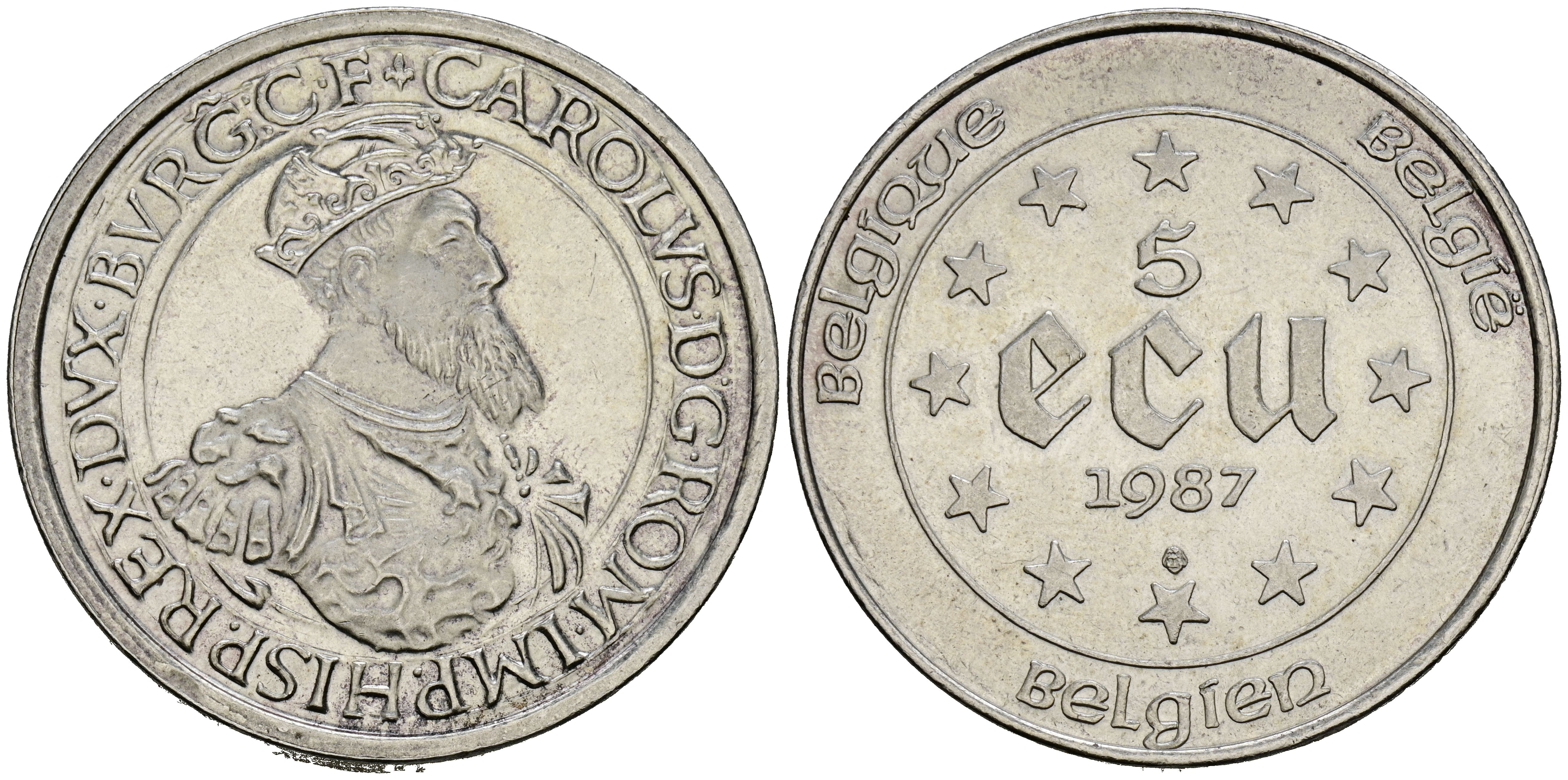 BÉLGICA. 5 Ecus. (Ar. 22,68g/37mm). 1987. Carlos V. (Km#166). PROOF.