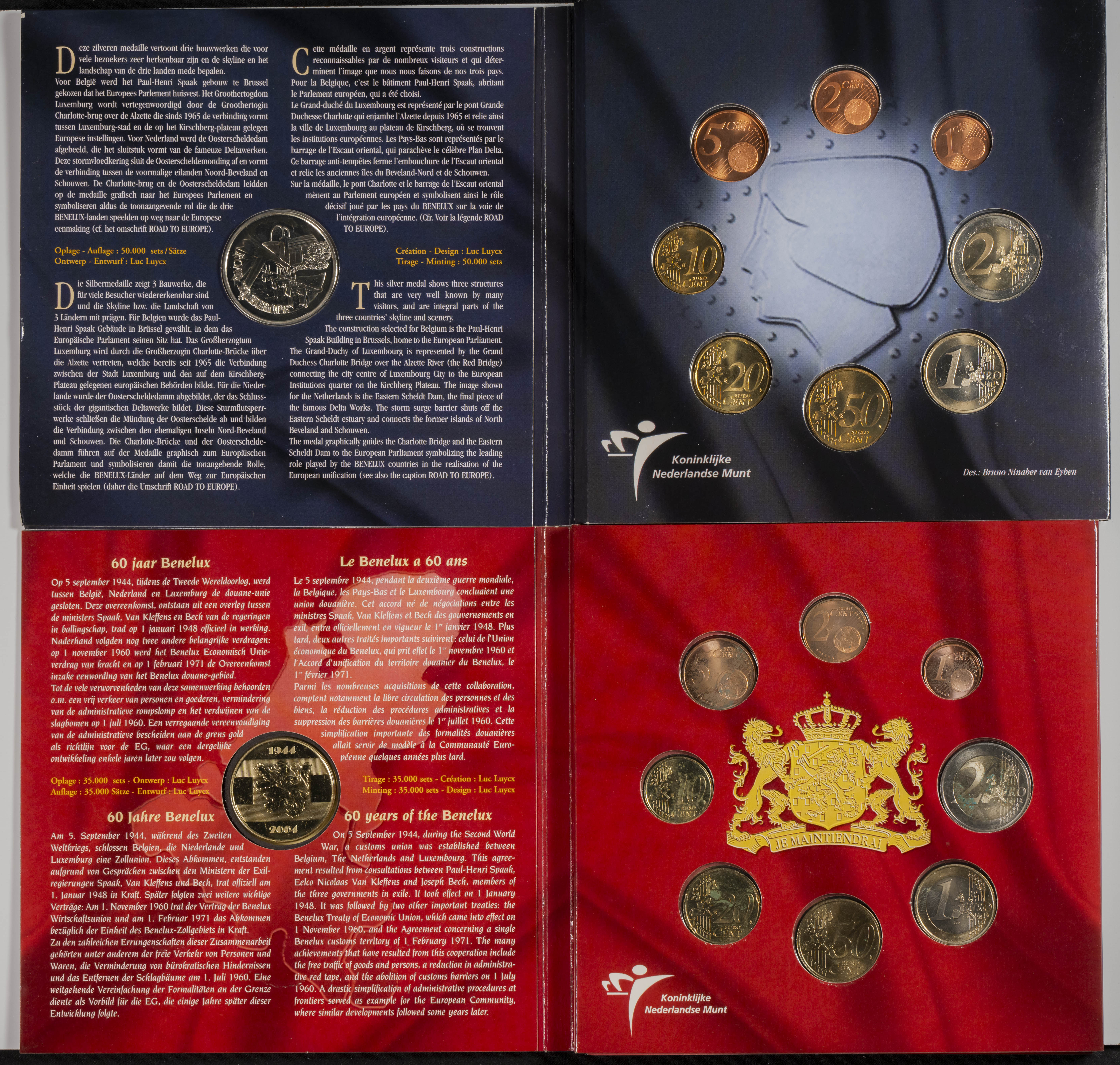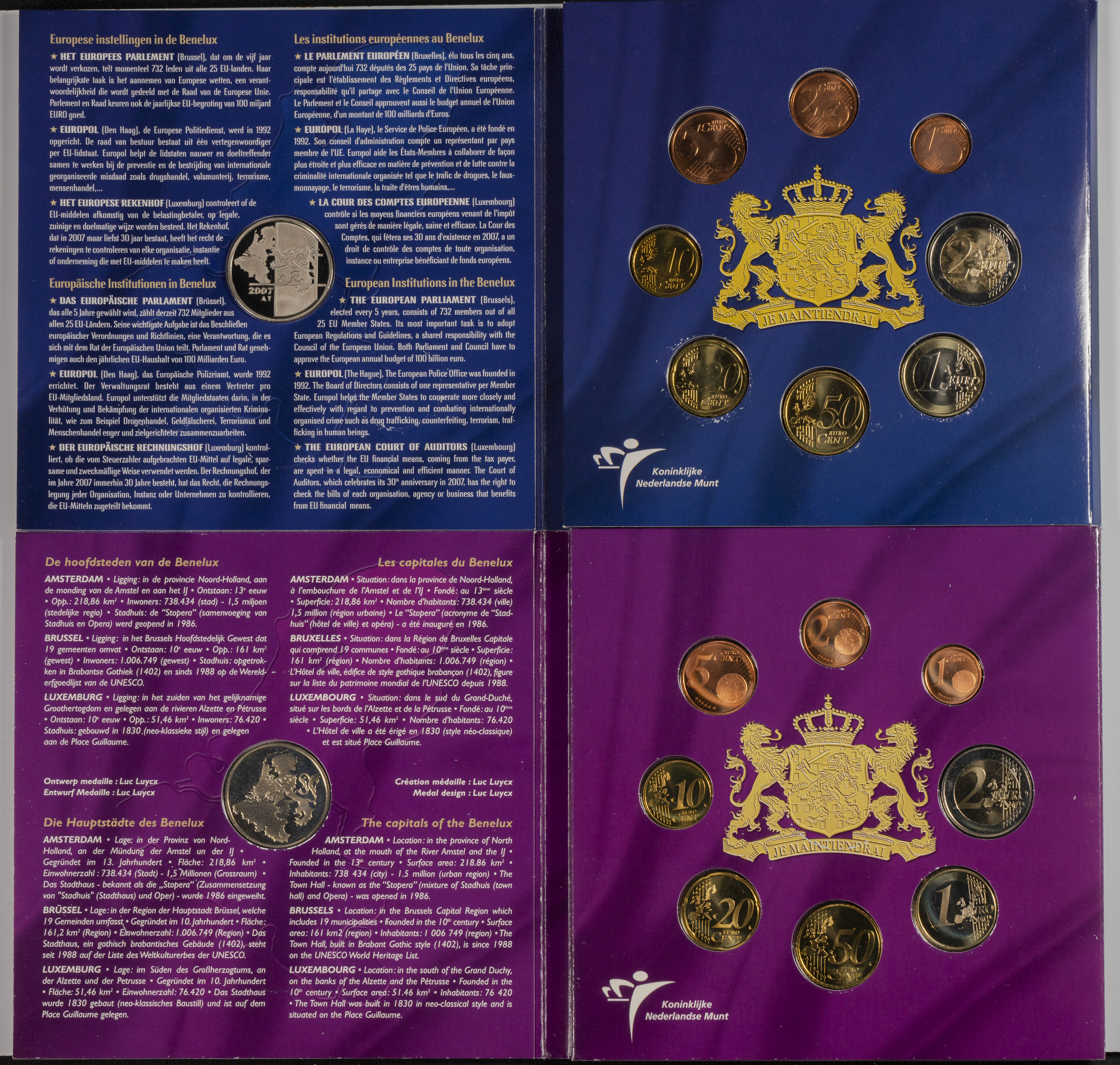 BENELUX. Conjunto de 4 Euroset de los años 2003, 2004, 2006 y 2007 de los tres países que lo componen (Bélgica, Países Bajos y Luxemburgo). Cada set incluye una medalla conmemorativa. SC.