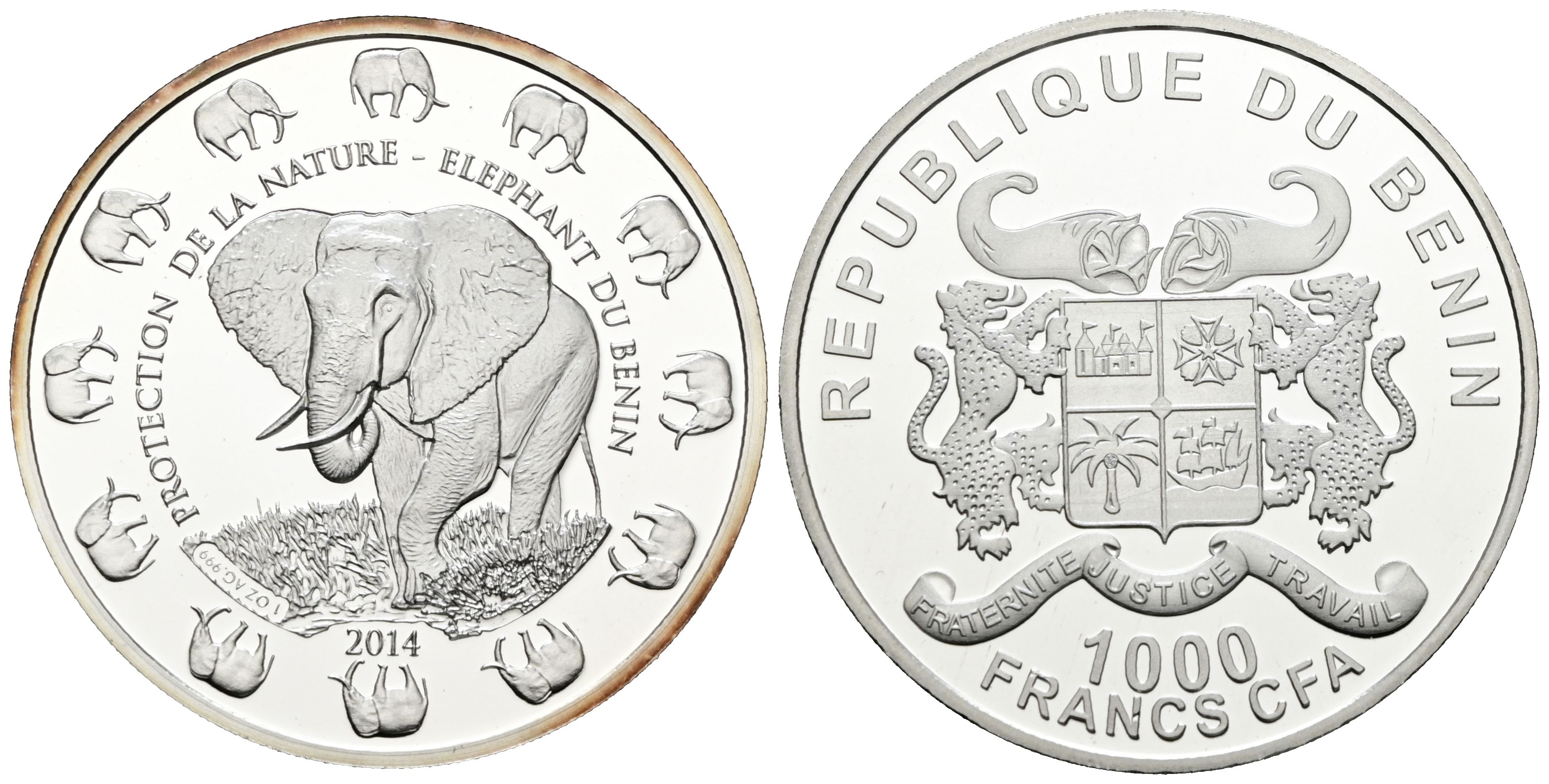 BENIN. 1000 Francs. (Ar. 31,22g/39mm). 2014. Bank of Central African States. Protección de la Naturaleza: Elefante. (Km#80). PROOF. Incluye cápsula.