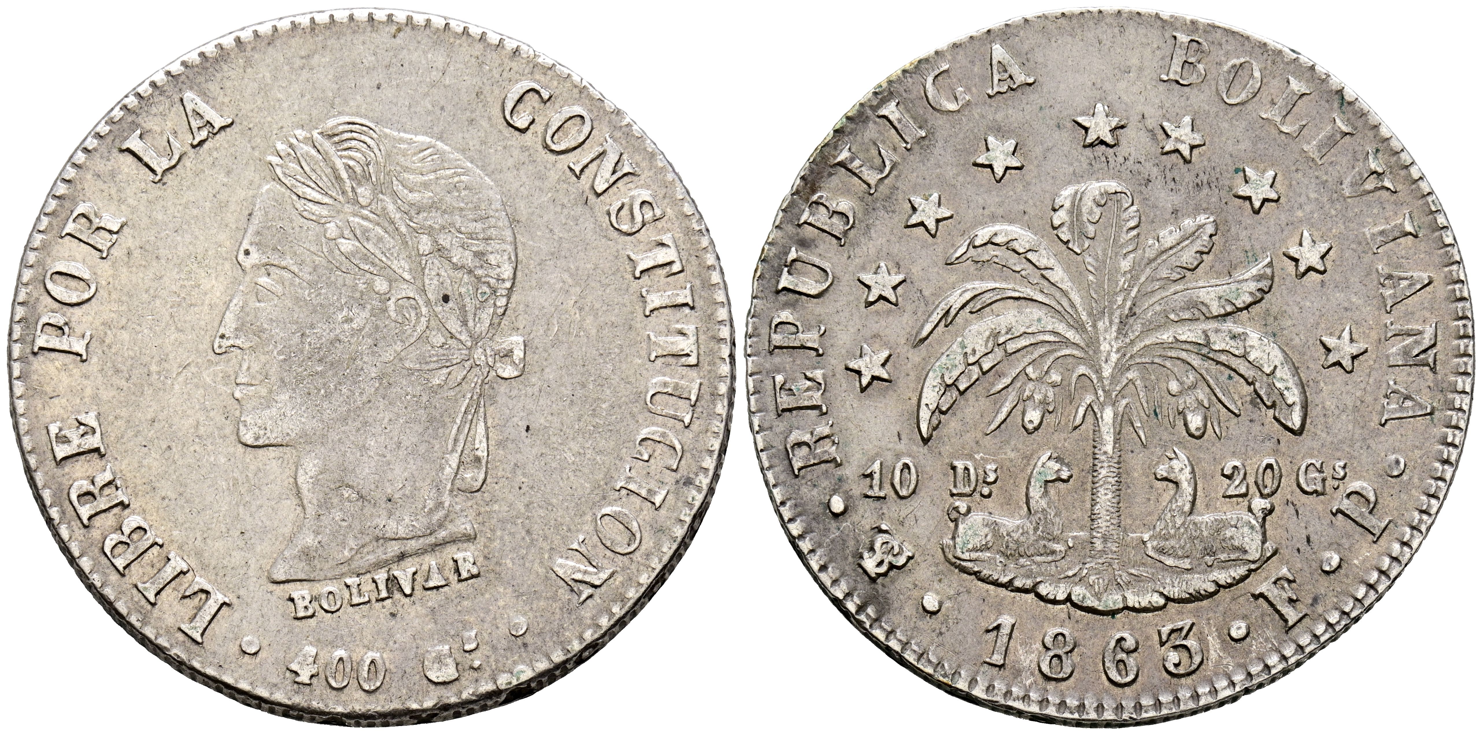 BOLIVIA. 8 Soles. (Ar. 19,68g/36mm). 1863. Potosí FP. (Km#138.6). MBC. Bonito tono. Escasa.