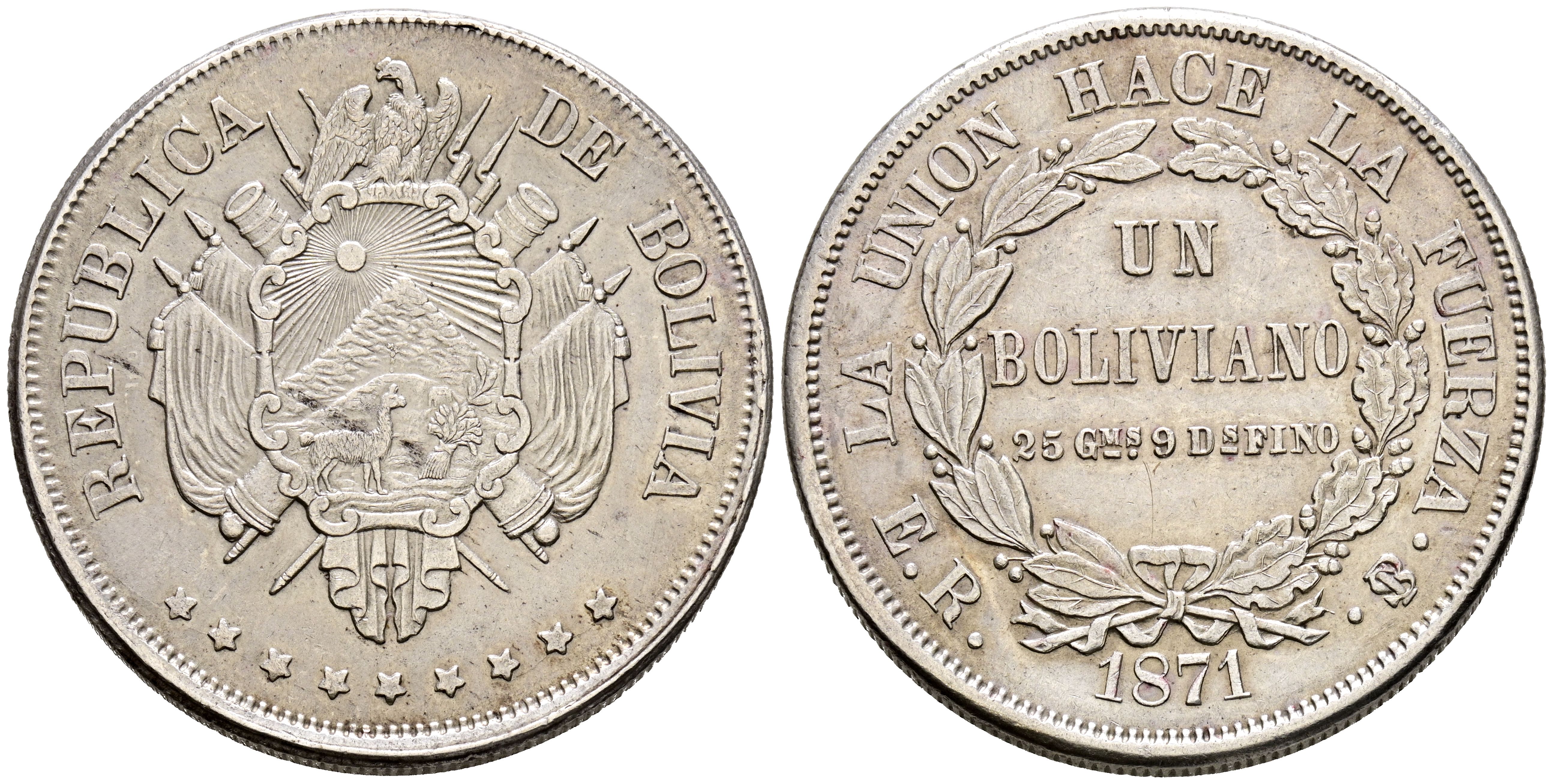 BOLIVIA. 1 Boliviano. (Ar. 24,81g/36mm). 1871. Potosí. (Km#155.4). MBC+.