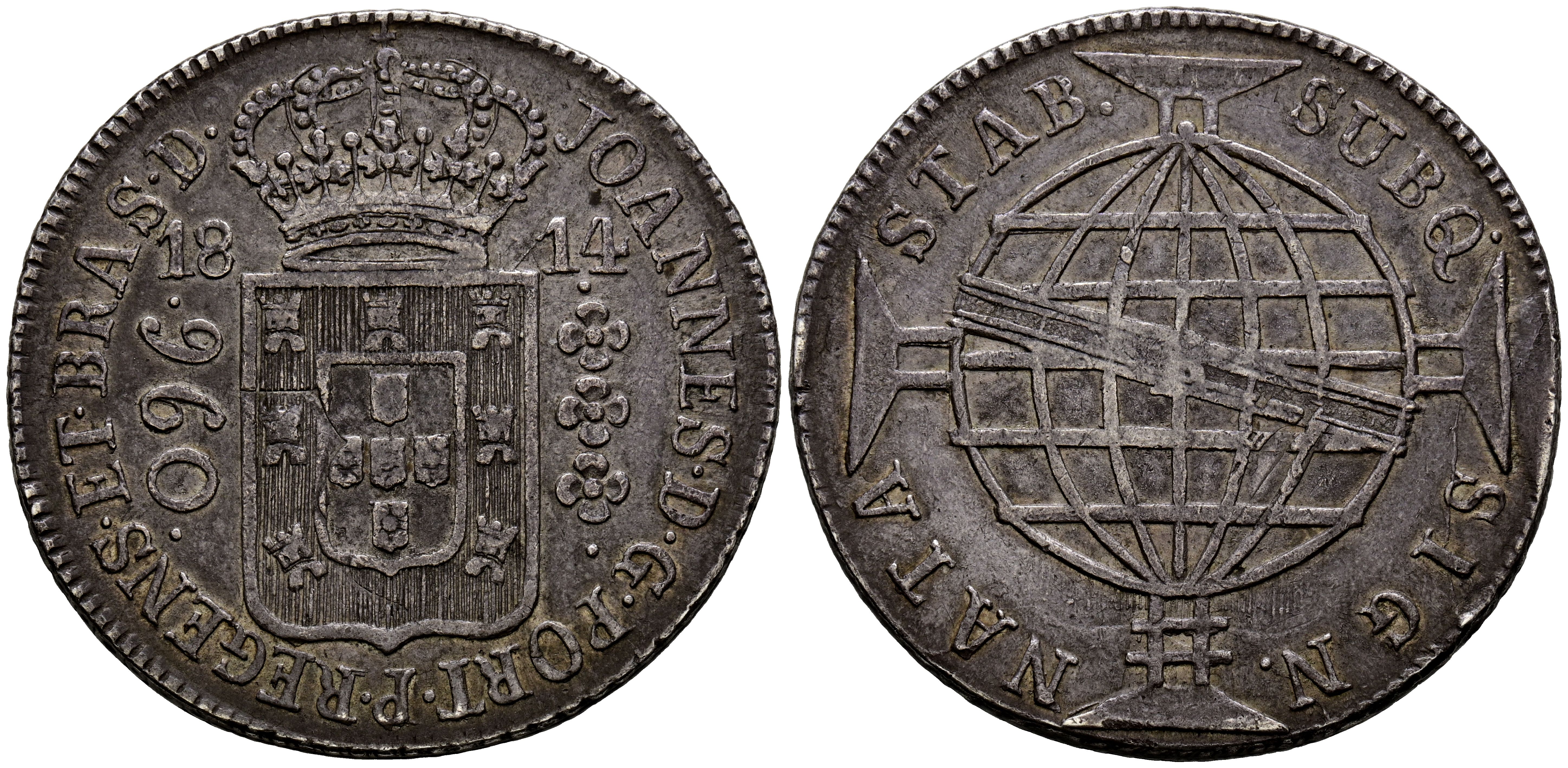 BRASIL (Portugués), Joao como Príncipe Regente (1799-1816). 960 Reis. (Ar. 26,87g/41mm). 1814. Bahía B. (Gomes 31.08). Acuñada sobre una moneda de 8 Reales españoles, canto en espiga pero visible el tipo cadeneta de la moneda anterior. MBC+. Preciosa tonalidad.
