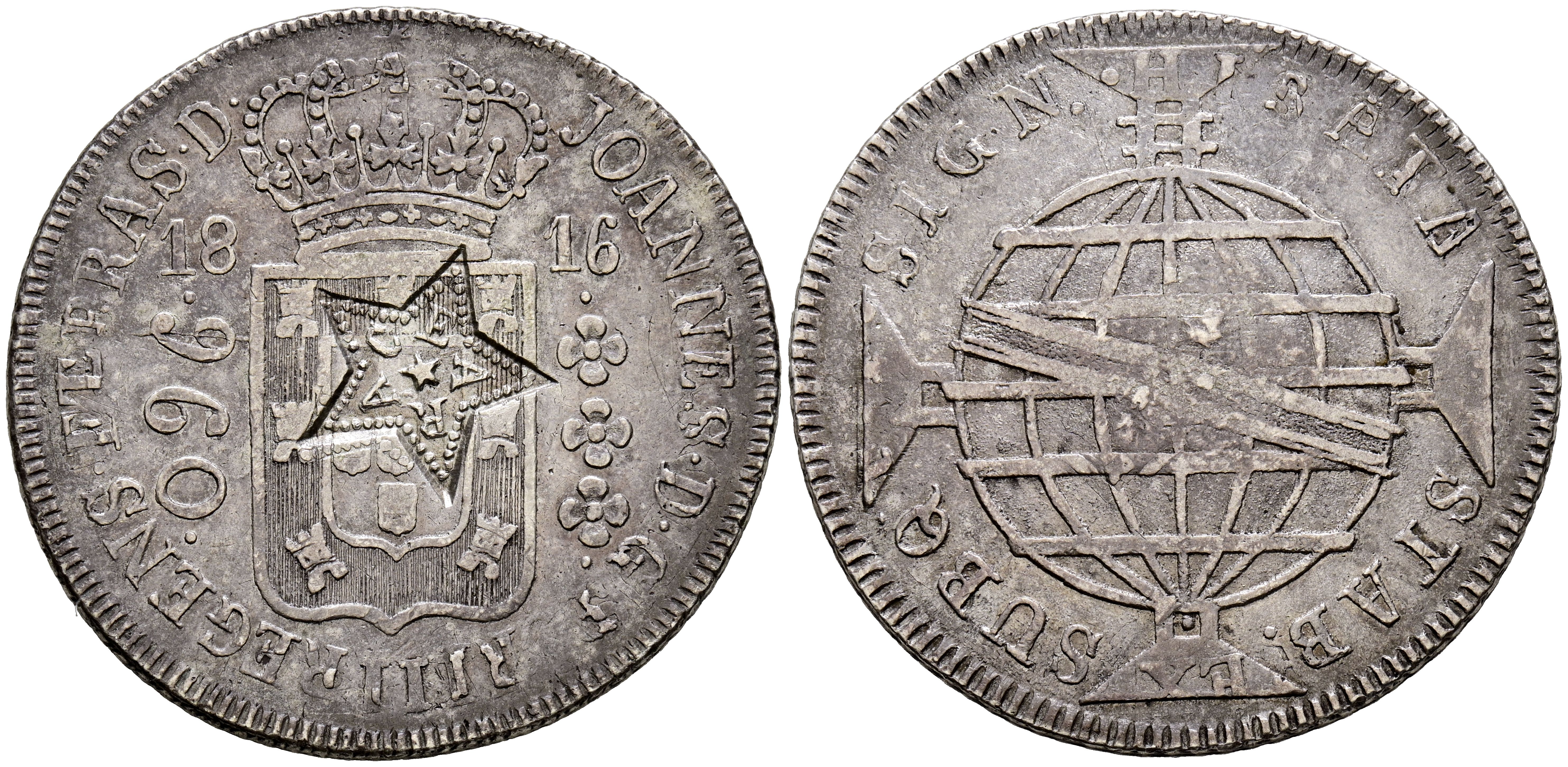 BRASIL, Joao como Príncipe Regente (1799-1816). 960 Reis. (Ar. 26,34g/42mm). 1816. Río de Janeiro. Acuñada sobre 8 Reales españoles dejando ver parte de la leyenda de la moneda original. MBC+. Resello de Ceará (A EXAMINAR) acuñado entre 1833 y 1834 (Km#307.1). Interesante y bonita pieza.