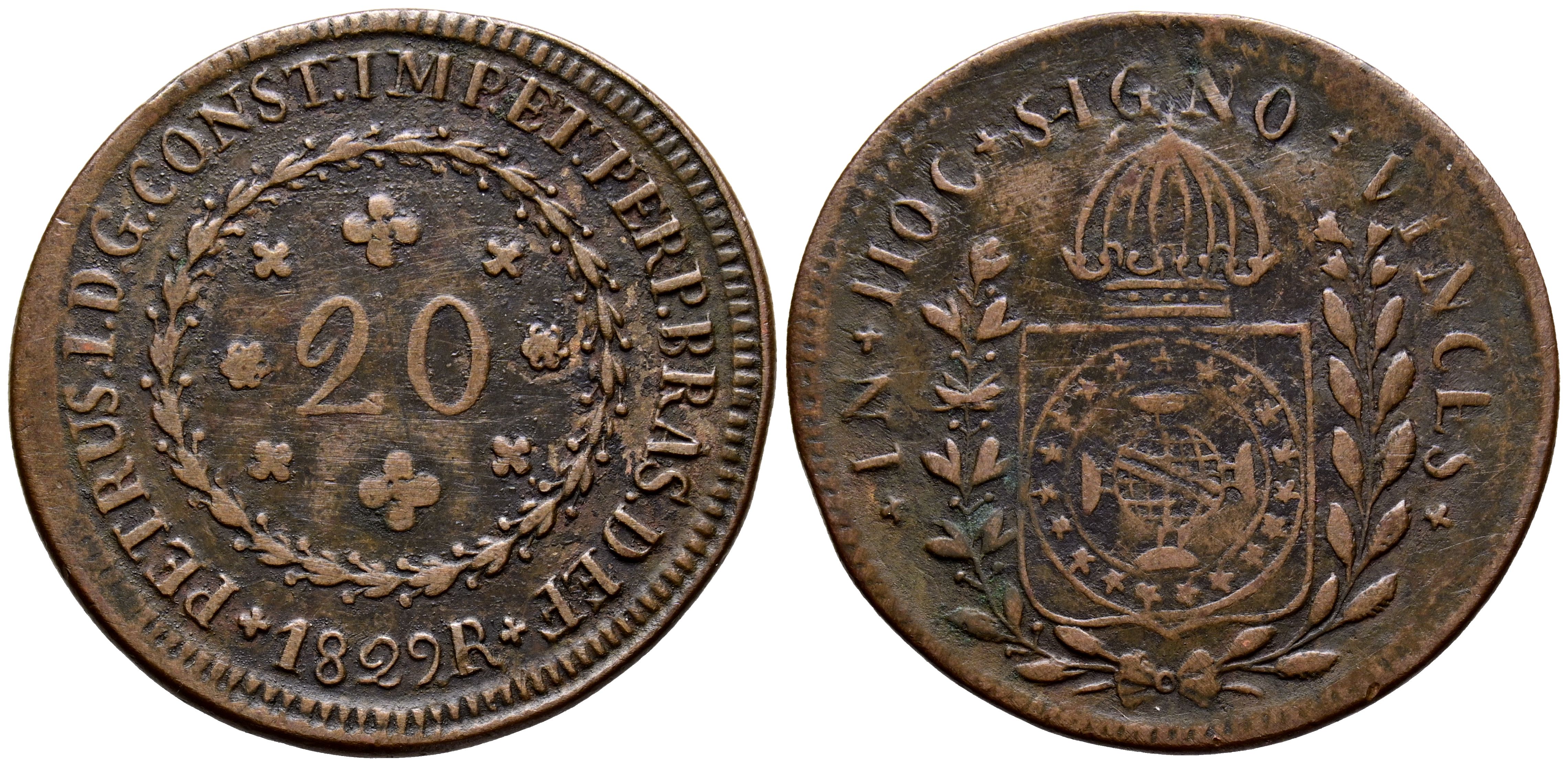 BRASIL, Pedro I (Primer Emperador del Brasil independiente). 20 Reis. (Ae. 6,92/32mm). 1822. Río R. (Km#360.1). MBC-.