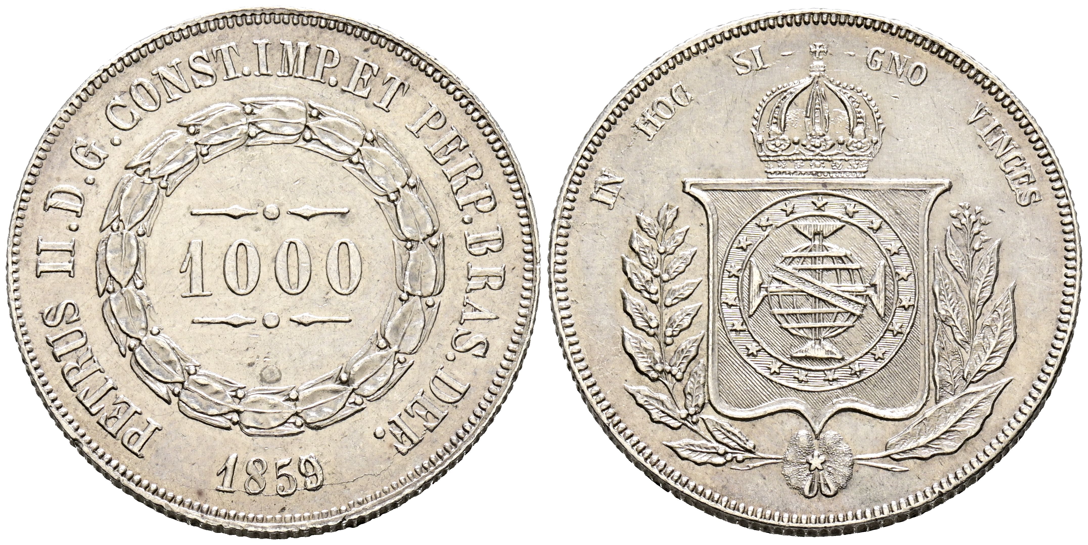 BRASIL, Pedro II. 1000 Reis (Ar. 12,51g/32mm). 1859. (Km#465). Sobrefecha. MBC+.