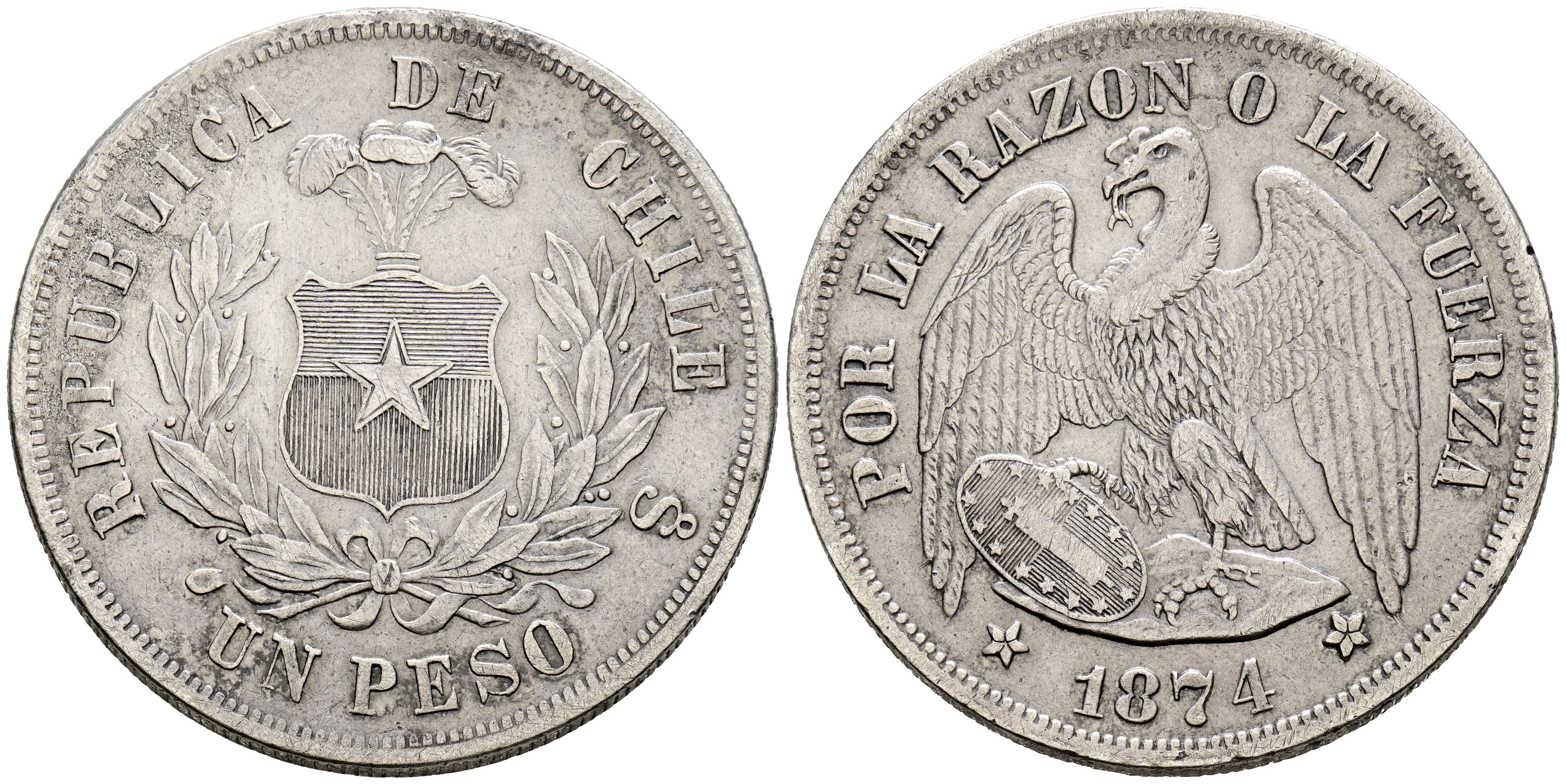CHILE. 1 Peso (Ar. 24,58g/37mm). 1874. Santiago. (Km#142.1). MBC.