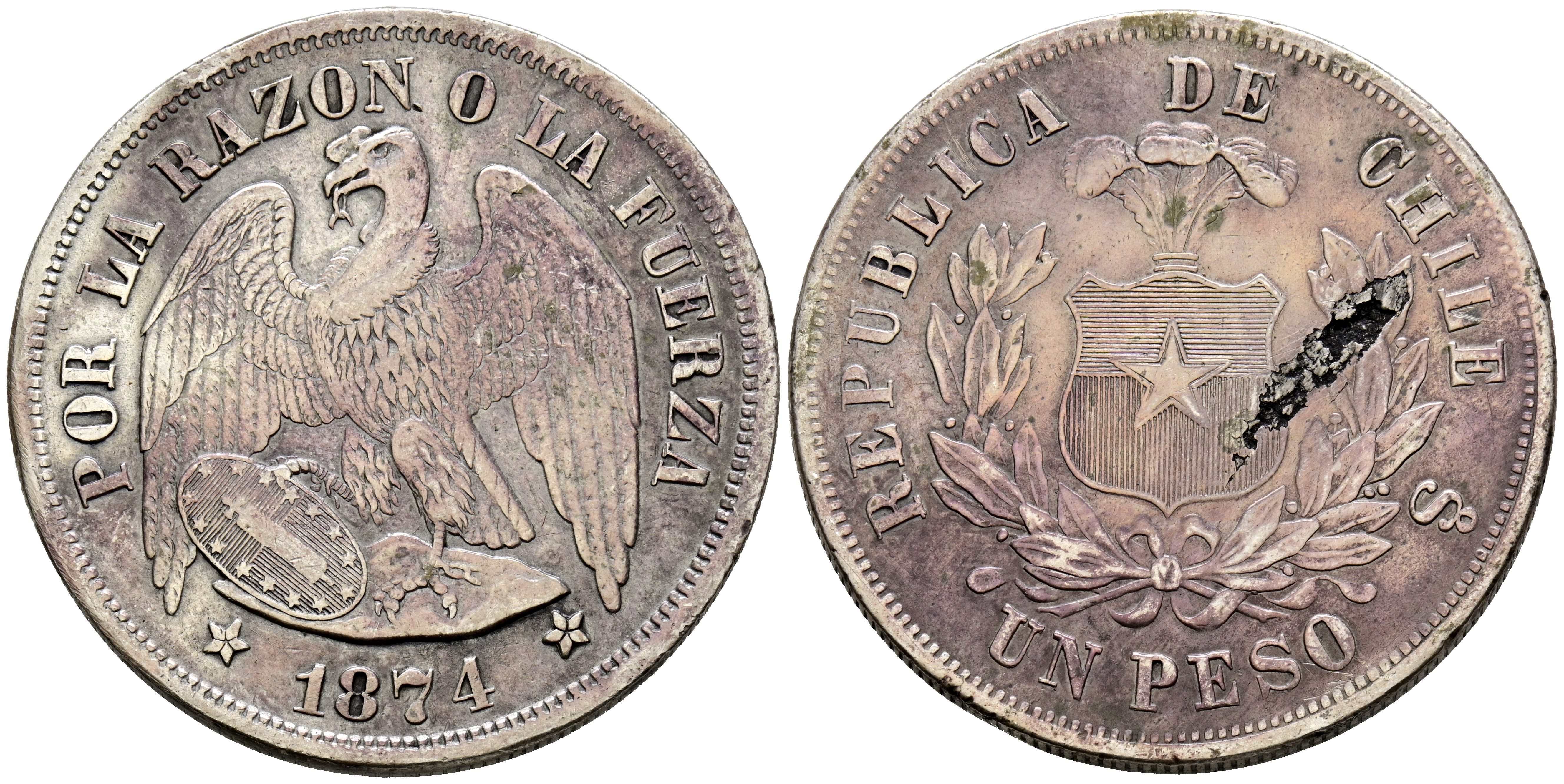 CHILE. 1 Peso. (Ar. 24,68g/37mm). 1874. Santiago. (Km#142.1). MBC. Hoja en reverso.