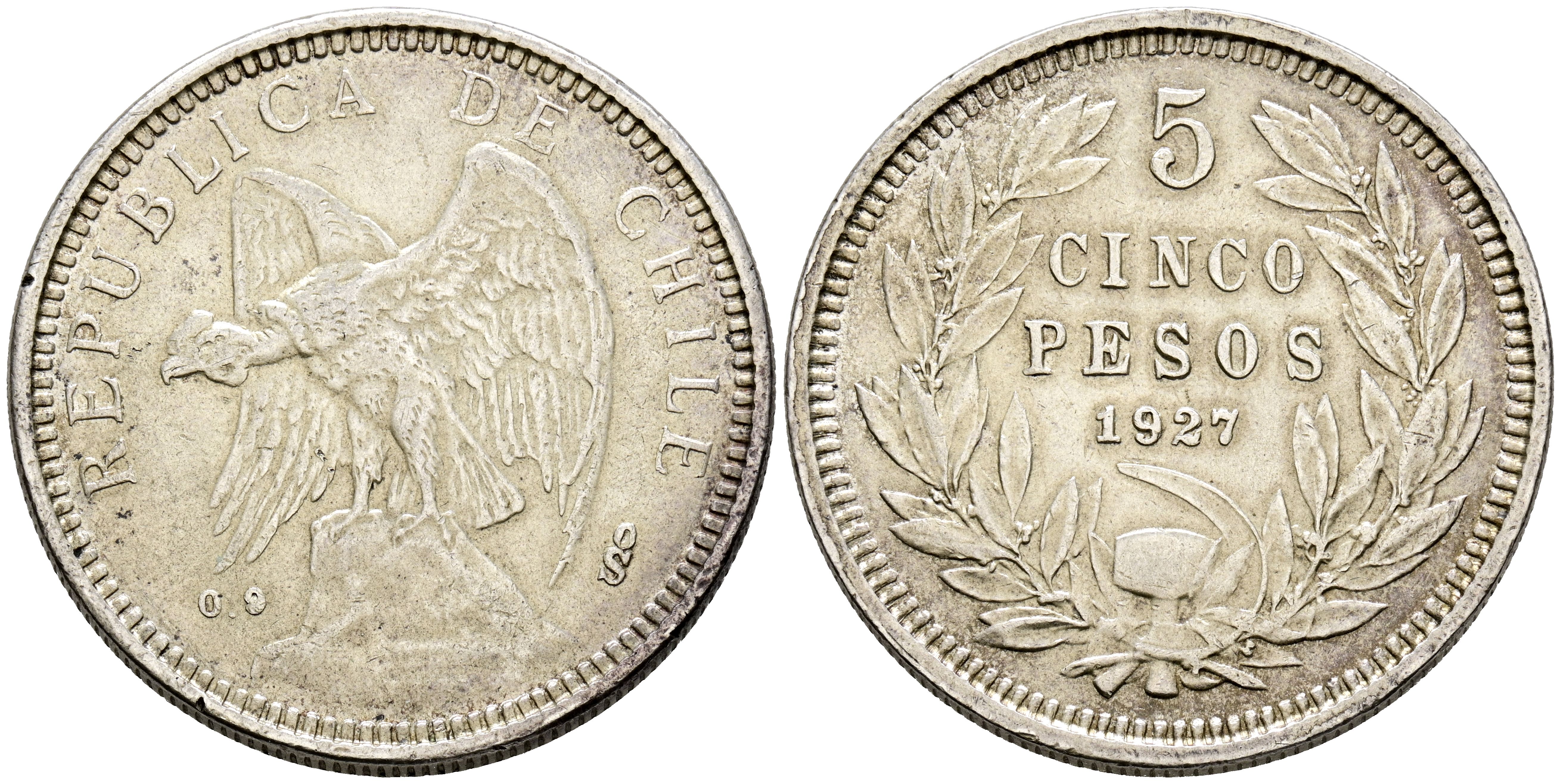 CHILE. 5 Pesos (Ar. 25,05g/37mm). 1927. Santiago. (Km#173.1). MBC.