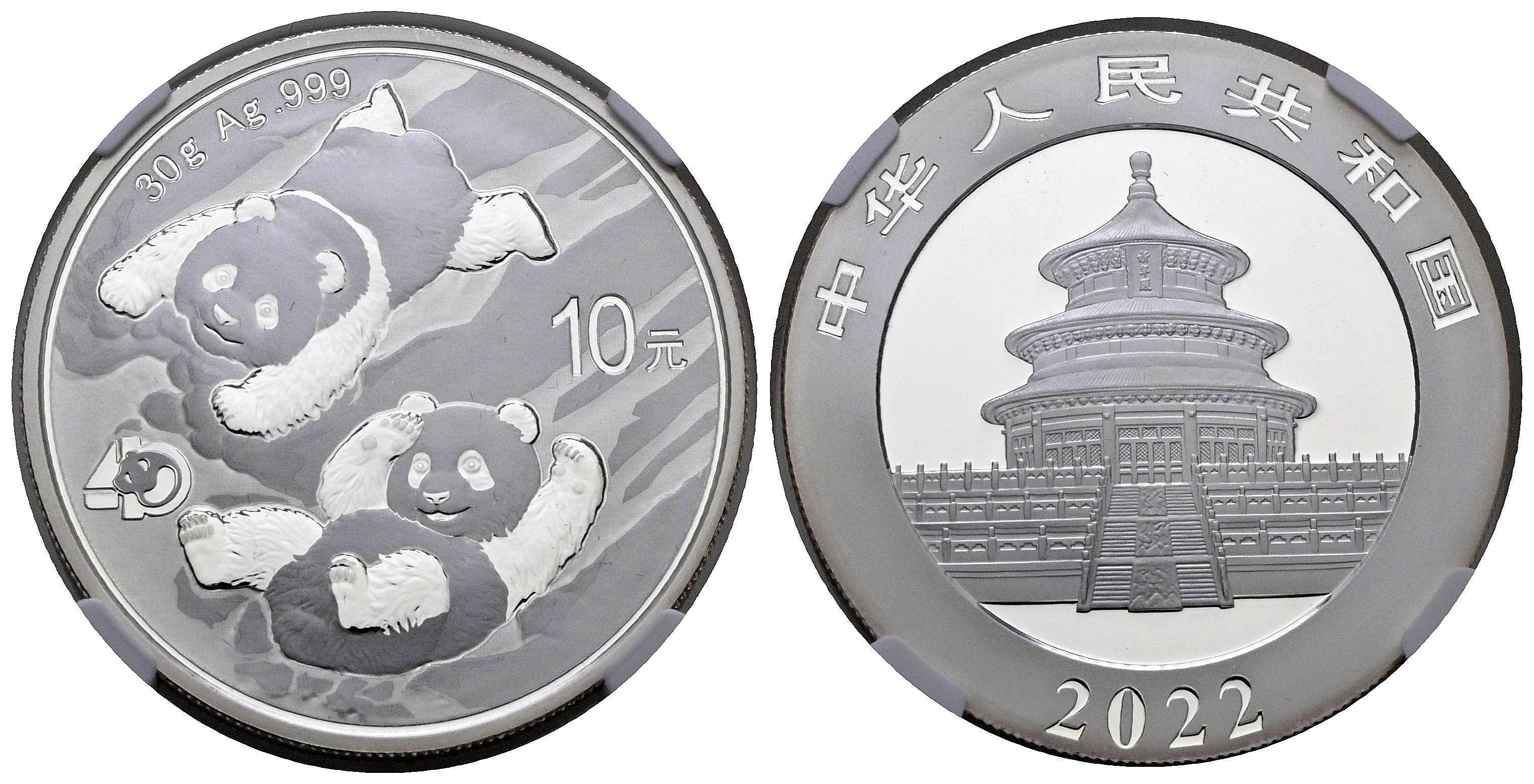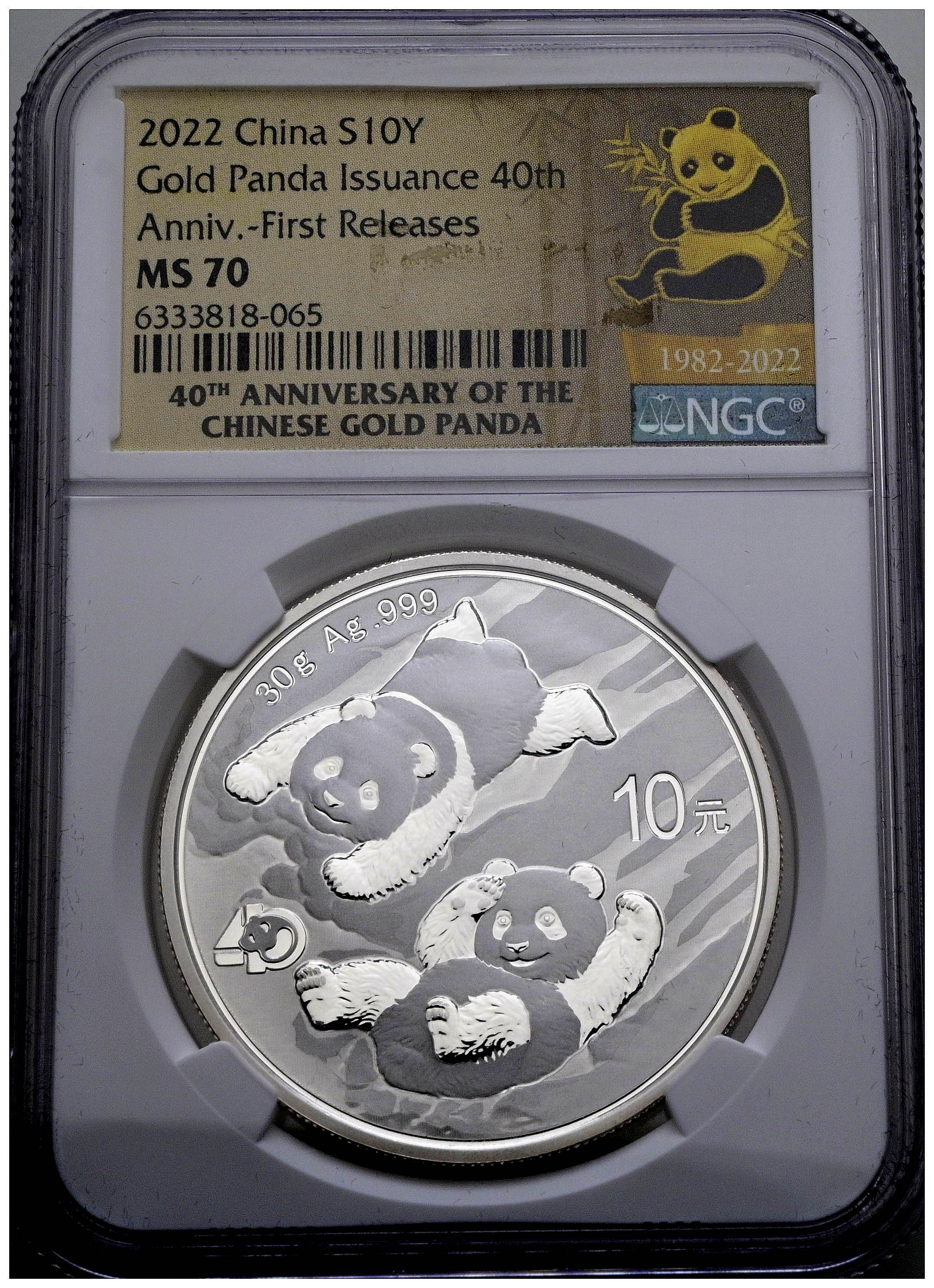 CHINA. 10 Yuan. (Ar. 30,00g/40mm)*. 2022. Serie Panda. Encapsulado por NGC MS 70, First date of Issue. 40th Anniversary. *Peso y medidas teóricos.