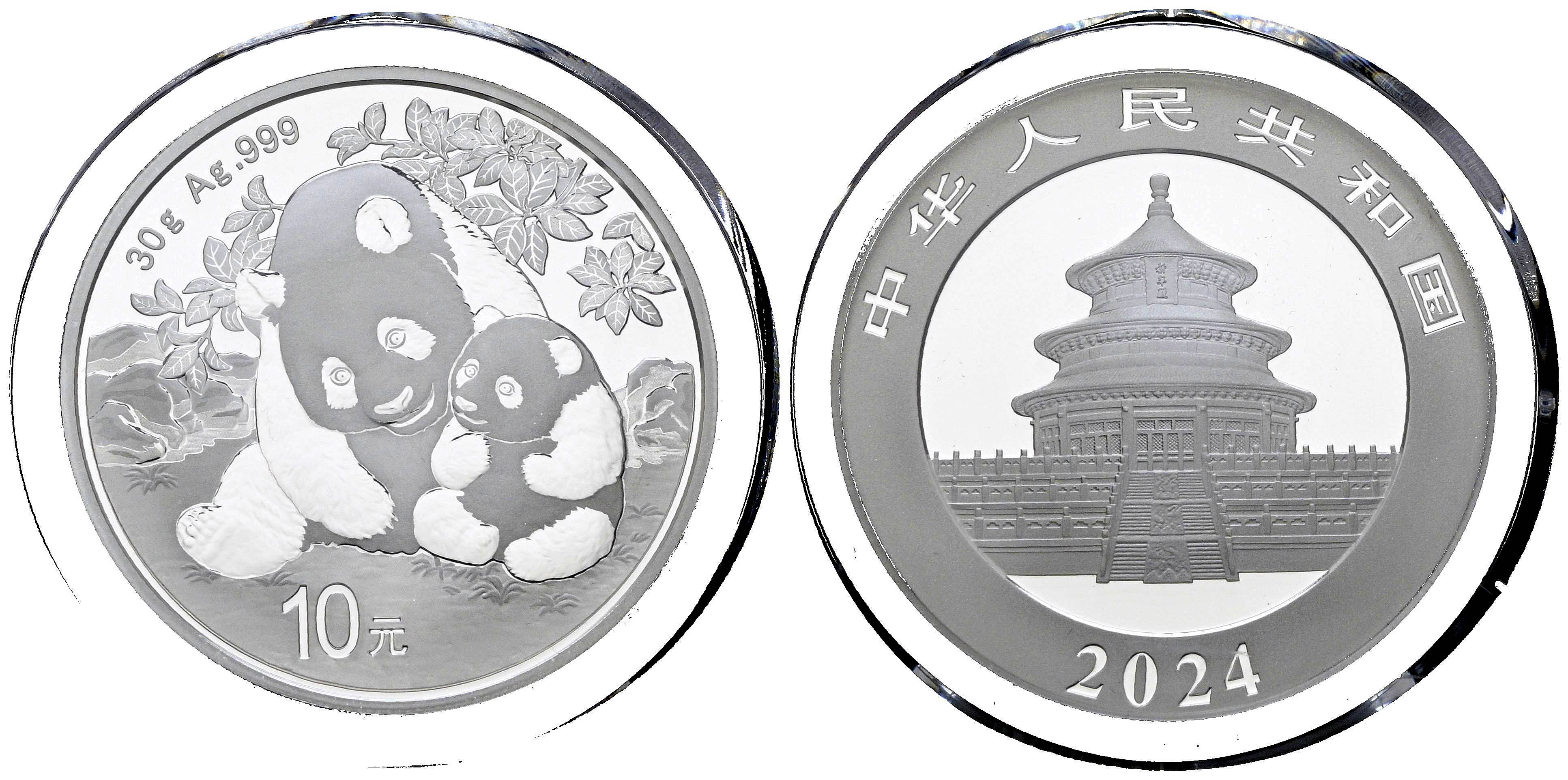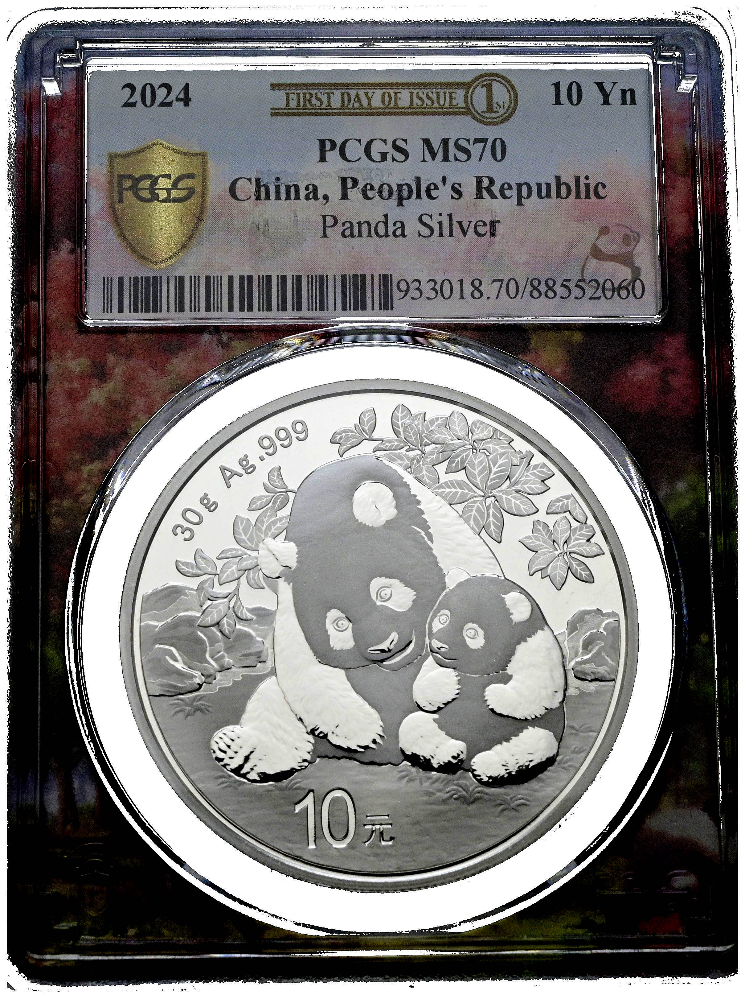 CHINA. 10 Yuan. (Ar. 30,00g/40mm)*. 2024. Serie Panda. Encapsulado por PCGS MS 70, First date of Issue. *Peso y medidas teóricos.
