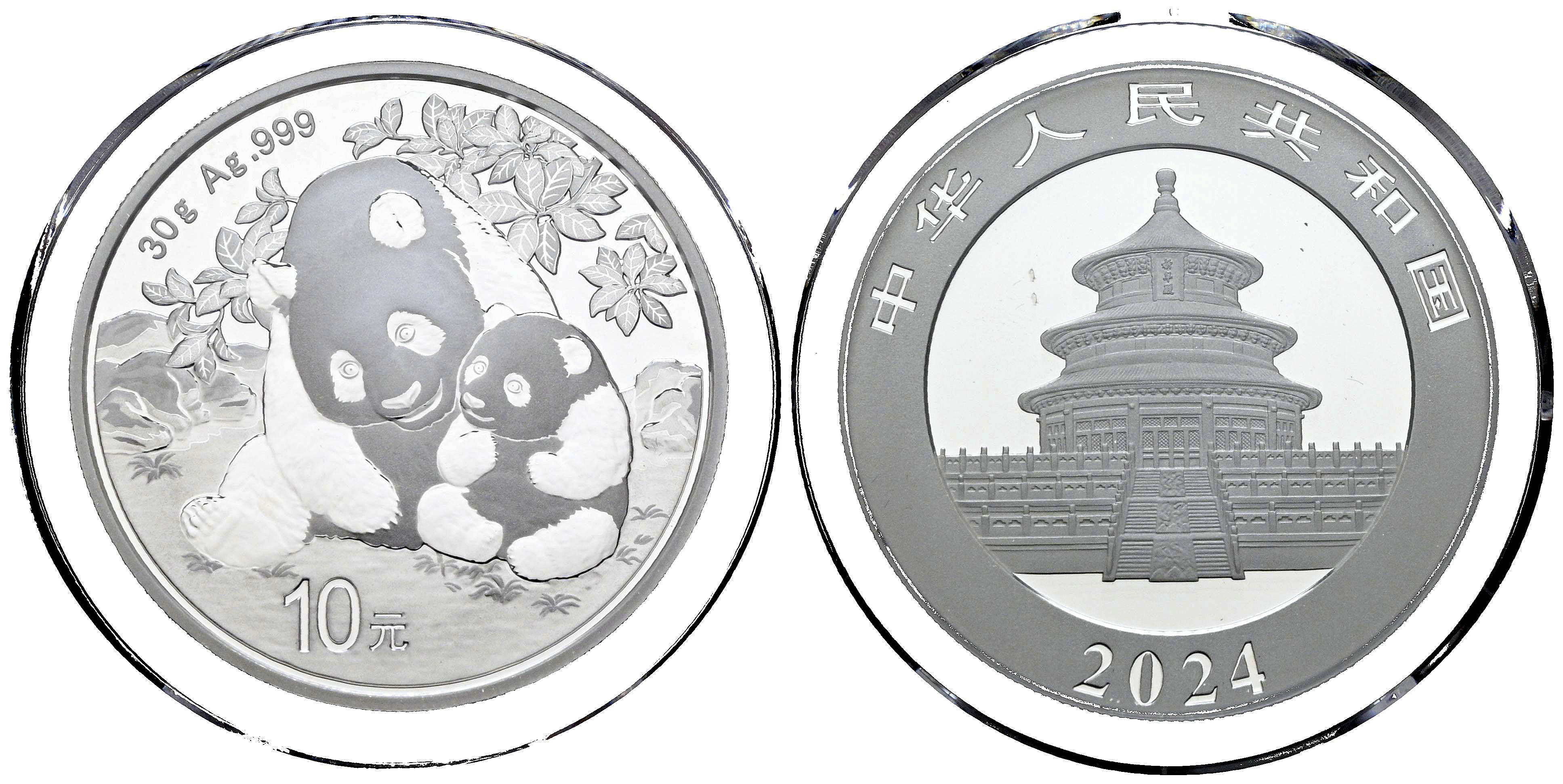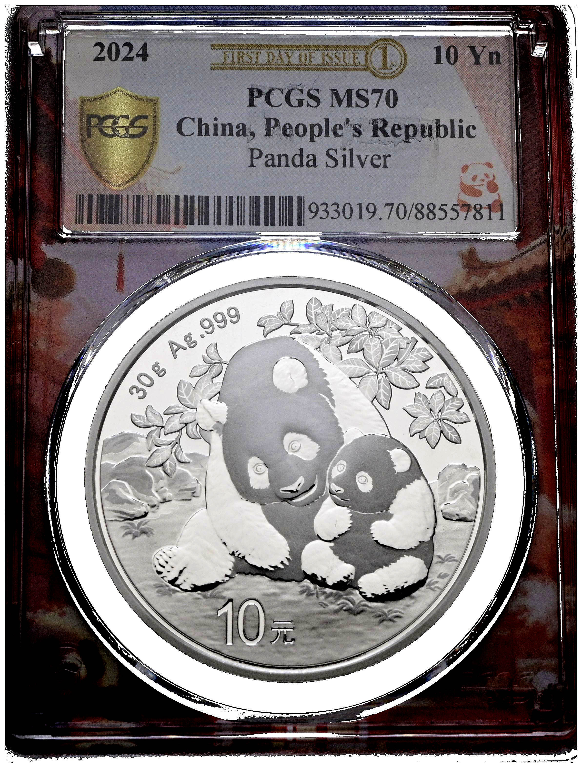 CHINA. 10 Yuan. (Ar. 30,00g/40mm)*. 2024. Serie Panda. Encapsulado por PCGS MS 70, First date of Issue. *Peso y medidas teóricos.