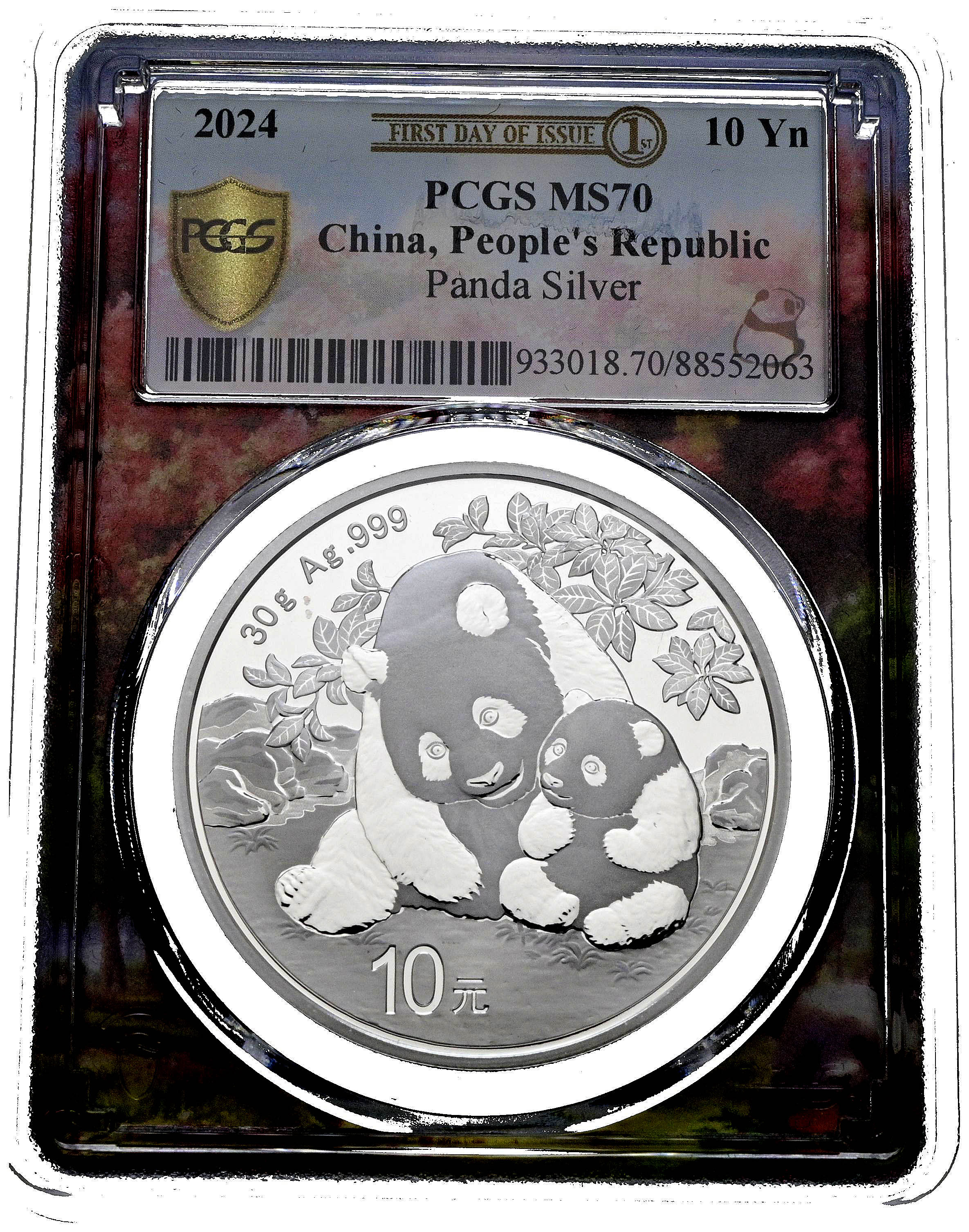 CHINA. 10 Yuan. (Ar. 30,00g/40mm)*. 2024. Serie Panda. Encapsulado por PCGS MS 70, First date of Issue. *Peso y medidas teóricos.