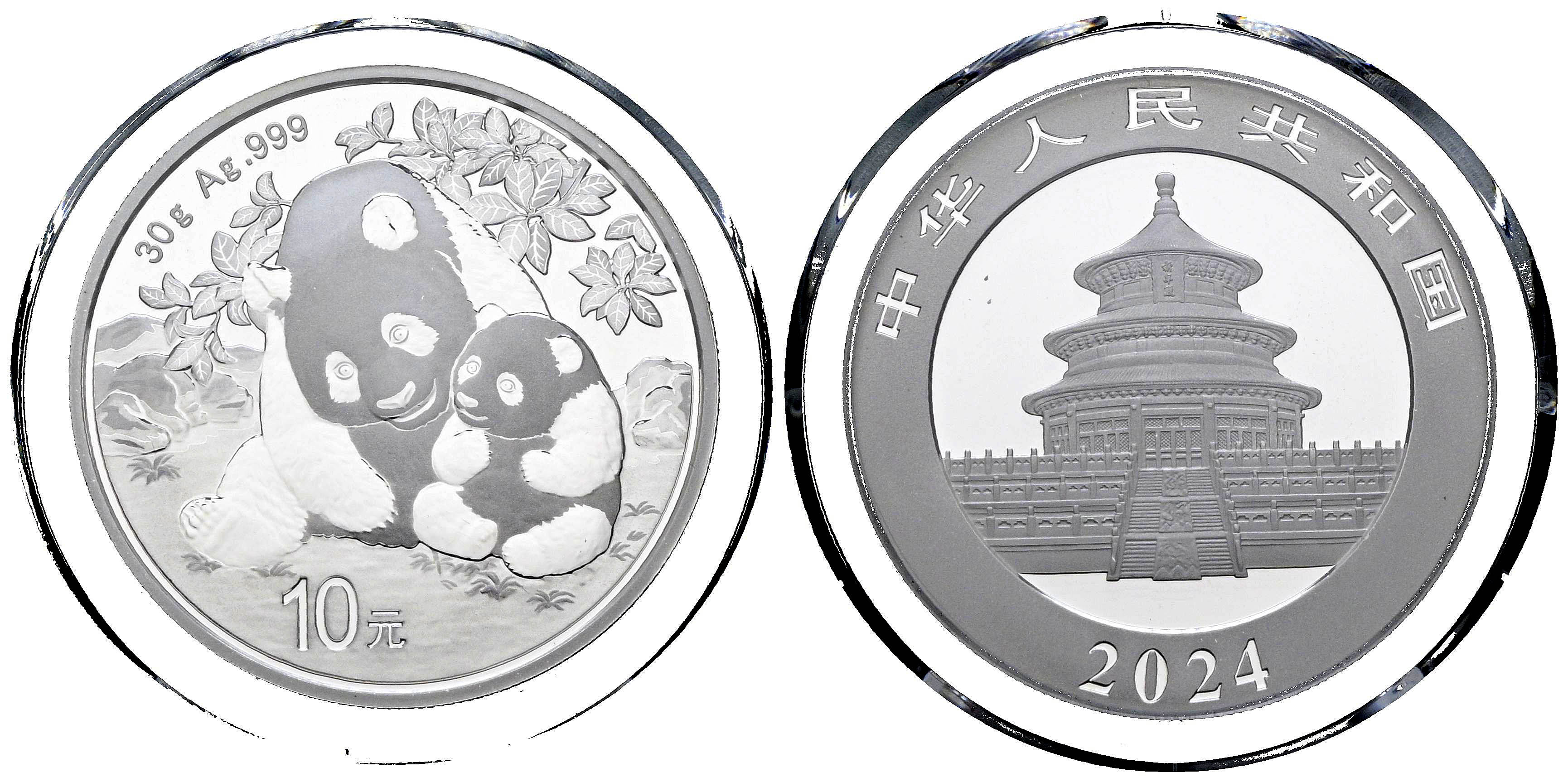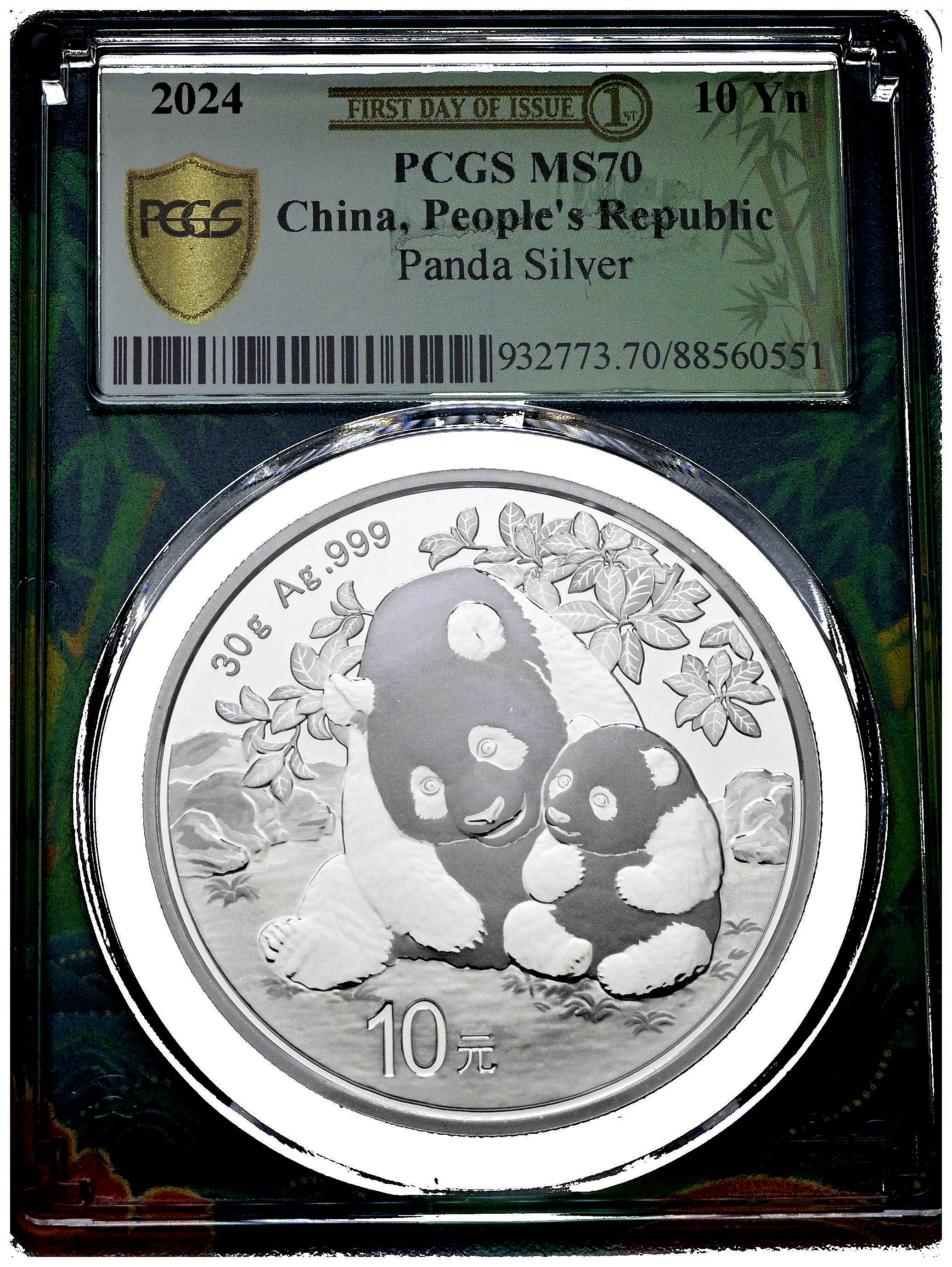 CHINA. 10 Yuan. (Ar. 30,00g/40mm)*. 2024. Serie Panda. Encapsulado por PCGS MS 70, First Day of Issue. *Peso y medidas teóricos.