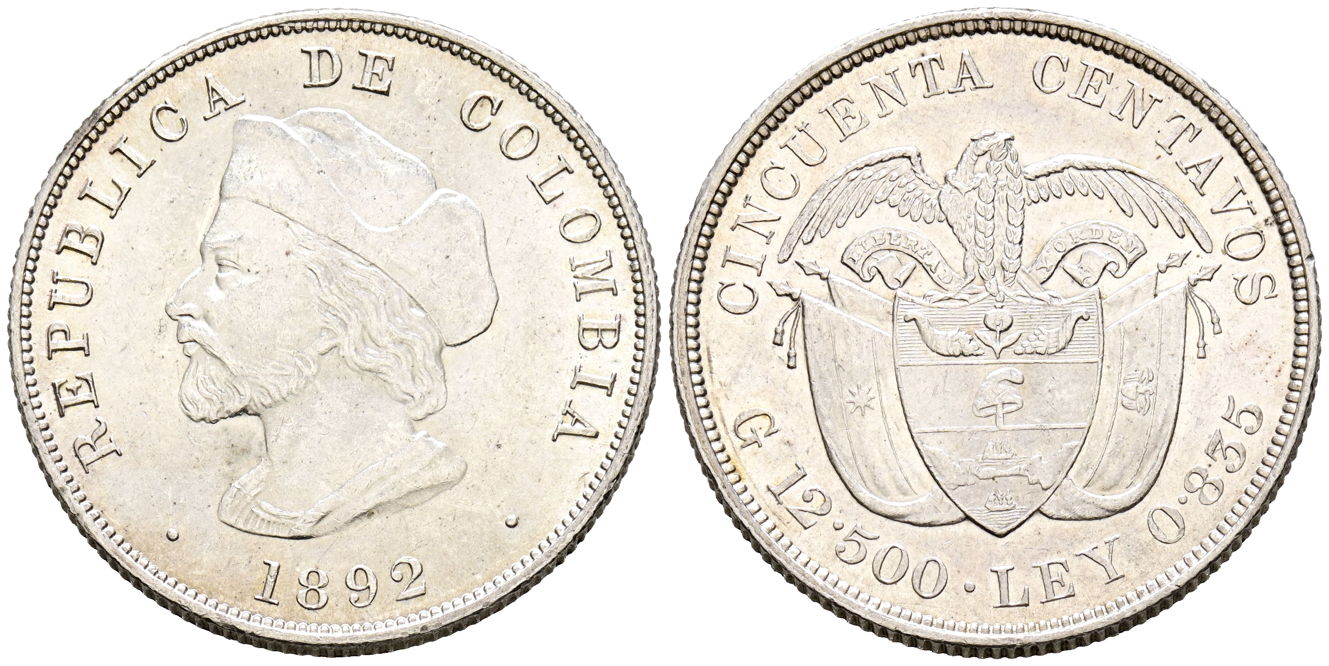 COLOMBIA. 50 Centavos. (Ar. 12,48g/30mm). 1892. 400 Aniversario del Descubrimiento de América. (Km#187.2). EBC-.
