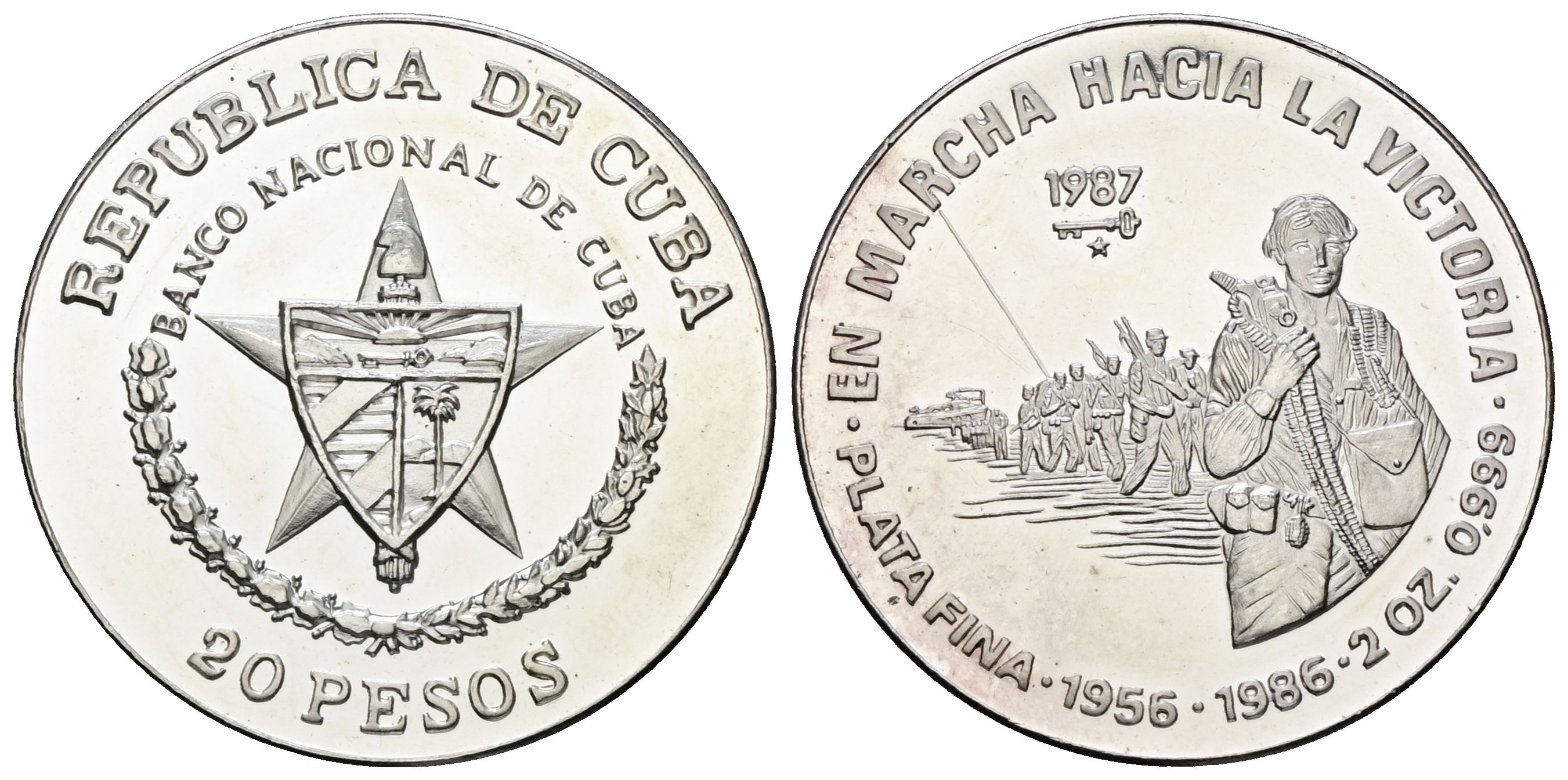 CUBA. 20 Pesos. (Ar. 62,17g/45mm). 1987. En marcha hacia la victoria. 30 Aniversario. (Km#171). PROOF. Raya en reverso. Tirada de sólo 333 unidades.