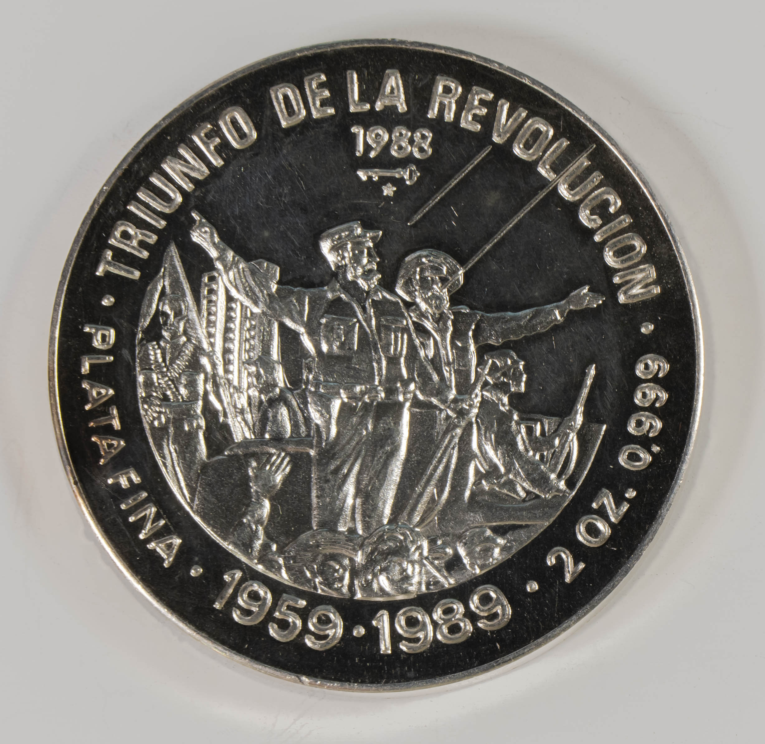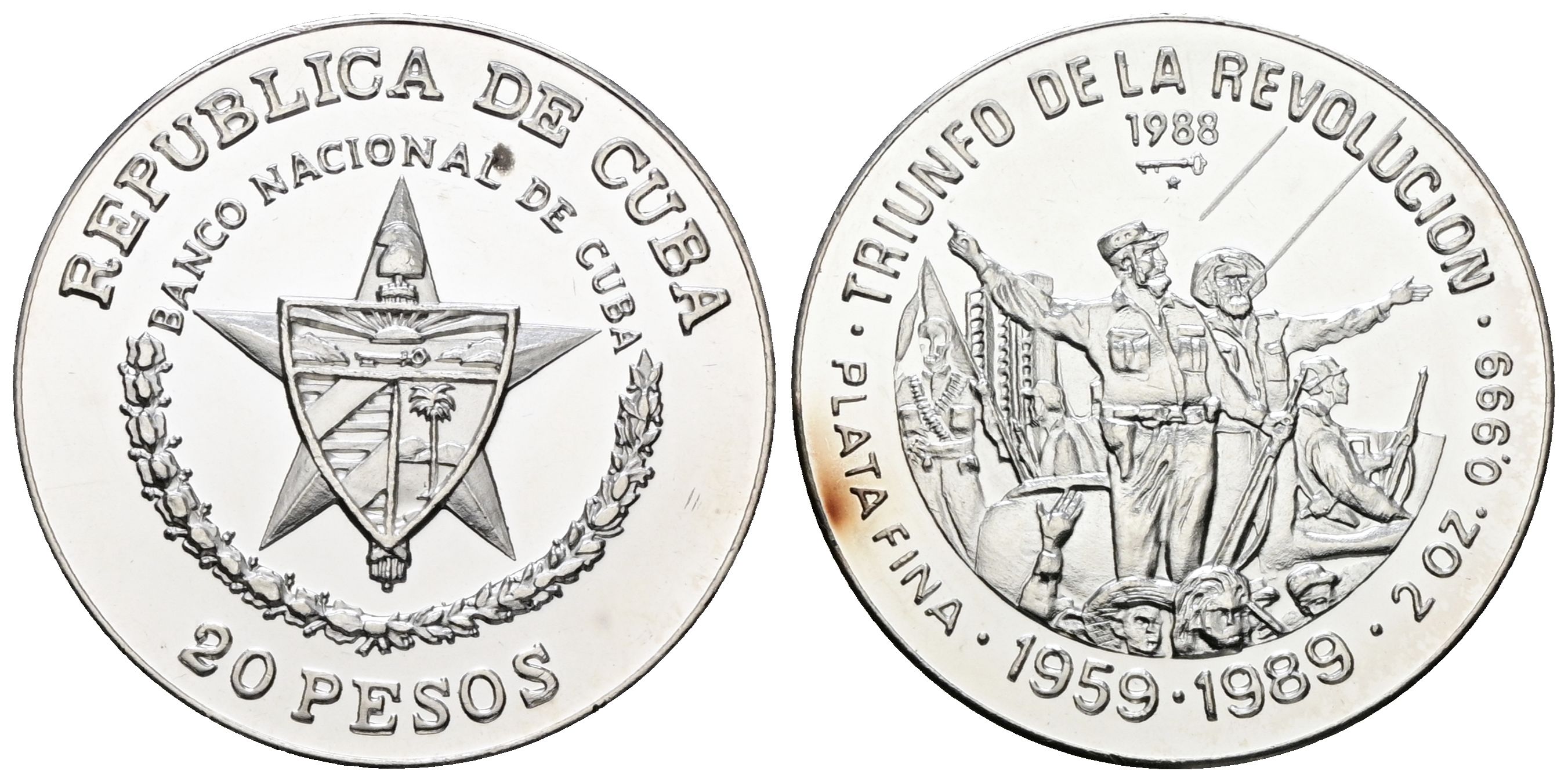 CUBA. 20 Pesos. (Ar. 62,09g/45mm). 1989. 30º Aniversario del Triunfo de la Revolución. (Km#169). PROOF. Rayas en reverso. Tirada de sólo 500 unidades.