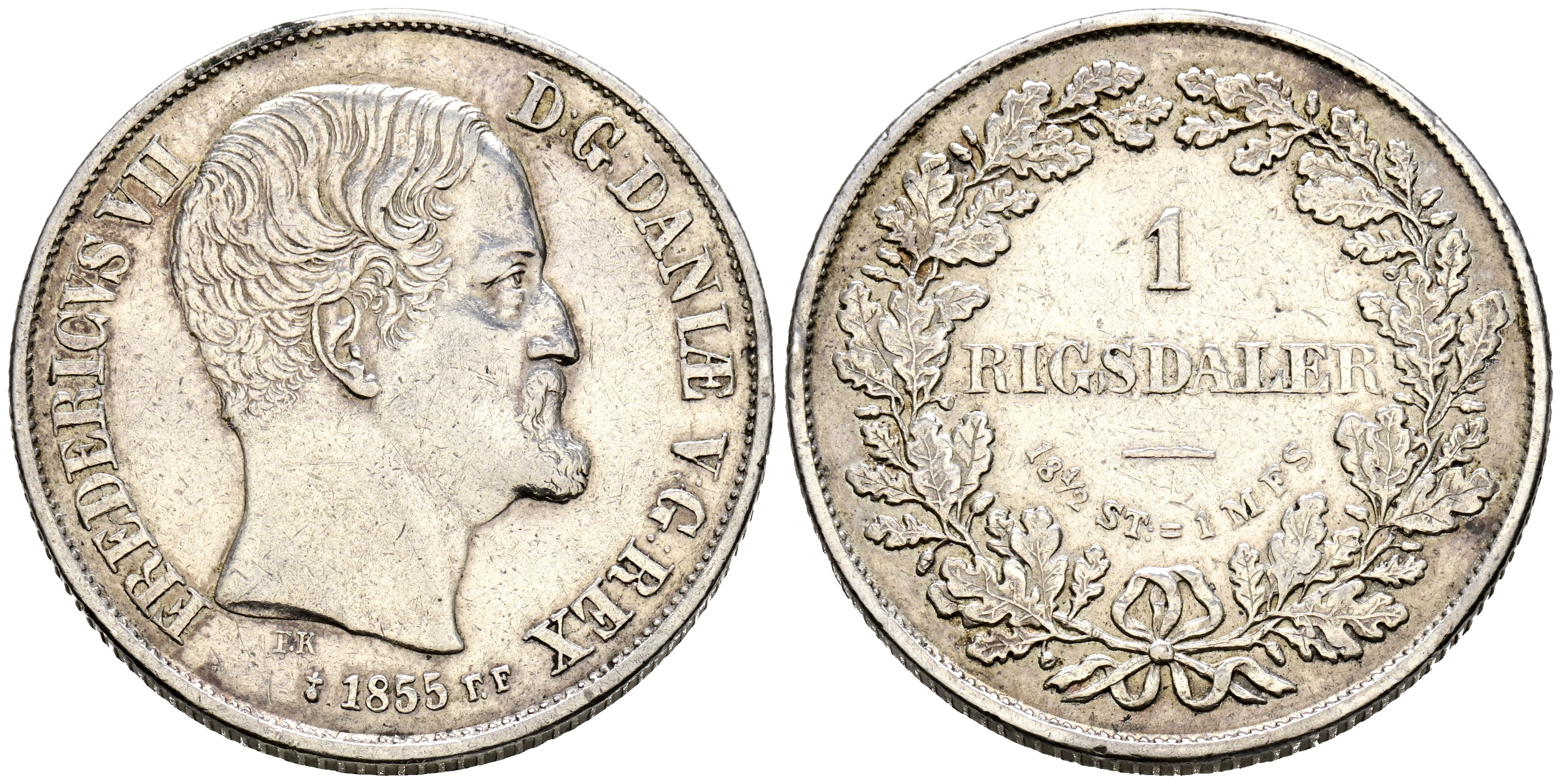 DINAMARCA, Federico VII. 1 Rigsdaler. (Ar. 14,40g/31mm). 1855. Marca de ceca: FF. (Km#760). MBC.