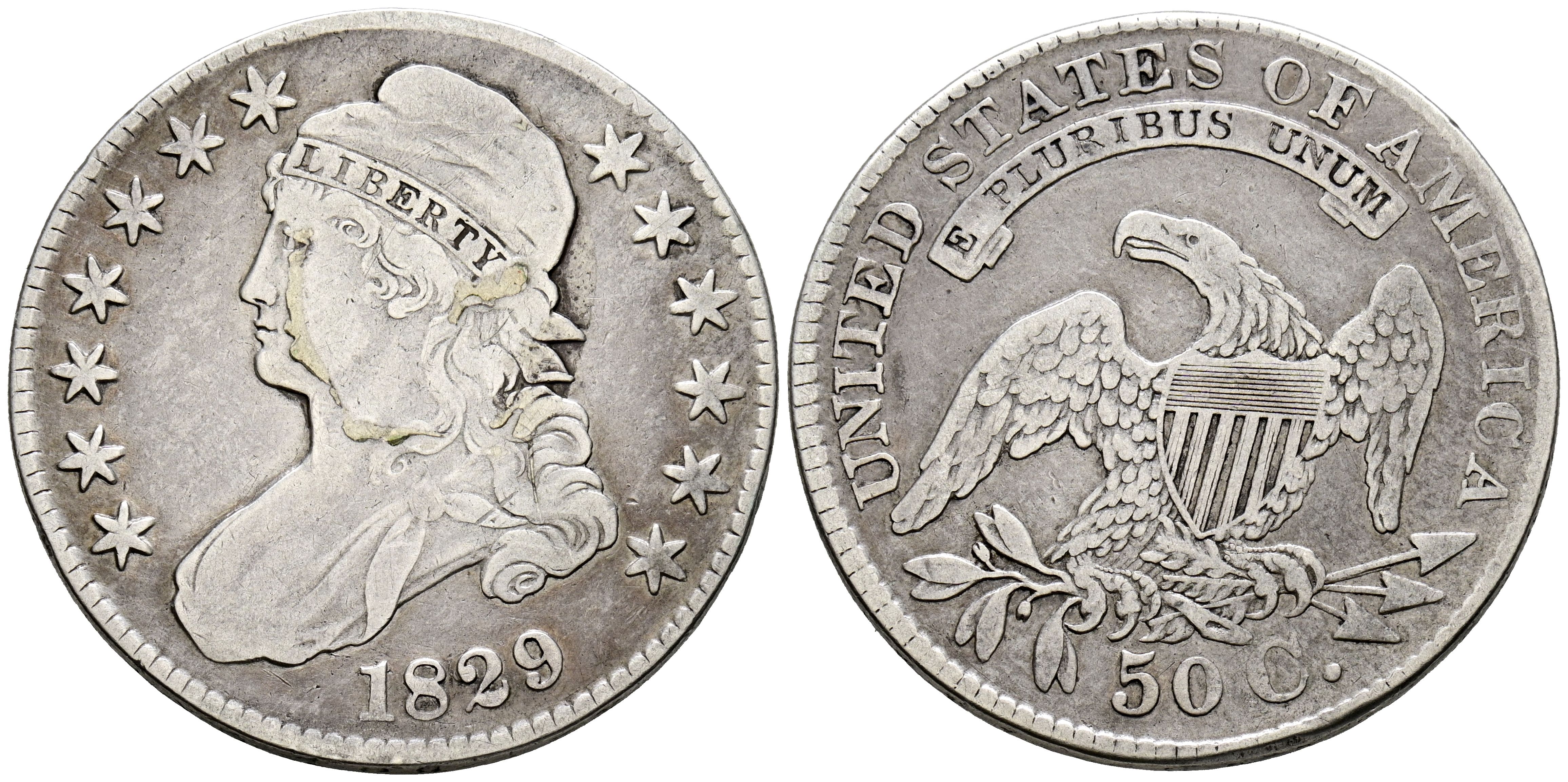 ESTADOS UNIDOS. 1/2 Dólar. (Ar. 13,16g/32mm). 1829. Philadelphia. (Km#37). MBC. Ligeramente alabeada. Escaso ejemplar.