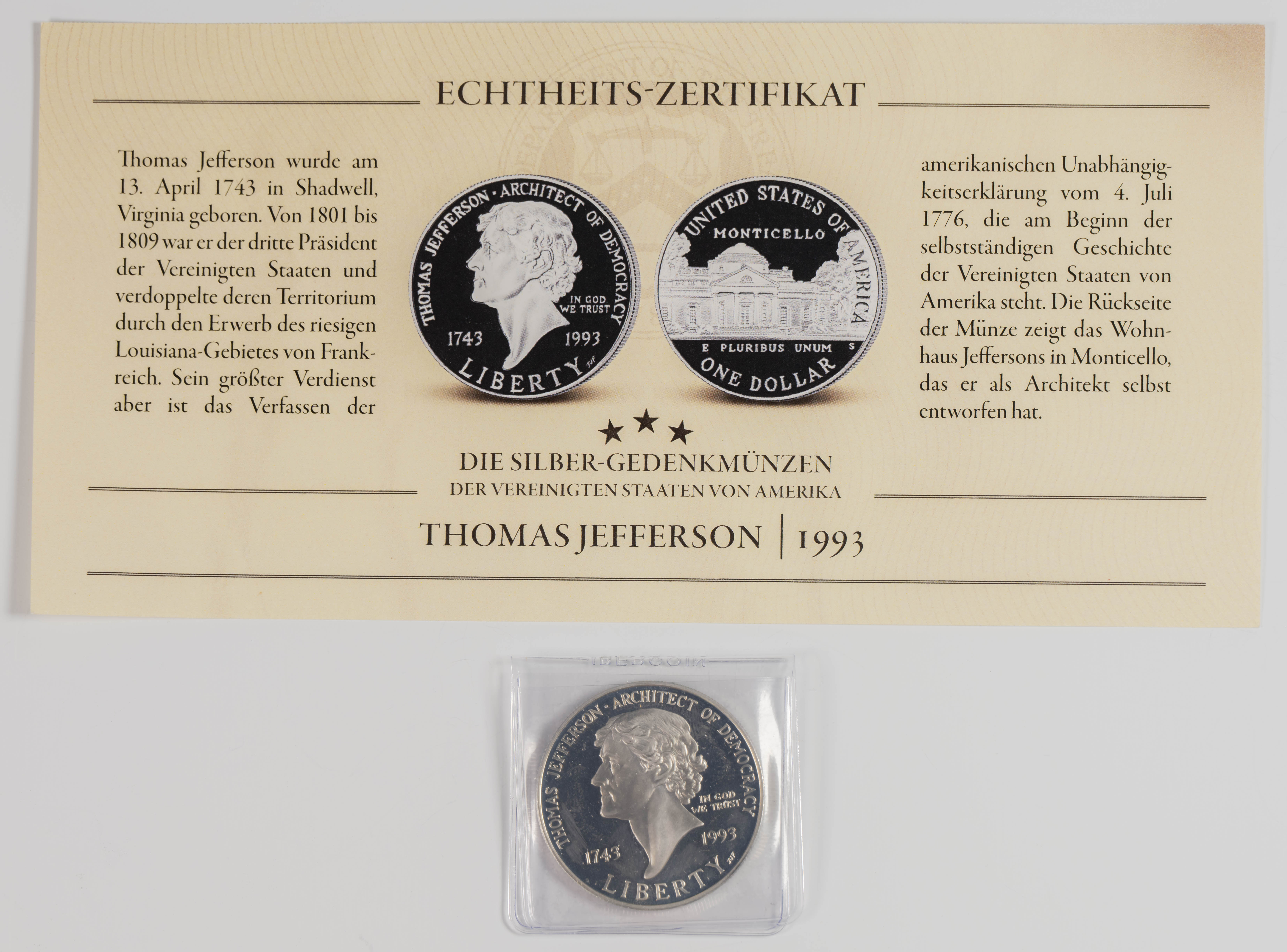 ESTADOS UNIDOS. 1 Dollar. (Ar. 26,54g/38mm). 1993. San Francisco S. 250 Aniversario del nacimiento de T. Jefferson. (Km#249). PROOF. Incluye certificado de autenticidad de la MDM alemana.
