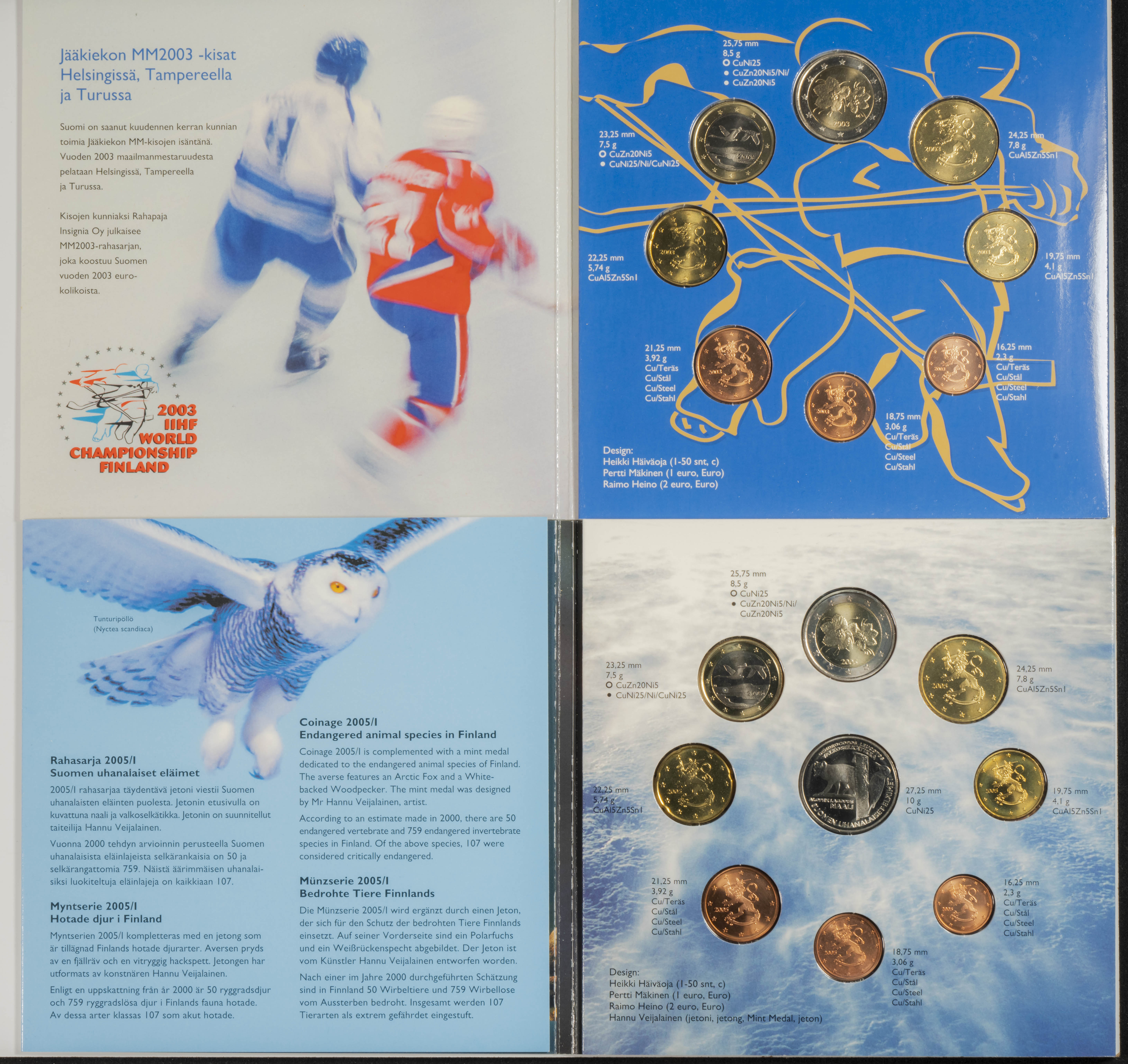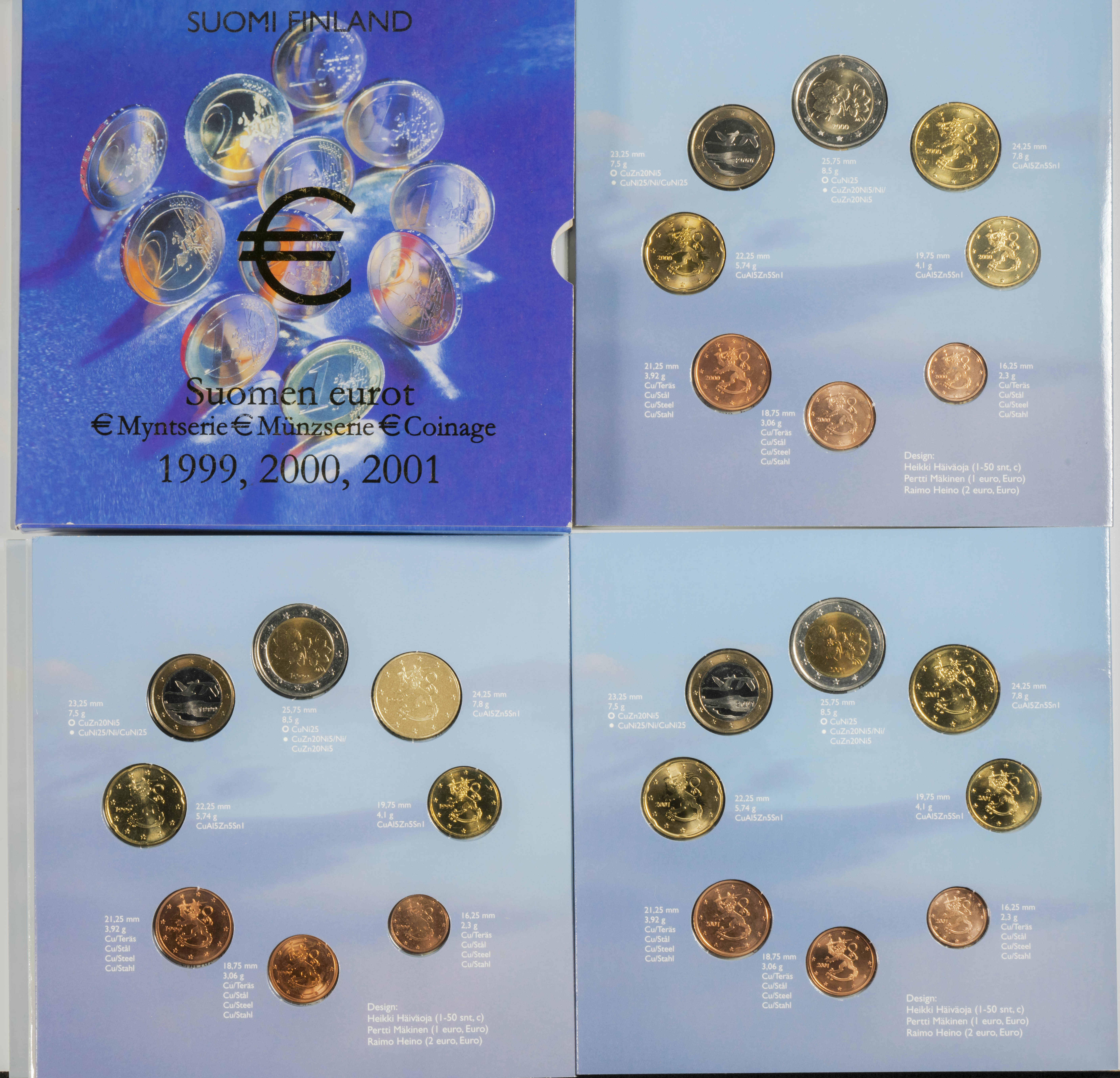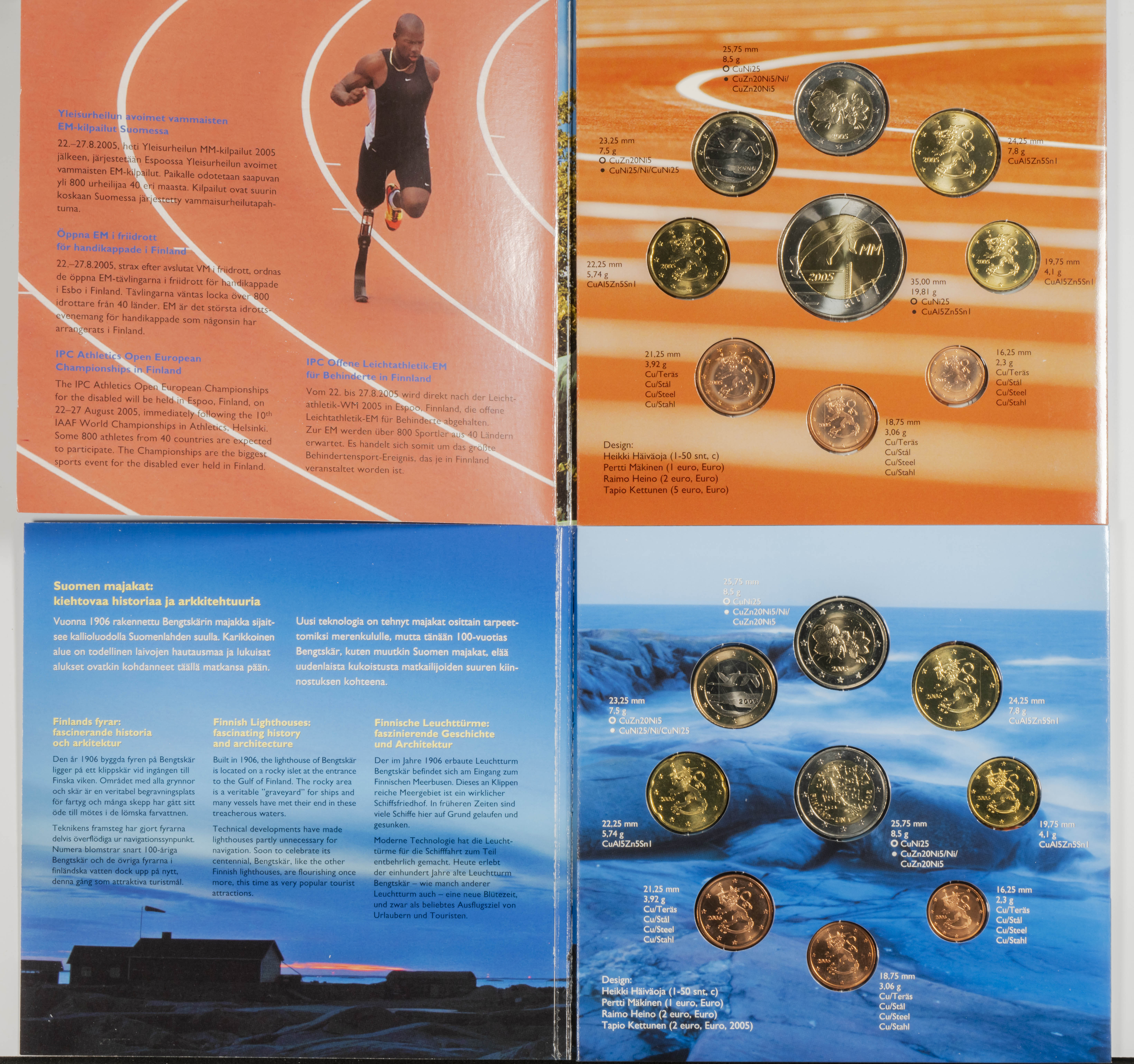 FINLANDIA. Conjunto de 16 sets completo y conmemorativos de euros con fechas comprendidas entre 1999 y 2008. Incluye un ejemplar en plata con valor facial de 10€ (Tove Jansson-2004). SC.