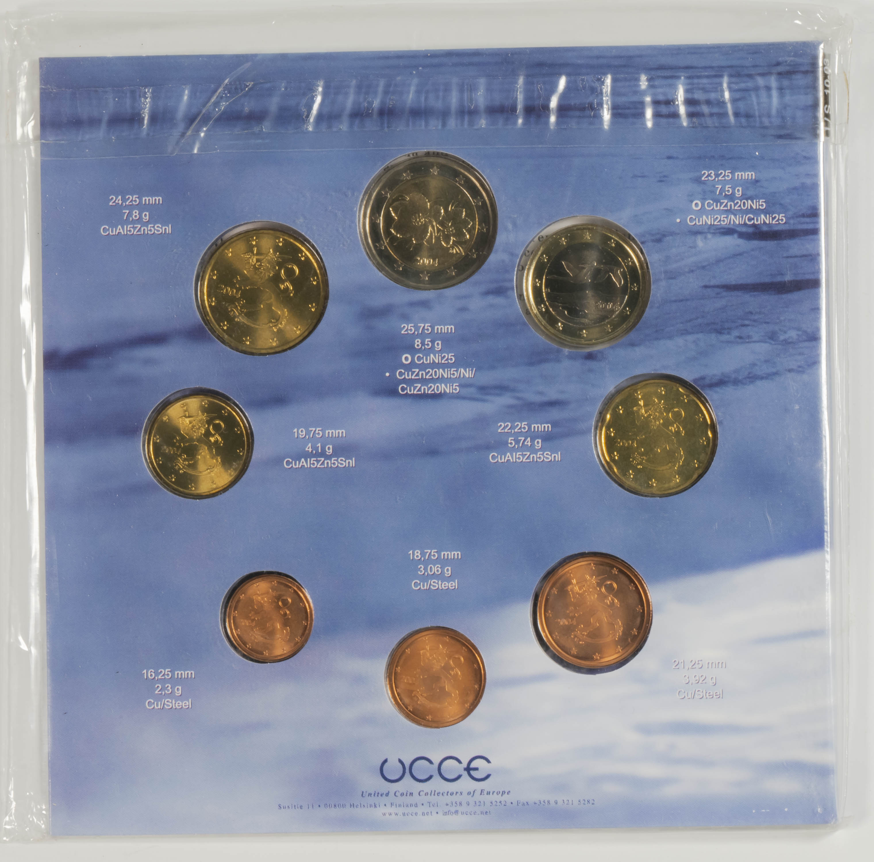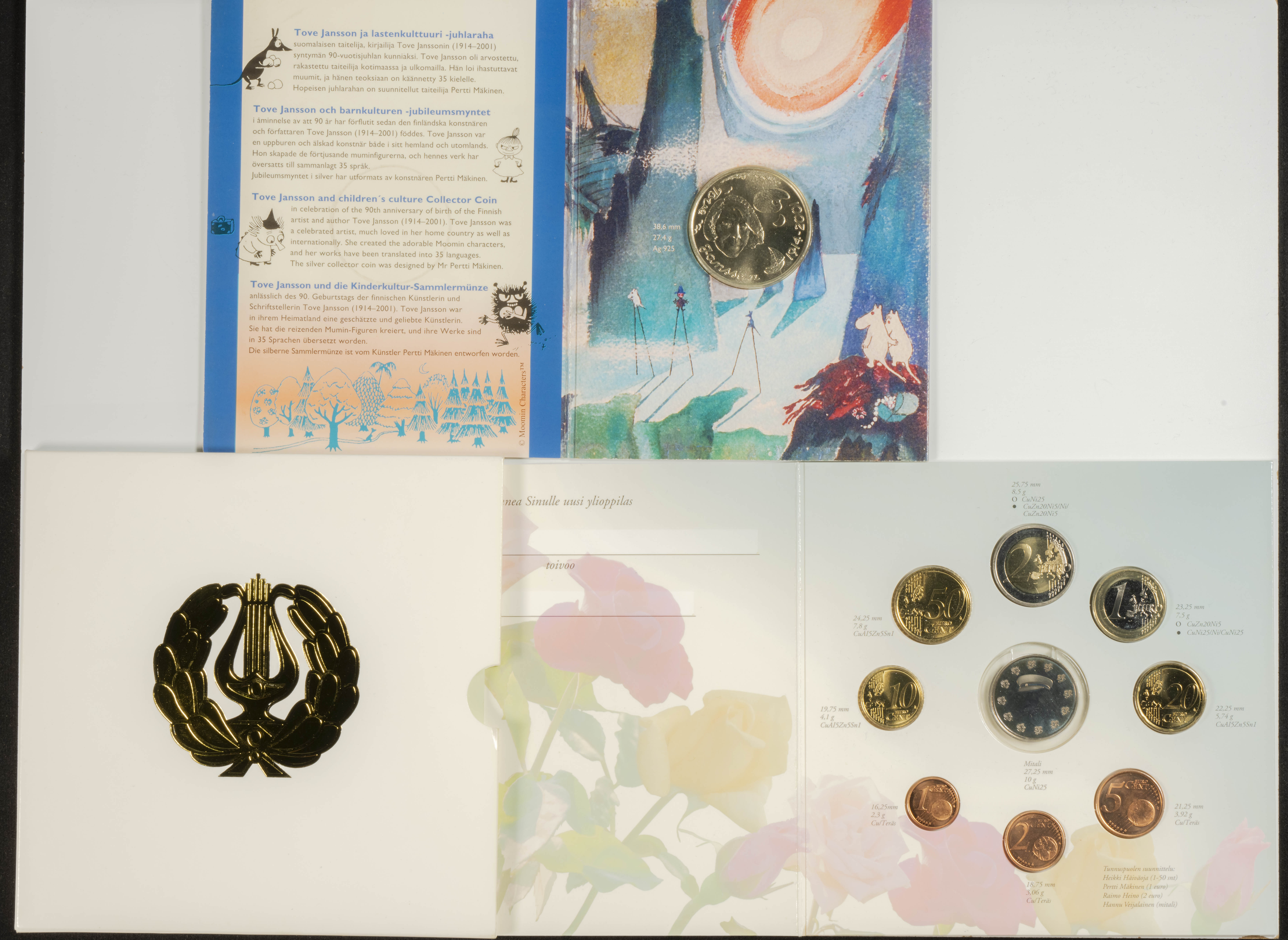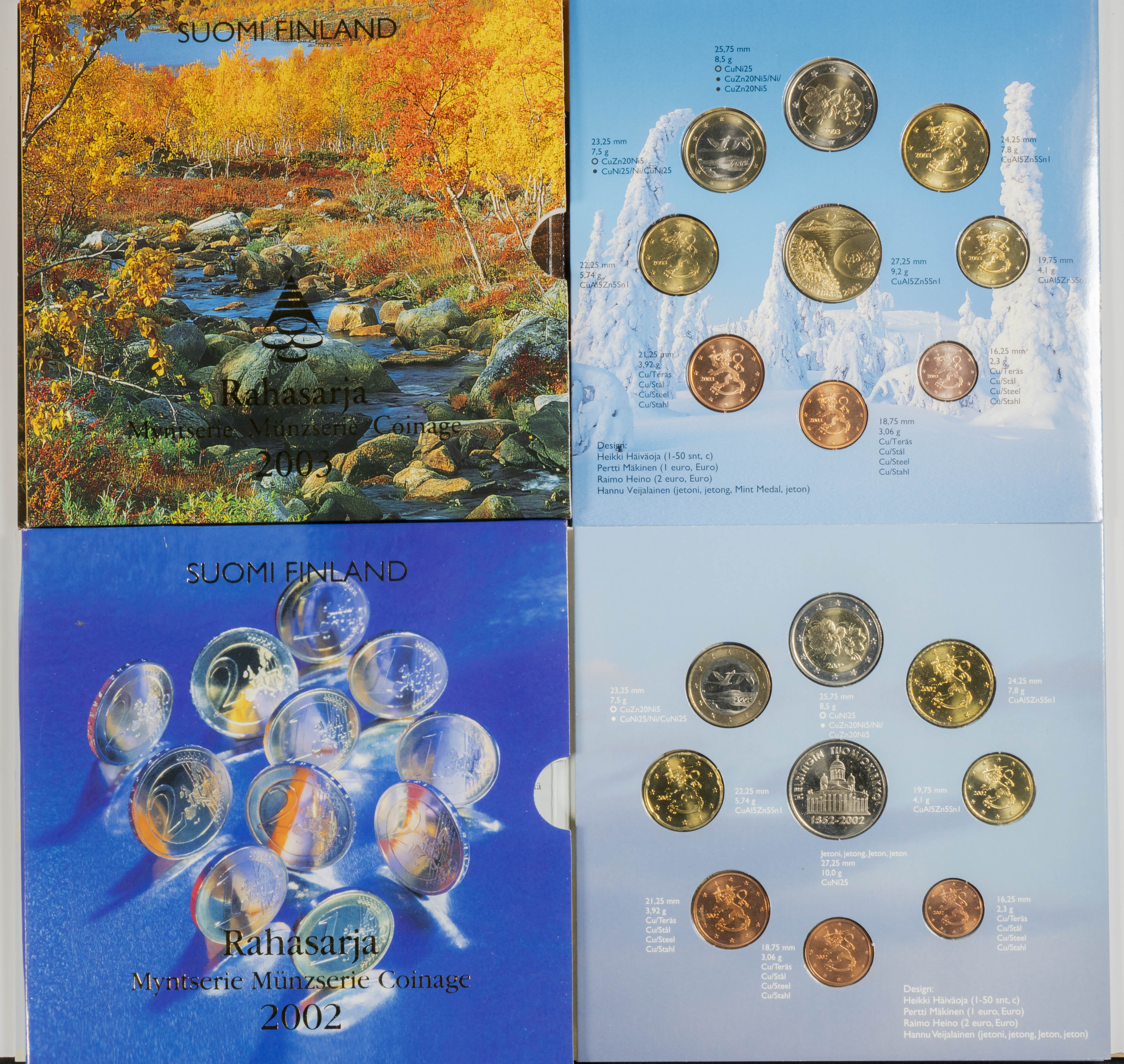 FINLANDIA. Conjunto de 16 sets completo y conmemorativos de euros con fechas comprendidas entre 1999 y 2008. Incluye un ejemplar en plata con valor facial de 10€ (Tove Jansson-2004). SC.