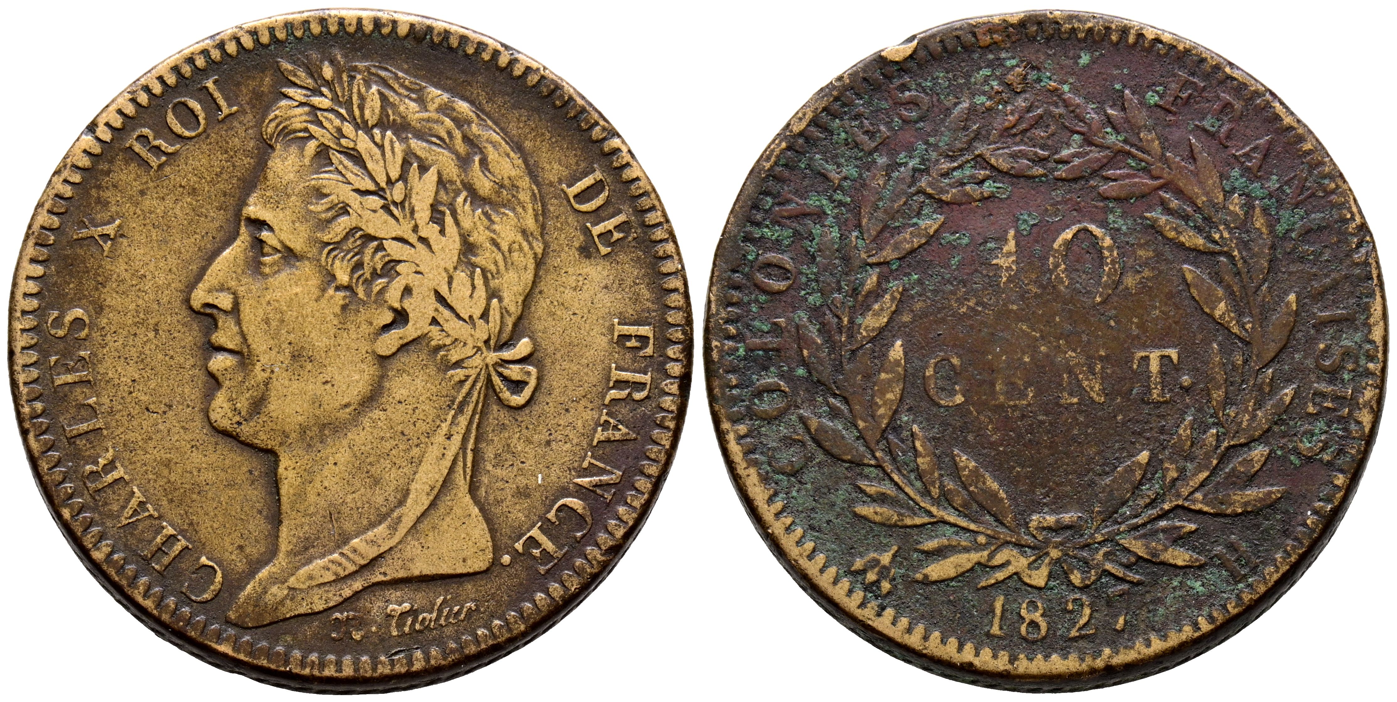 FRANCIA, Carlos X. 10 Cent. (Ae. 19,59g/31mm). 1827. La Rochelle H. Colonias Francesas. (Km#11.a). MBC/BC+.